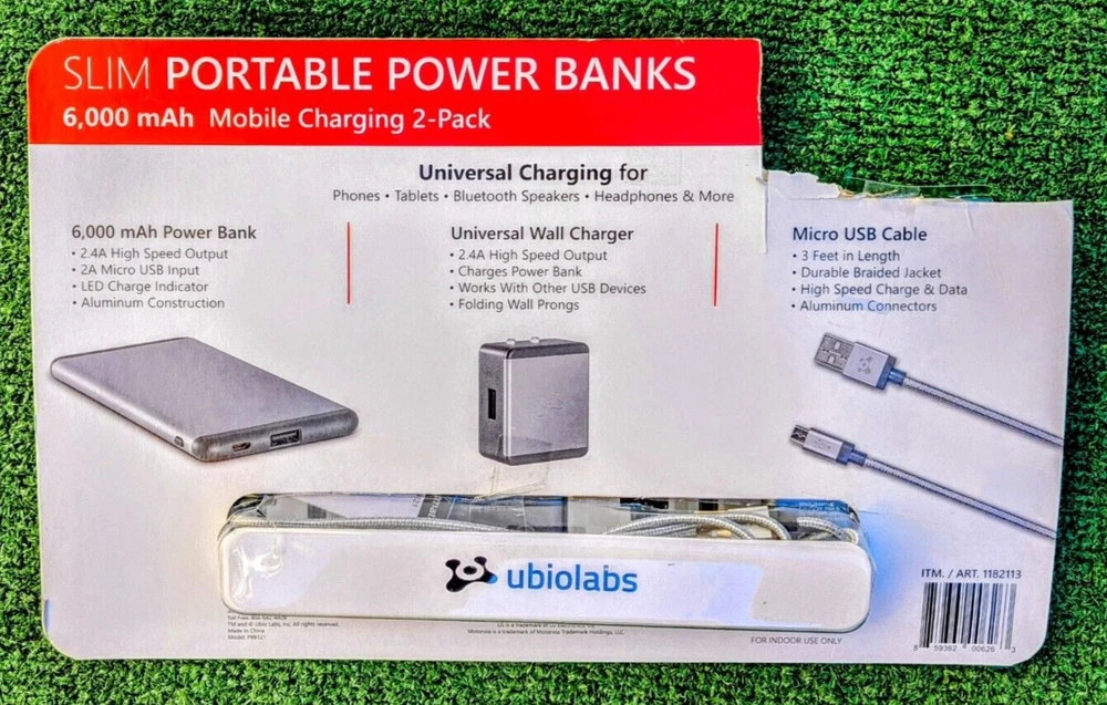 OPENED Package includes two 4Amp Wall Chargers, two 6000mAh portable batteries, & two 3foot USB Cables. One 6,000 mAh Portable battery has been charged and tested in full working condition with the two 3ft. micro USB cables. Portable on-the-go Fast charging for your mobile devices. 2 Pack Bundle. Provides Up to 2 ½ Full charges for most devices. Includes 2 sets of 6000 mAh Powerbank, Universal Wall Charger and 3ft Micro USB braided cable. Charges phone from Apple, Samsung, LG, Motorola , and more 7LFN