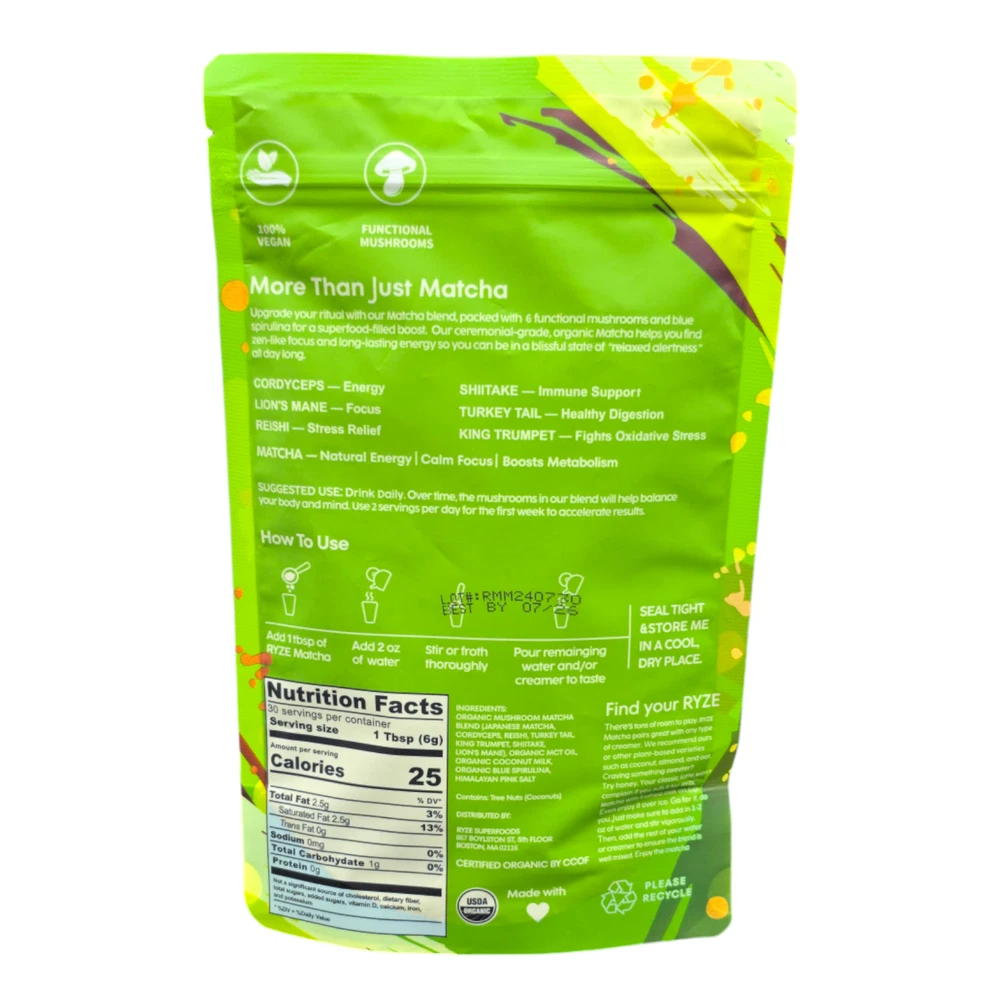 RYZE Organic Mushroom Matcha NEW 2024 30 Servings-6.35 Oz Ryze Organic Mushroom Matcha offers a unique blend of premium matcha green tea and organic mushrooms, providing a natural boost to your day. This harmonious combination delivers a rich, earthy flavor while supporting your overall health and well-being. Key Features: Organic Ingredients: Crafted with 100% organic matcha and a blend of functional mushrooms, including Lion's Mane, Cordyceps, and Reishi. Product Information and Disclaimer Measurement Tolerance: Please note that there may be a slight variation in weight (2-5g) due to manual measurement. This is within the acceptable range and does not affect the product's quality or performance. Color Variation: Due to differences in monitor settings and calibration, the product's color may appear slightly different on your screen compared to the actual item. SKU Color: The SKU color refers to the color of the product packaging, not necessarily the color of the product itself. We appreciate your understanding.