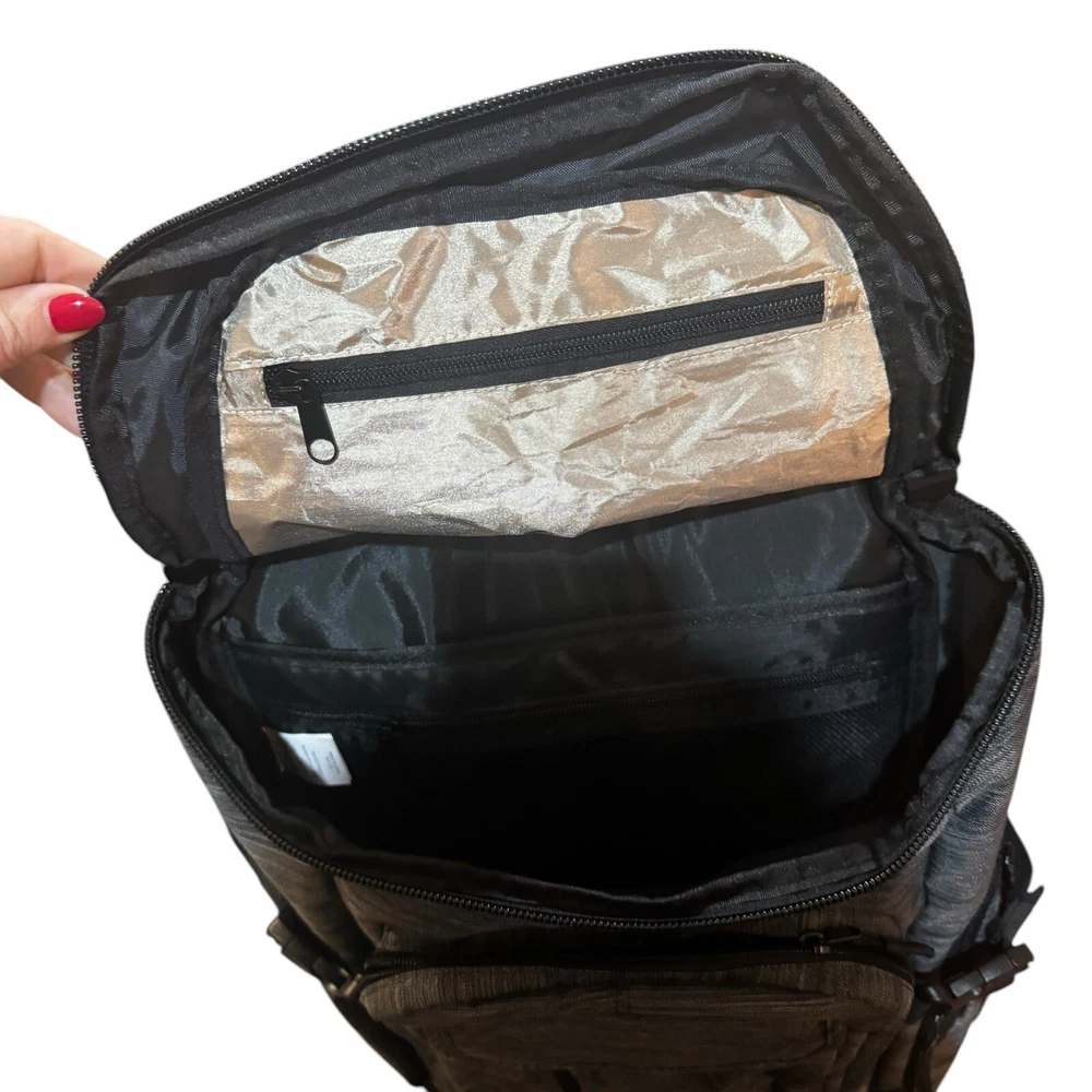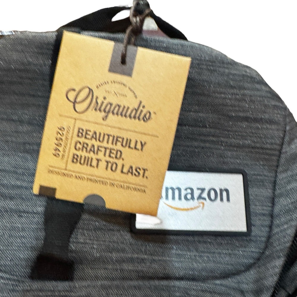 NWT ORIGAUDIO Mission Pack Laptop Backpack Tech Work Bag Cooler Amazon Logo New with tags - never used. Has a brushed aluminum AMAZON logo plate attached to top flap. Large front pocket is insulted like a lunchbox cooler.