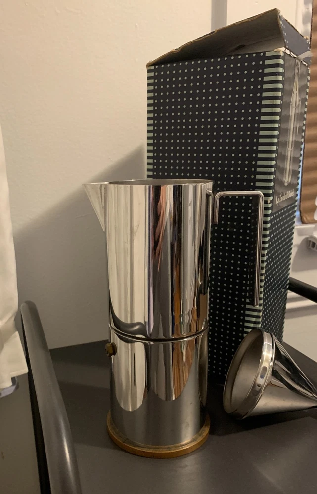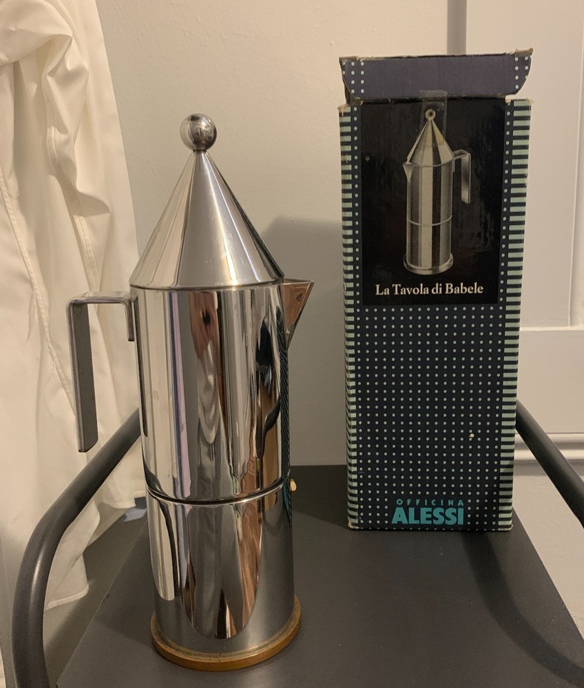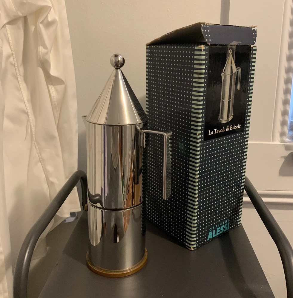 ORIGINAL Alessi La Conica by Aldo Rossi, Italian Stainless Steel Espresso Maker Designed in 1983 by legendary Italian architect Aldo Rossi and manufactured in 1984, this art piece and coffee maker is exceedingly rare and with few surviving examples - especially not with the original box, never used. A few are in museums in varying condition, and a smaller version is being sold from Japan; you'd be hard-pressed to find another from this era! A perfect example of postmodernism object design, utilizing simple geometric shapes and the beauty of polished metal to create a coffee maker that compels the eye to look at it. The body is 18/10 stainless steel, and the bottom plate is copper for even heat conduction on the stovetop - an entirely different league from Moka pots. Brews 6 cups of "espresso" (being that this method probably does not generate enough pressure), compared to other smaller models. Hailing from the "experimental and artistic" sub-brand of Alessi (Officina de Alessi) and the product line "La Tavola di Babele" for stainless steel kitchen tools designed by Aldo Rossi, this artifact of interior design set the tone for the later models of Alessi coffee makers; La Conica espresso makers are still sold today at this same price point, but this model is of the original release. A perfect gift for another architect, or anyone with an eye for design. Function and beauty. Note the box has a bit of damage from over the years, from where the tip of the coffee maker and the handle poked against the cardboard. However, there is not a scratch or dent on the item itself. More photos on request, but I prefer to handle it minimally. I'm uncertain if the original papers are inside, as I did not want to poke around in it and misplace the nice interior packing. Dimensions: Roughly 3.5" x 5" x 11" Please see all images, what you see is what you purchase! Please reach out to me before you leave any negative feedback. Any major flaws, if any, will be noted in the photos. I've included most points of authentication, and can take more photos on request. ALL SALES FINAL Please carefully review your order before confirming your purchase.