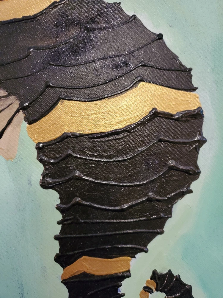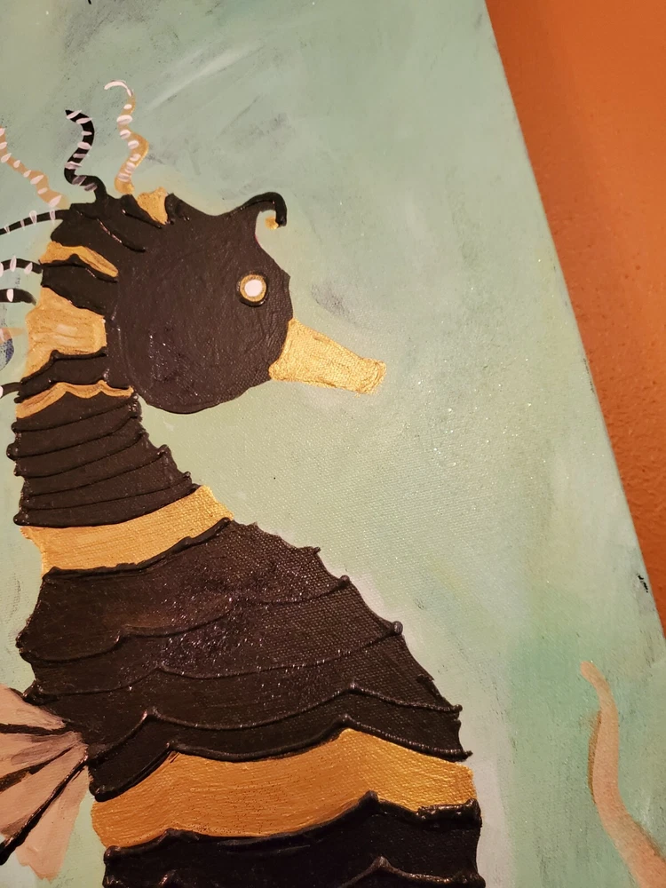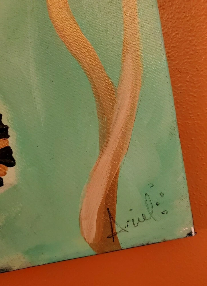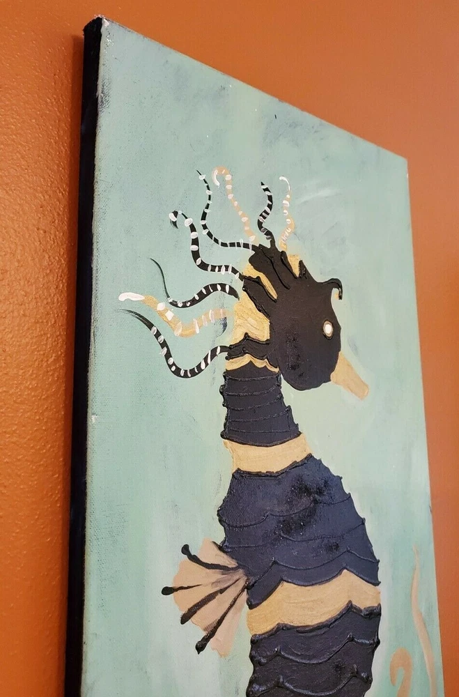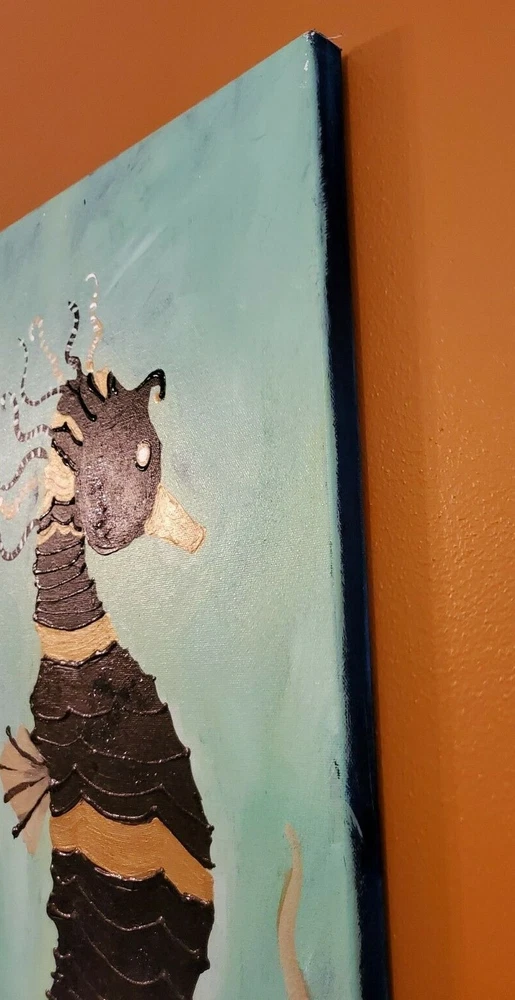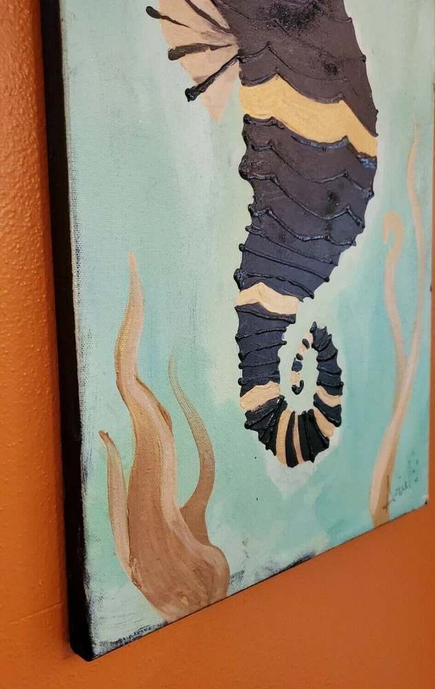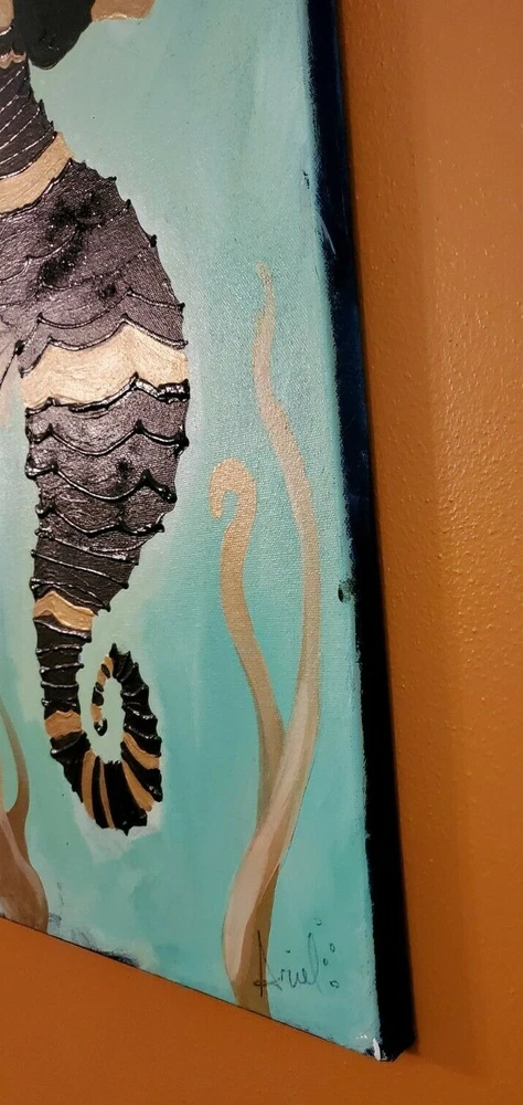 ORIGINAL Bathroom or Kids Bed Room Seahorse Wall Art Painting SIGNED by Ariel I not sure if the artist was just being cute by signing the painting Ariel with fish bubbles in this underwater portrait. I believe that it was a take on The Little Mermaid movie by Disney. It may have been painted by an Art Student. The seahorse has raised paint. To me it looks like a mix of Acrylic and Oil but I'm just guessing. She also added glitter adding to the look. The sides are intentionally painted haphazardly in midnight blue. It measures 12" x 24". Thanks for looking. (Wicker Chest)