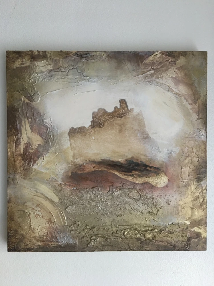 Series Poetic Statement: Portal of Peace. 24" x 24" Eco-Friendly Textured Oil, Acrylic, Metallic Champagne, Brass, Gold and Bronze Statement Painting. Portal X by Michele is a One-of-a-Kind Contemporary Textured Metallic Artwork using only Organic Art Mediums healthy for our homes, offices, and earth. (3) 4 mm Swarovski strategically embedded for additional subtle sparkle effect. Series Inspiration: Initially from beach portal on Treasure Island Beach behind The Montage Laguna while painting en plein air, and then further inspiration from my observations of other nature portals in desert and mountain regions. Eco-Friendly Crushed Stone from Italy with international recyclable mediums are layered under the Oil and metallic pigments of champagne & rust. Heat is applied before glazing. Painting sides are 1.75" archival wood with textured edges to match front; requiring no frame. Eco-friendly Archival Matte Clear Glaze completes this unique one-of-a-kind original artwork. Michele's original paintings are featured in fine art galleries, private and corporate art collections, movie sets, TV shows/commercials, and book covers. Colors: Neutrals of Cream, Champagne (Silver-Gold), Gold, Brass, Bronze, Beige, Taupe, White, Off-White, Amber Brown, Brown. {Yellow Undertones} Signature: Signed bottom right & reverse before shipping. * Set of (2) 24 x 24 {Portal IX and X} pieces currently available if complimentary companions statement pieces are needed for adjacent walls, or horizontal or vertical wall effect. Current Lowest Gallery Retail = $ 2000.00 More Artist Info: www MicheleMorata dot com