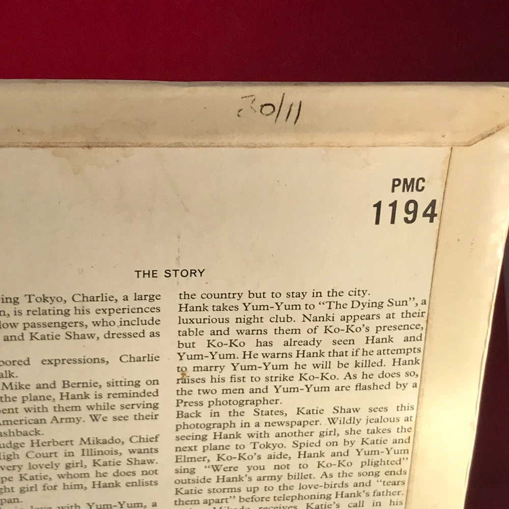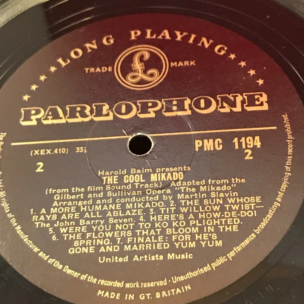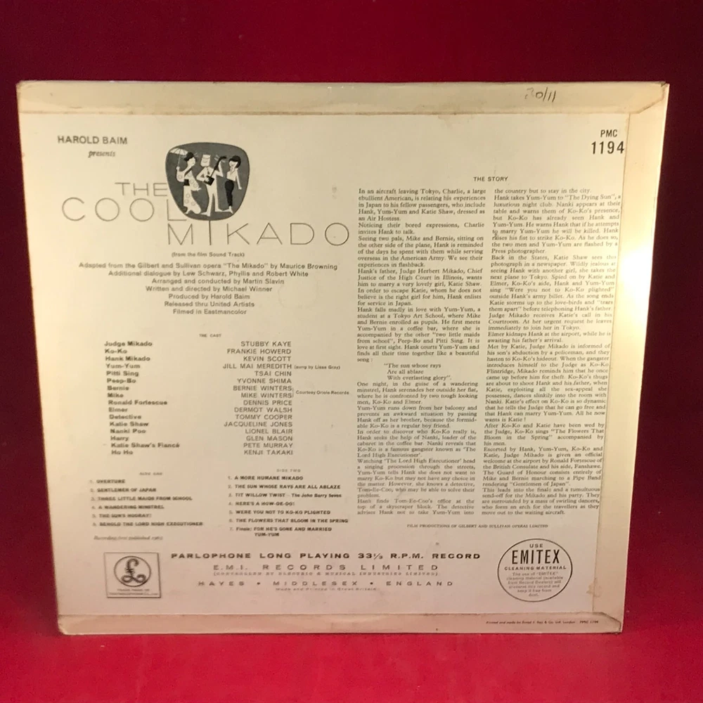 ORIGINAL SOUNDTRACK The Cool Mikado - 1963 UK mono vinyl LP, featuring music taken from the soundtrack of the film starring Stubby Kaye & Frankie Howerd. In a front laminated flipback picture sleeve. PMC1194 01. Cool Mikado Overture 02. Gentlemen Of Japan 03. Three Little Maids From School 04. A Wandering Minstrel 05. The Sun's Hooray 06. Behold The Lord High Executioner 07. A More Humane Mikado 08. The Sun Whos Rays Are All Ablaze 09. Tit Willow Twist 10. Here's A How-De-Do! 11. Were You Not Too Koko Plighted 12. The Flowers That Bloom In The Spring 13. Finale - For He's Gone And Married Yum-Yum Record Condition : Excellent Sleeve : Minor shelfwear (see photo) Please check out our other items