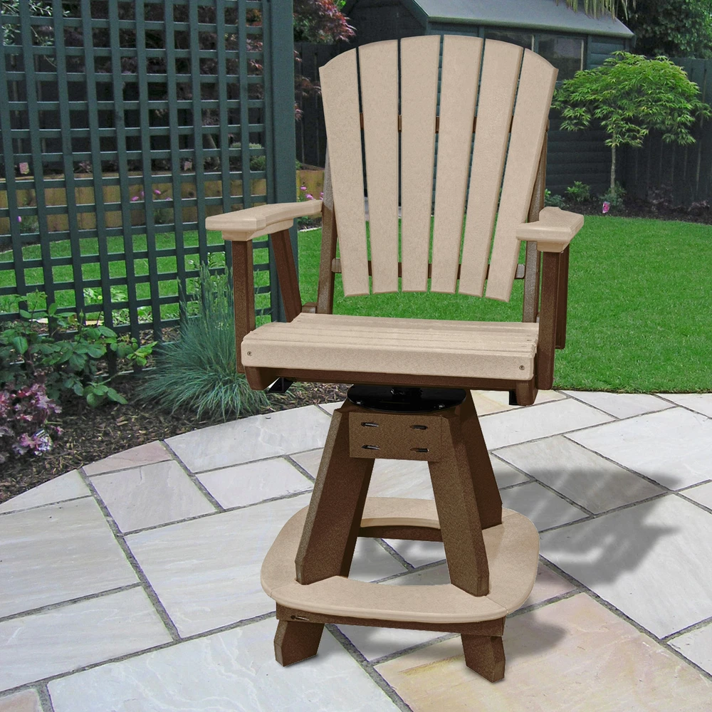 Our OS Home and Office Model Counter Height Swivel Arm Chair is sure to bring lasting enjoyment to your outdoor or patio space. Made with high-density recycled poly resin, it's resistant to UV fading, mildew, and water, and is built to last. Featuring a Weatherwood colored seat and back on a Tudor Brown base, this chair is proudly crafted by the Amish in the USA with stainless steel hardware and a US-made swivel mechanism. Enjoy years of use with this stylish and durable chair.Features: Weatherwood Seat & Back Tudor Brown Base UV Fading Resistant Mildew Resistant Water Resistant High-Density Recycled Poly Resin Stainless Steel Hardware US-Made Swivel Mechanism Proudly Made by the AmishAdditional Details: Disclaimer: This furniture is for outdoor use only and should be brought Free Shipping Over $49.99* Details OS Home and Office Model Counter Height Swivel Arm Chair in Weatherwood on a Product Description: Our OS Home and Office Model Counter Height Swivel Arm Chair is sure to bring lasting enjoyment to your outdoor or patio space. Made with high-density recycled poly resin, it's resistant to UV fading, mildew, and water, and is built to last. Featuring a Weatherwood colored seat and back on a Tudor Brown base, this chair is proudly crafted by the Amish in the USA with stainless steel hardware and a US-made swivel mechanism. Enjoy years of use with this stylish and durable chair. Features: Weatherwood Seat & Back Tudor Brown Base UV Fading Resistant Mildew Resistant Water Resistant High-Density Recycled Poly Resin Stainless Steel Hardware US-Made Swivel Mechanism Proudly Made by the Amish Additional Details: DisclaimerThis furniture is for outdoor use only and should be brought in when not in use.