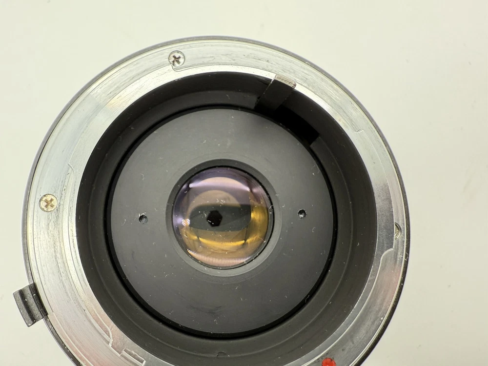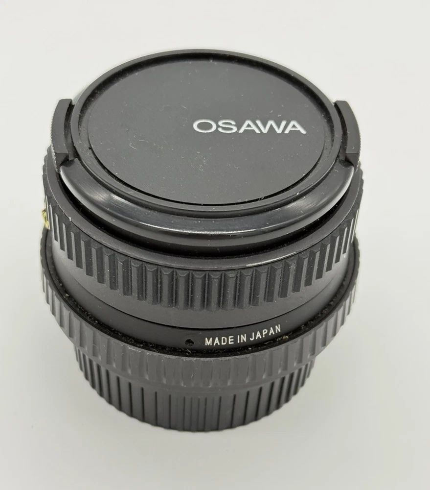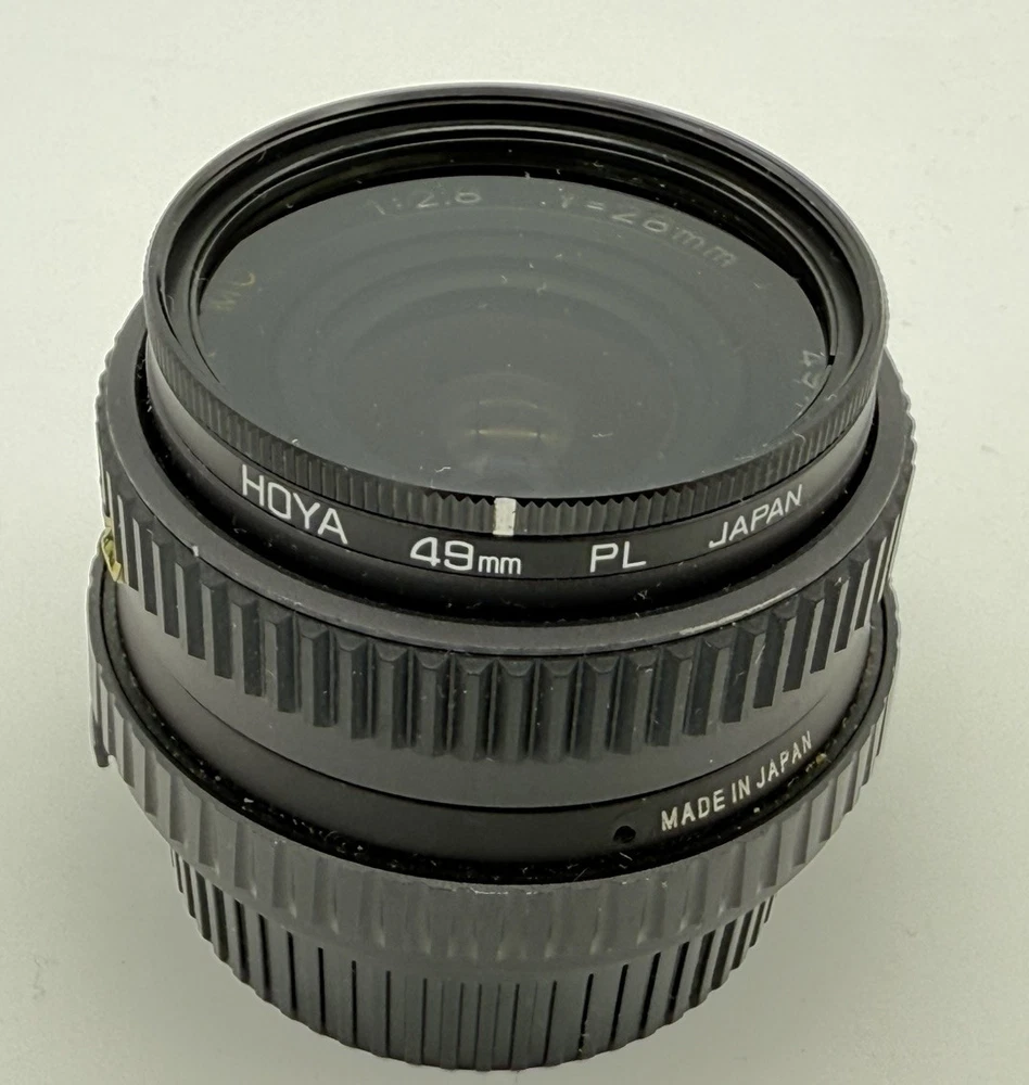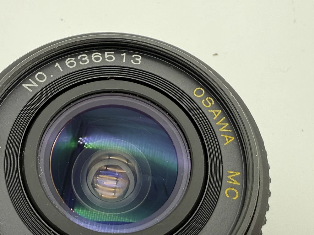 The product is an Osawa 28mm f/2.8 MC wide angle lens for Minolta cameras. It comes with a Hoya PL polarizer filter, has a manual focus type, and features an aluminum exterior. The lens has a M Mount and a focal length of 28mm. It is made in Japan and includes a 49mm compatible filter size. Comes with both lens caps. Lens appears clear with no blemishes. Aperture opens and closes as it should