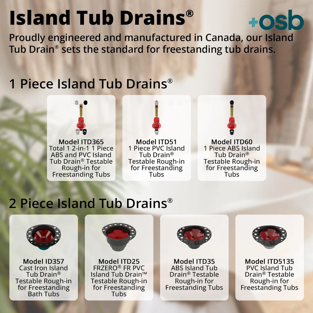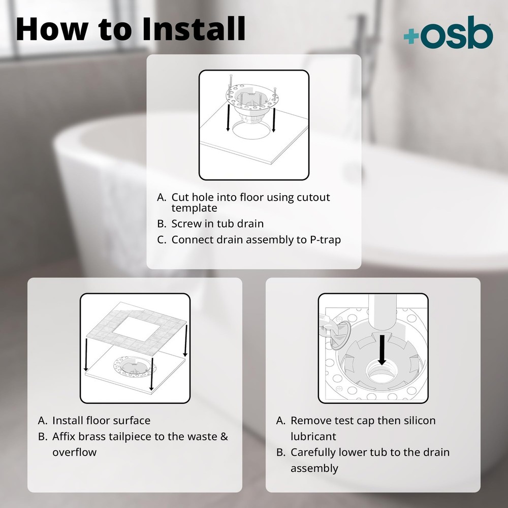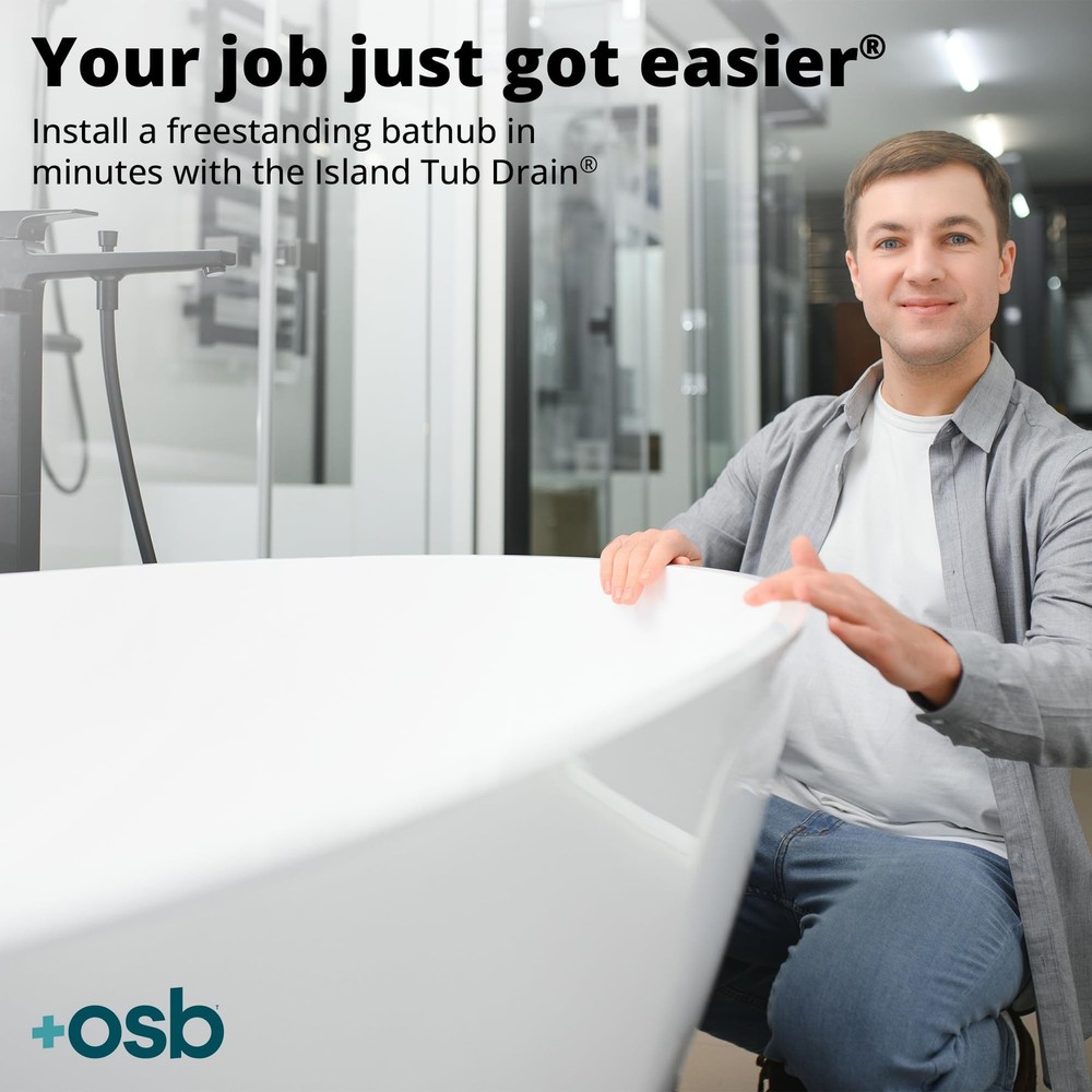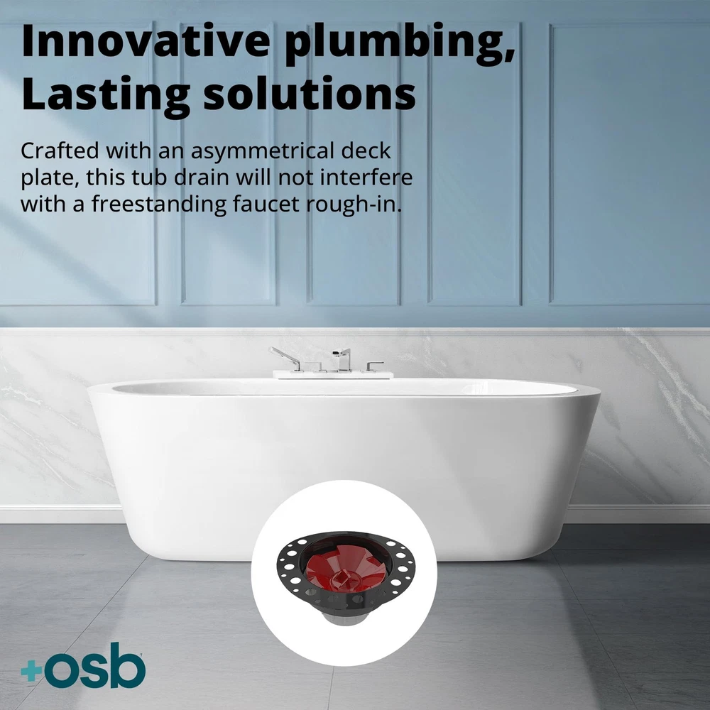 EASY INSTALLATION: Make bathroom remodels simpler with the Two Piece PVC Island Tub Drain Rough-in from OS&B. Supplied with all the necessary components to ensure seamless installation, it is the perfect combination of convenience and functionality. LOW-PROFILE DESIGN: Crafted with an asymmetrical deck plate, this tub drain kit will not interfere with a freestanding faucet rough-in. Easier installation in tight areas or small bathrooms: install in an 8"/10" joist space with a 1-1/2"/2" P-trap or slab on grade construction or wooden sub flooring. BUILT TO LAST: The tub drain kit features a PVC body for durability. Enabling the freestanding tub location to be defined at rough-in (install before tiling), it allows for tub fitting over a finished floor (access below the fixture is not needed). TESTABLE DESIGN: Built with a snap-off test cap (rated to 30 psi), it enables water, air, and smoke testing. The bathtub drain has a 2" DWV hub connection, while the epoxy-coated, 18-gauge metal deck flange features holes to lock in thinnest. FULL BATHTUB DRAIN KIT: This tub drain kit includes a flanged brass tailpiece, a PVC adapter kit (that helps attach to PVC bath wastes), a 2" x 1-1/2" PVC reducing bushing, a mortar/tile guard, an island drain assembly, and a cutting template for the rough-in.