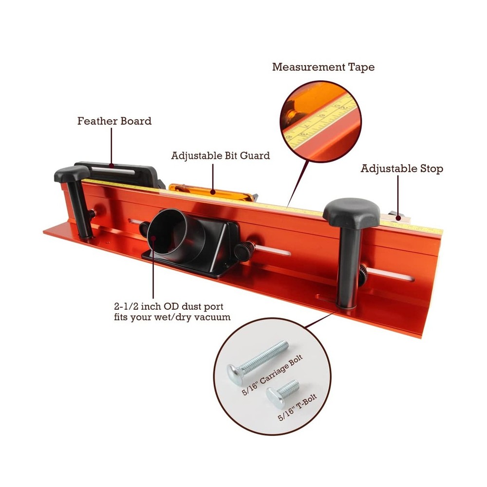 O'SKOOL 32 Inches Long Router Table Fence System with Feather Board, Bit Guard, Adjustable Stop and Dust Port Description Features: Includes: (1) 32-Inch Router Table Fence System , (1)Featherboard, (1) Adjustable Stop, (1) Bit Guard, (1)Dust Port and (1) Measure Tape. Our Router Table Fence System is easy to assemble and works with most models of router tables, or make your own router table. Made from high-quality aluminum alloy, with good wear resistance and durability. T tracks on the front, excellent for a variety of woodworking accessories (accepts 1/4" T bolts and hex bolts). The melamine MDF fence faces could adjust using 4 rear threaded knobs that slide open and close the router bit mouth. Bit guard protects fingers by shielding the cutter area. 2-1/2 inch OD and 2-1/4 inch ID Dust Collection port fits your wet/dry vacuum and keeps the work area clean. Product Details: Brand: O'SKOOL Material: Aluminum Item Weight: 4 Kilograms Package Dimensions: 33.2 x 6 x 5 inches Item Weight: 8.79 pounds Manufacturer: O'skool Item model number: RTS09 Delivery We Do Not Ship Outside of the Continental US. Return Policy All items qualify for returns within 30 days of receipt. Seller is responsible for return shipping on any item that is not damaged. Feedback We take our reputation seriously, we buy and sell online, so we understand the value of trust. If you are unsatisfied with your order, please contact us and we will work with you to resolve it to your satisfaction.