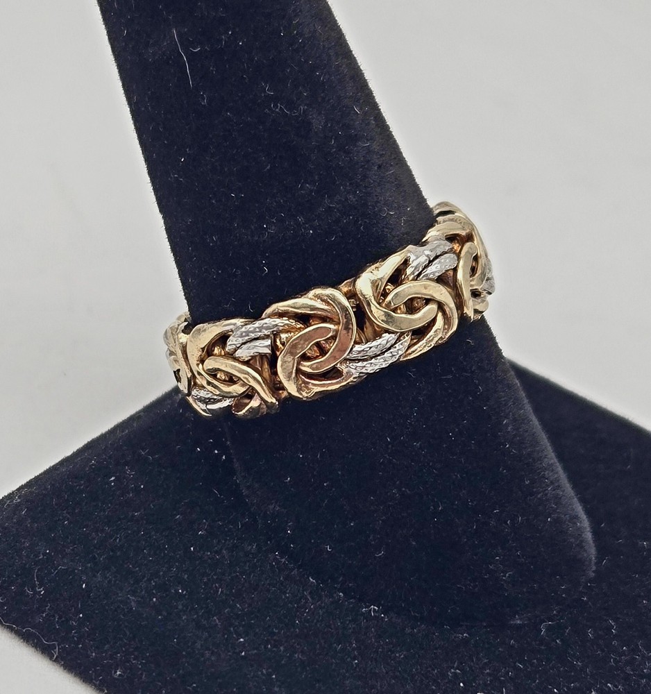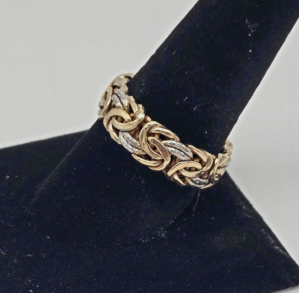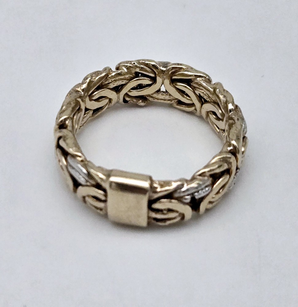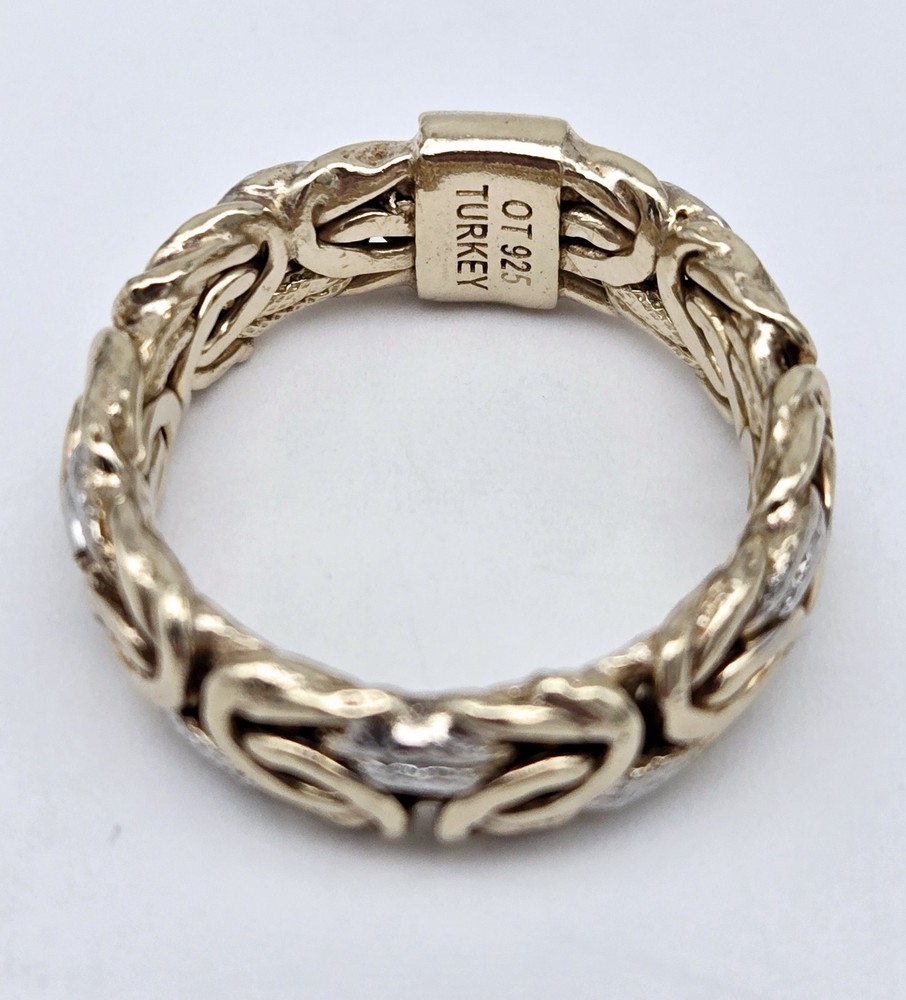 Handmade: Yes Main Stone: No Stone Metal: Sterling Silver & Gold Vermeil Style: Band, Byzantine Link Country of Origin: Turkey Brand: OT Turkey Sizable: No Color: Gold Ring Size: 5.5 Vintage: Yes Country/Region of Manufacture: Türkiye Type: Ring Band Width: 1/4 inch Metal Purity: 925
