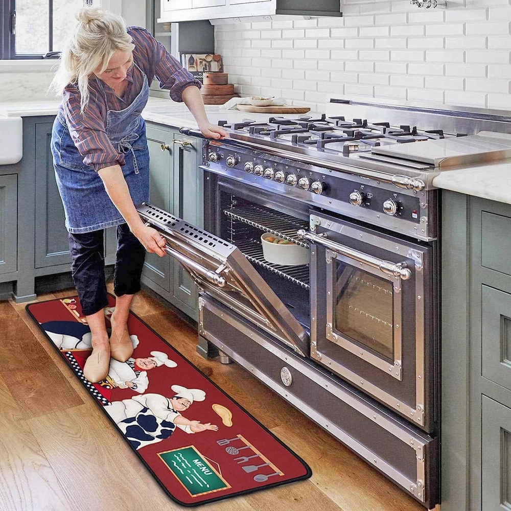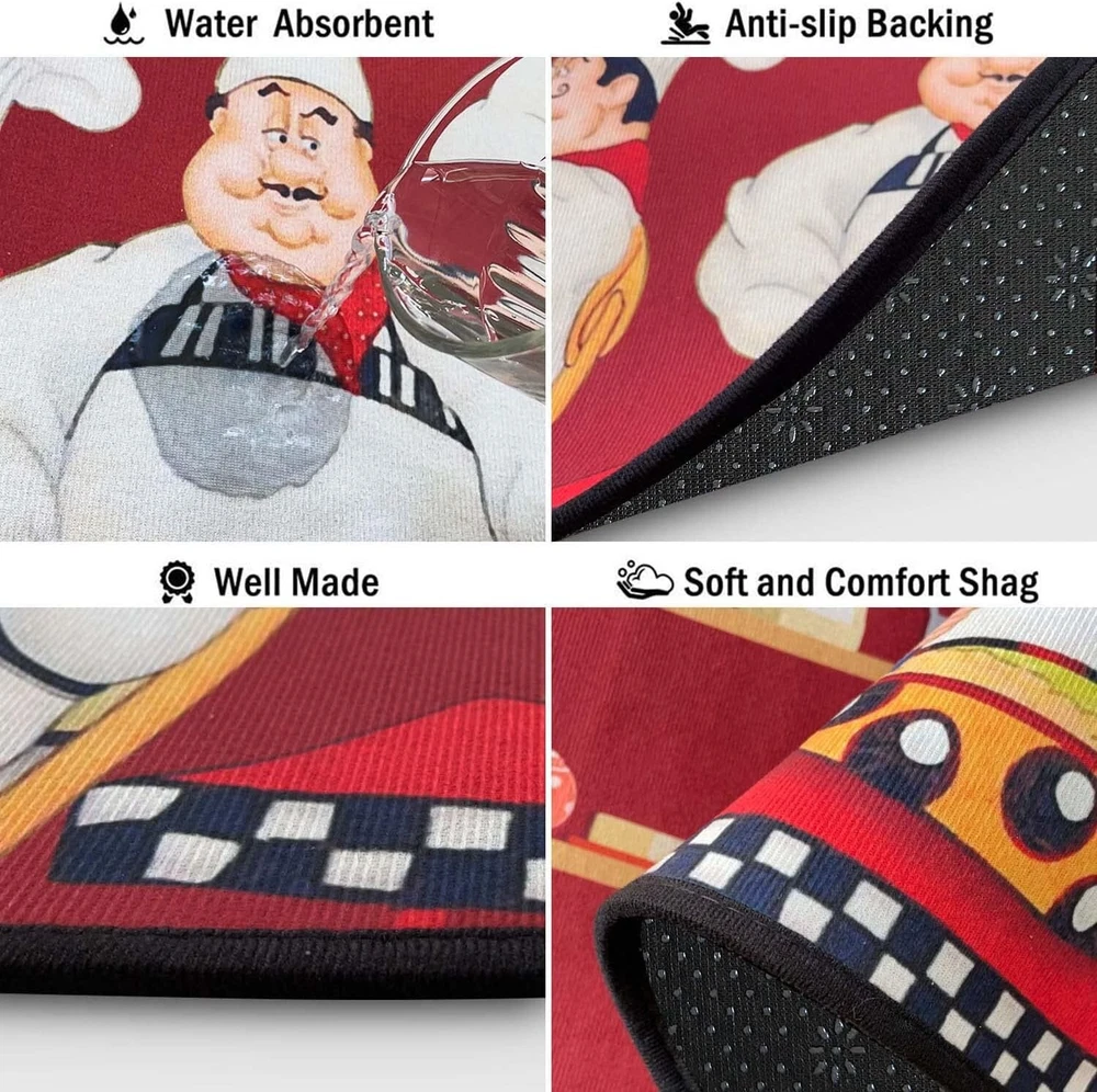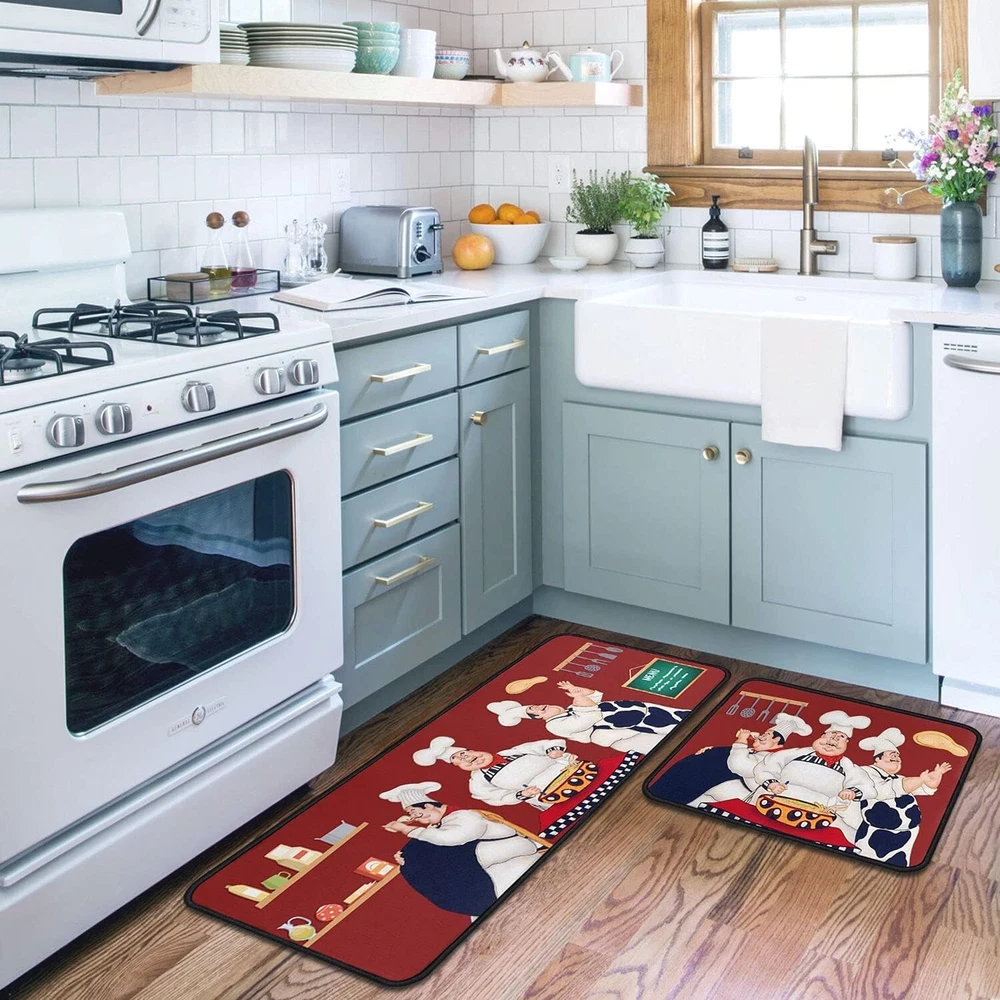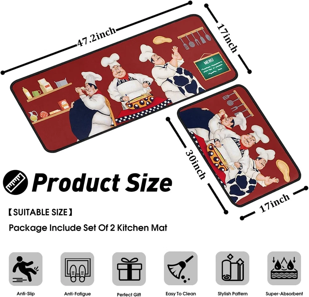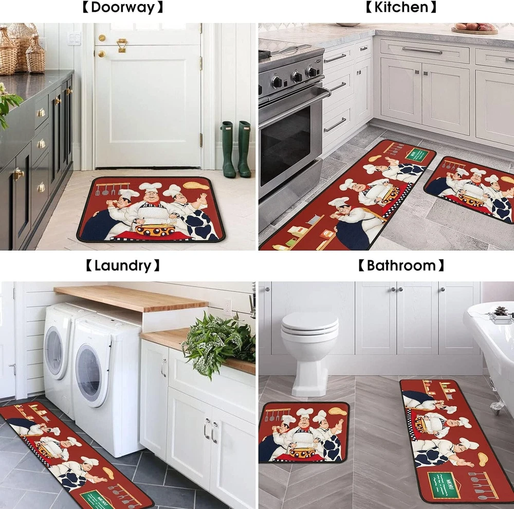 Perfect Size & Material - Kitchen Rug Set of 2,1 pcs kitchen runner rug 17"x47",1 pcs rectangular floor mat 17"x30";This rug mat set is not only suitable for indoor kitchen sink,living room,bathroom makeup counter,hallway,entryway,but also for outdoor patio,garden,terrace,garage,etc anywhere you want to place it. Cozy Standing Mats - The kitchen mat provide soft,Ideal for kitchen front of the stove,counter/bench space,hair salons,restaurants,offices,front desks,laundry etc other places where people have to stand for long periods of time. Stylish Kitchen Mat Set - The exquisite carpet set fit various styles of home decor,perfect for birthday,family party,theme party,anniversary,wedding,Halloween,Thanksgiving,Christmas,etc occasions while washing dishes or getting dinner ready decorate your holiday life Non-Slip Kitchen Rugs and Mats - Non-woven surface soft to stand on,no deformation,rubber polka dot backing,Water absorption non-slip walking safety,place on dry floor,Low profile design to be placed in any setting under doors well,not so thick and bulky that you would trip on it Machine Washable - Kitchen mats and rugs are easy care,use handheld vacuum cleaner to remove surface dust or use cold water machine wash for deep cleaning,no bleaching,no wringing,dry flat or dry at low temperature for best results.