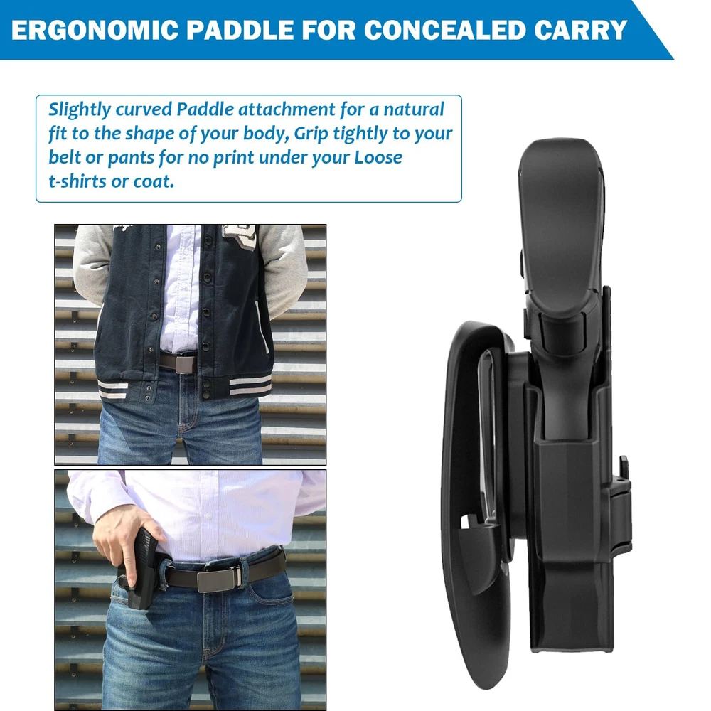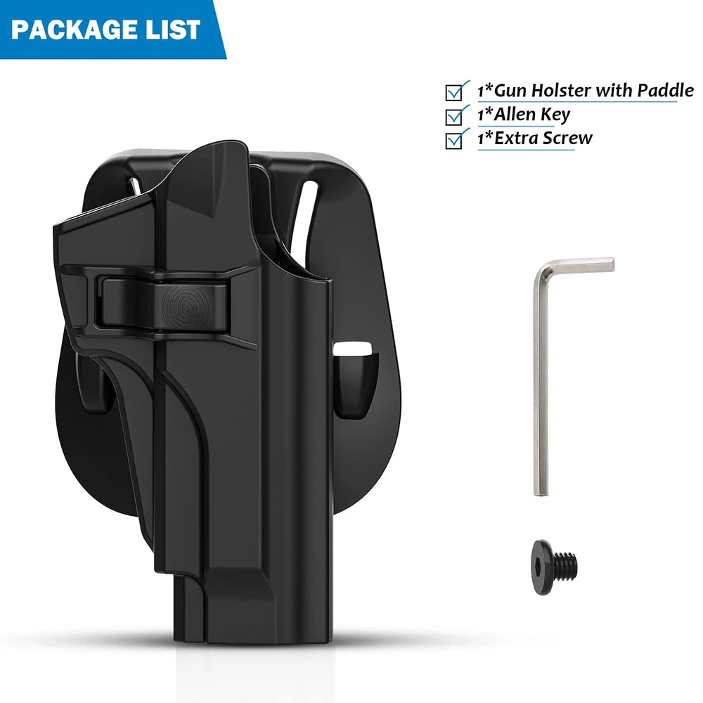 【HOLSTER FIT GUIDE】 Outside the Waistband Holster Custom Molded Fit for Beretta 92 FS 92FS Inox /Compact 92S Full Size/Compact/Centurion M9 M9_22 92G ELITE LTT /Centurion /Compact Taurus PT92 pistol. Notice: This tactical holster can't fit with pistols with laser or sight. (Check the second chart details please) 【LEVEL Ⅱ RETENTION】 Auto locking system achieves an audible click when you holster the weapon, which can secure your weapon inside this OWB holster to ensure ultimate safety. It is designed to be quickly drawn and re-holstered for easier access by pressing release button with your forefinger whenever needed. 【60° ADJUSTABLE PADDLE CANT】 Ergonomically-designed thinner paddle holsters is easily clipped anywhere on your belt or inside the pants waistline, it is convenient to conceal your weapon under your clothing. Simple set cant from 0-60 degrees to fit a comfortable position with Allen key, you won’t have to worry about the firearm digging into your leg the way belt loop holsters can. Compatible duty belt width up to 2 inch. 【MILITARY-GRADE MATERIAL & EXCELLENT DESIGN】 This polymer holster is made of high standard polymer that is waterproof and durable, almost no maintenance required, adapt to every bad environments. The Excellent design of this paddle holster features a wide concave-shaped piece of plastic which works as the backing of the holster, which keeps the firearm away from the hip and ensures a firm grip and the drawing movement is quick and hurdle-free. 【APPLY FOR EVERY PLACES】 Wearing a belt is not a compulsion for using a paddle holster, you can simply tuck it over your waistband, so it is widely used by duty holsters, uniformed law enforcement and peace officers, security personnel, military personnel, private persons and shooting sports holsters all over the world. If you are looking for a gun holster, this is good choice for you.