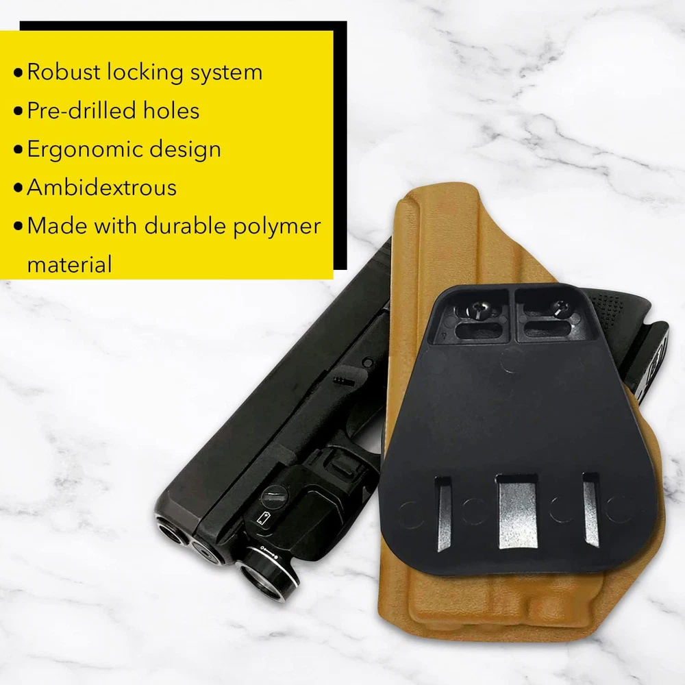 Comfortable design: Our ergonomically designed paddle holster distributes the weight of a fully-loaded carry while sitting just at the hip bone and close to the body providing a consistent and perfect drawing platform. Quality construction: Holster paddles are built with a durable polymer material and allow users to rearrange screws quickly and efficiently without the use of tools. The holster locking fork is designed to mount directly to the back of the holster to keep your carry safe. Customizable fit: Our OWB paddle features two rows of wide slotted holes that allow your hole spacing from range 0.5" to 1.5" on center. The dual rows of slotted holes allow you a wide range of options to set the size of the paddle to plus or minus and adjust the ability to rotate up to 30 degrees. Easy to use: Complete installation takes less than 5 minutes. One side of the OWB holster paddle is attached to the holster body and the other is attached to the back-piece or holster attachment device. You can mount these receiver plates anywhere you wish to securely keep your carry safe. Veteran-owned and manufactured in the US: Our holster paddle is constructed with durable material in the U.S with painstaking attention paid to every last detail so you can be assured that your paddle will be perfectly crafted and durable. Similar in size and shape to the other popular paddles out there, our OWB paddle holsters save you time and effort by already including holes. Our holster paddle attachment features two rows of wide slotted holes that allow your hole spacing to range from 0.5??? to 1.5??? on center. The dual rows of slotted holes allow you a wide range of cant options too. Straight drop / zero cants. Plus or minus adjust ability clear out to 30 degrees! Our paddles for holsters are as much about the features that you can see, like the ones that you can't. Everything from our unique design, to the thread lock on each screw, to our stealth belt clip, to the specific shape of our holsters is no accident. This deliberate attention to detail is what makes the difference between a holster paddle that collects dust in a drawer and a HolsterBuilder OWB paddle attachment that you can confidently use & comfortably wear every day Features: -Quality full grain genuine leather strap -Robust locking system -Pre-drilled holes -Made from durable polymer material -Ambidextrous -Ergonomic design Specifications: -Product dimensions : 4 x 0.5 x 4.25 inches -Product weight: 5.93 Ounces -Solid screw hardware Built-in the USA Package Contains: -1 OWB Paddle -Mounting screws and washers About Us: At holsterbuilder our mission is to create a one-stop shop that provides you, the holster builder, with everything you need to form and create your custom products.