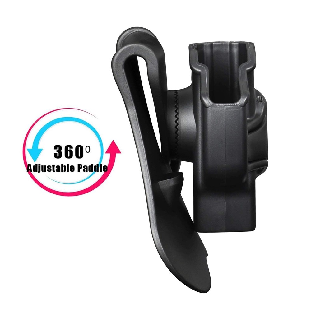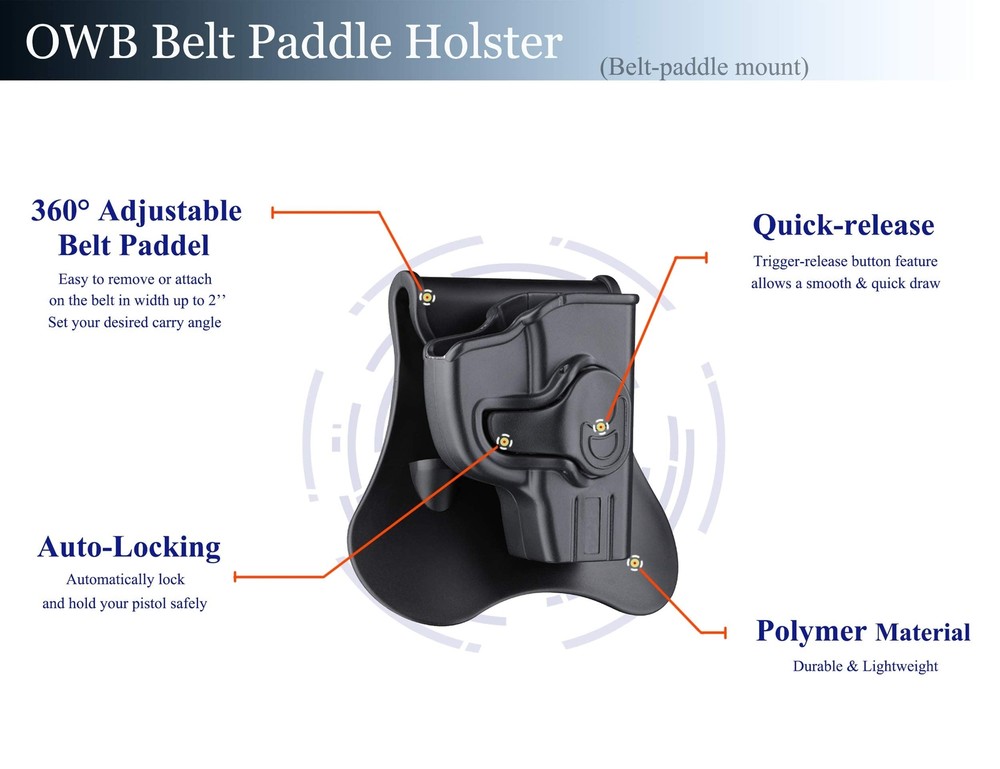 Fit Gun Models: This OWB paddle holster fits Ruger LCP(Not for LCP II or LCP Max), Kel-Tec P3AT 380 Sub-Compact - Right Handed(Note: Doesn't fit Ruger LCP II .380, Ruger LCP II .22, Ruger LCP Max .380, Ruger LC9 or guns with laser) Quick-release Button: This open belt carry holster allows you to place your index (trigger) finger in the perfect position that enables a smooth, quick draw from this 360 degree adjustable holster. AUTO-Locking: This Ruger LCP holster has an integrated auto-locking mechanism that will automatically lock and hold your firearm safely when you put it back in the gun holster. Adjustable Carrying Angle: This gun holster is 360 degrees adjustable with the Allen Key (included). Simply rotating the paddle to get your desired carry angle. And with the paddle, it allows you to attach on and remove this gun holster from your pants or belt in width up to 2". Durability: Our holster for Ruger LCP are made of lightweight polymer material that is resistant to impact, heat and scratch. It's designed for tactical training, hunting, military, the range, law enforcement agencies, personal defense, daily carry and open carry of any kind.
