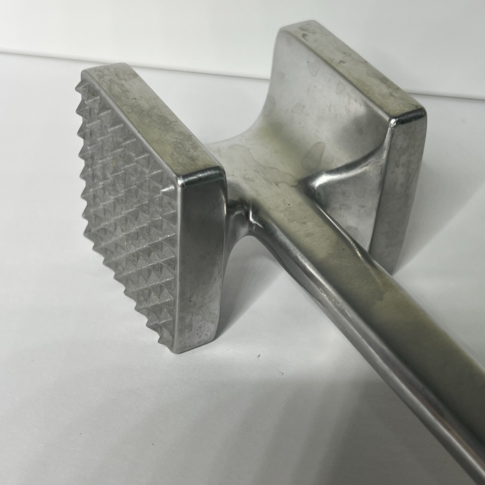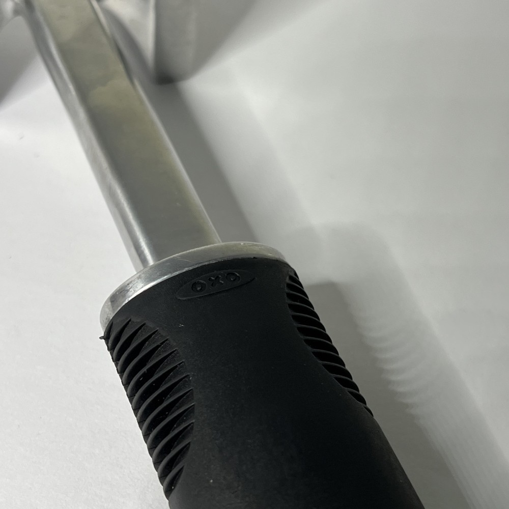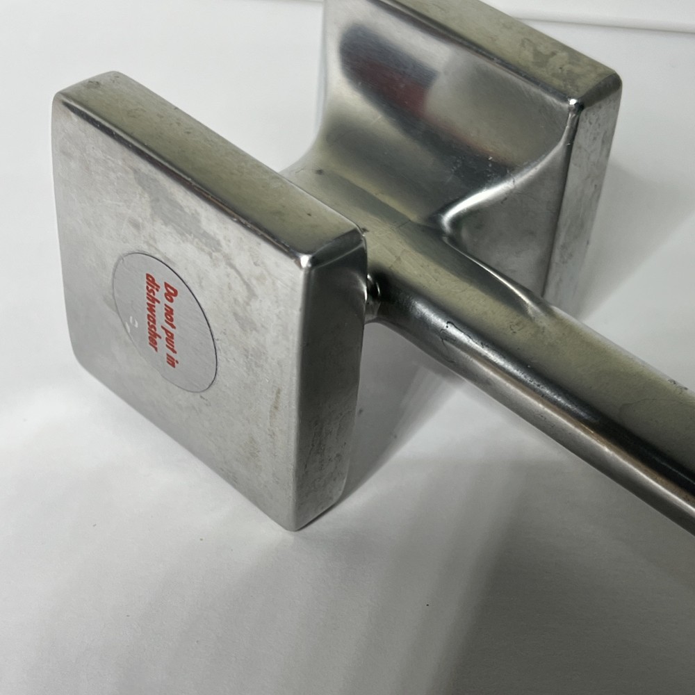 The OXO Good Grips Meat Tenderizer Mallet features a durable aluminum construction with rubberized grips for comfortable handling. Measuring at 9.25 inches in length and weighing 10 ounces, this silver and black mallet is designed to efficiently tenderize meat. The OXO brand is known for its high-quality kitchen tools, and this model is no exception, offering a reliable and effective tool for preparing meats in the kitchen. Used lightly, great quality item!