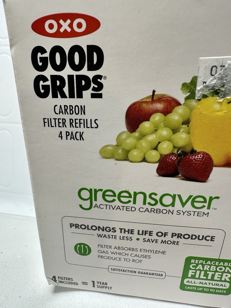 New Factory sealed Box of 4 Good Grips Carbon Filter Refills. For use with OXO GreenSaver Produce Keeper & Crisper Inserts. FREE SHIPPING PLEASE look at pictures good, this is the exact item you will receive. From a smoke and pet free home ****PLEASE make sure your shipping address is correct, I will not reship free an item that has been return to me because of incorrect address ***************