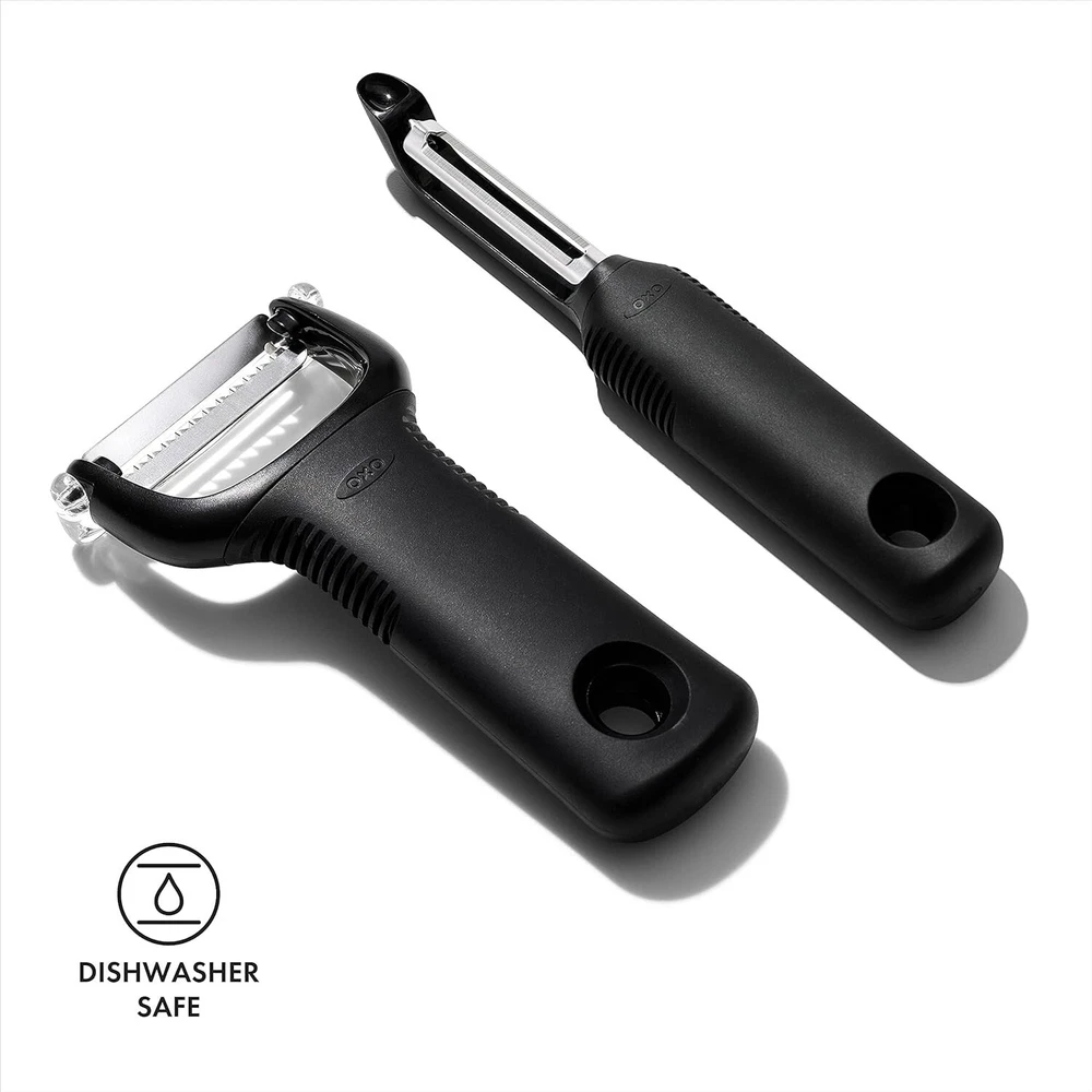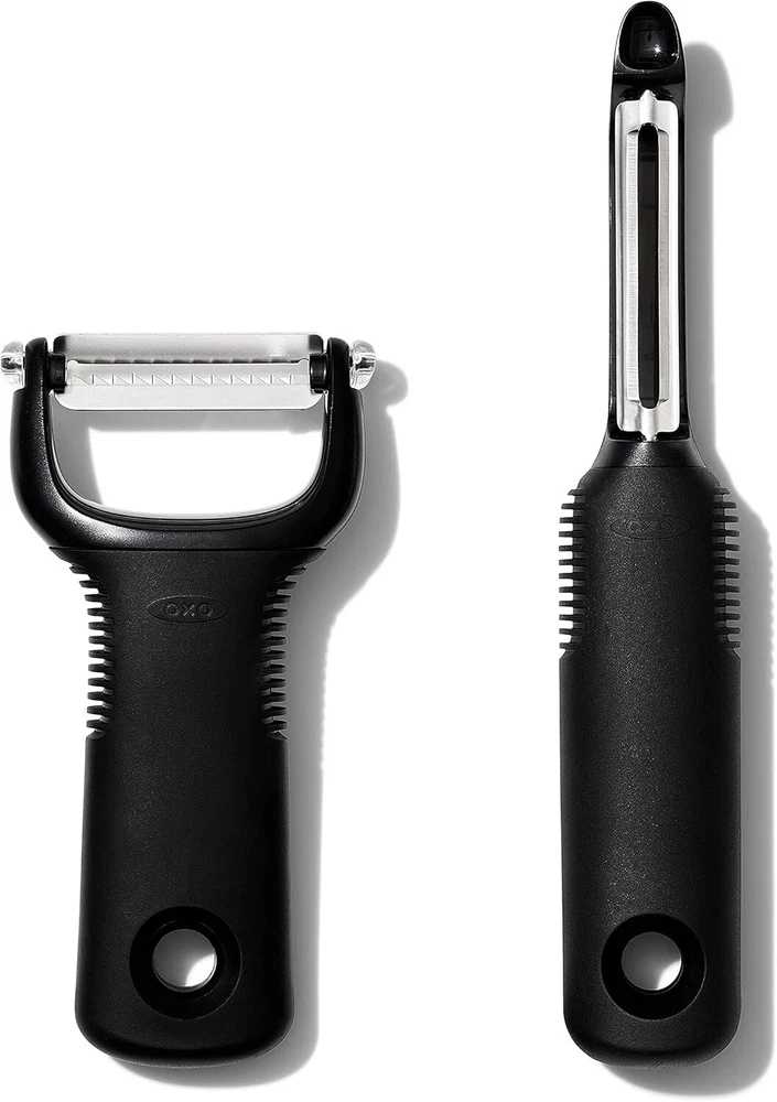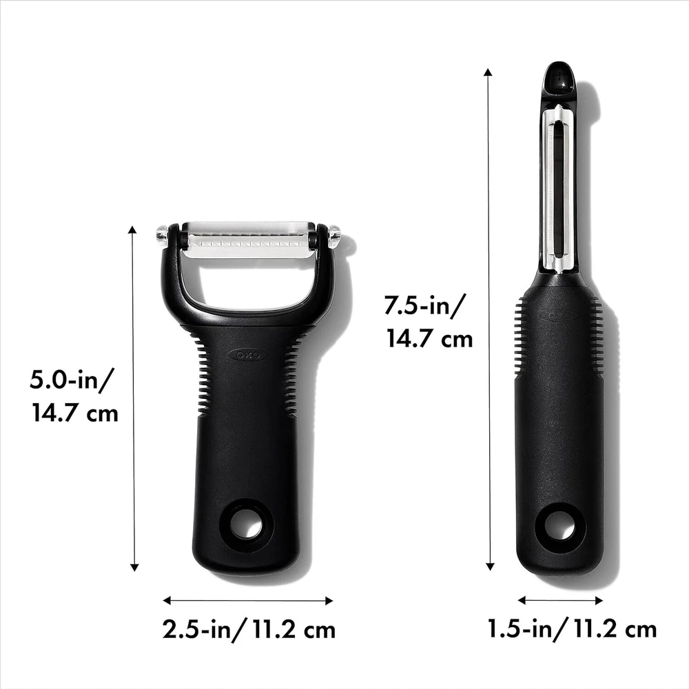 Sharp, durable, Japanese stainless steel blades won’t rust Straight Peeler all-purpose design for effortless prep Julienne Peeler creates precise strips of carrots, zucchini and more Non-slip ergonomic handles Dishwasher safe