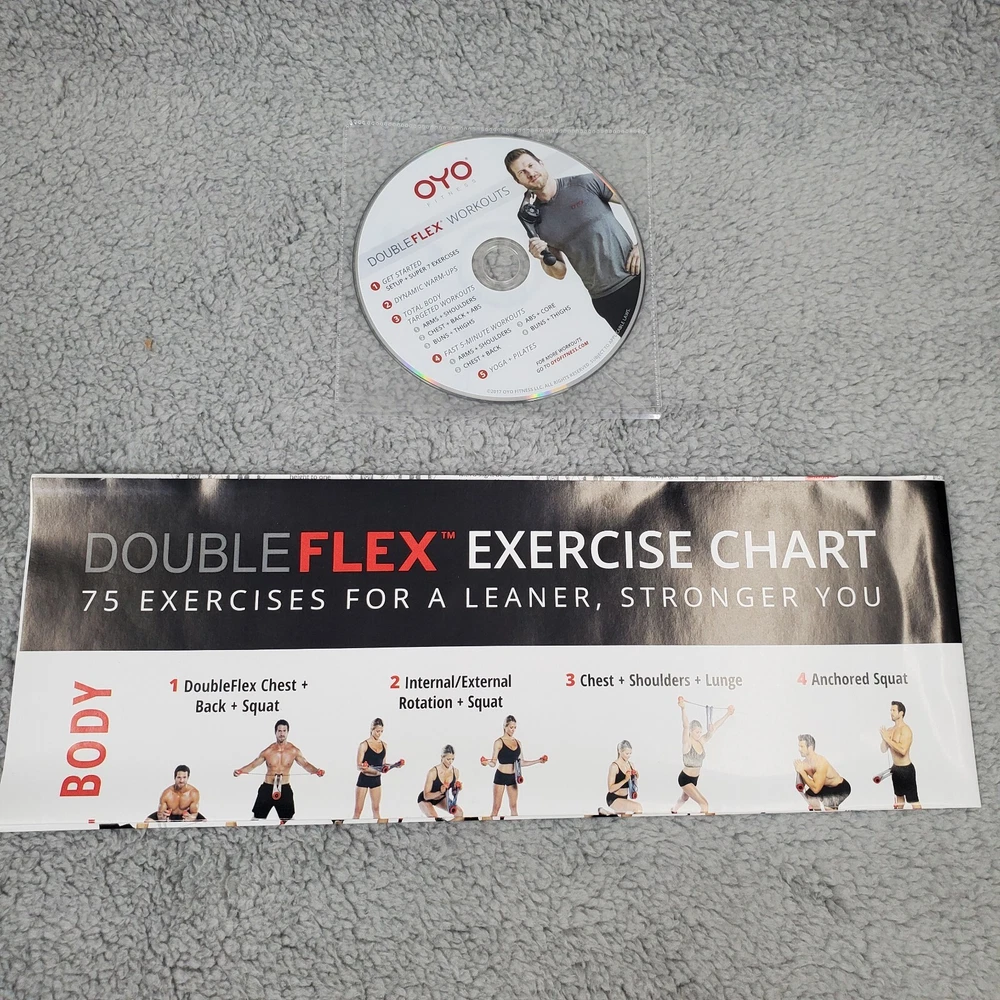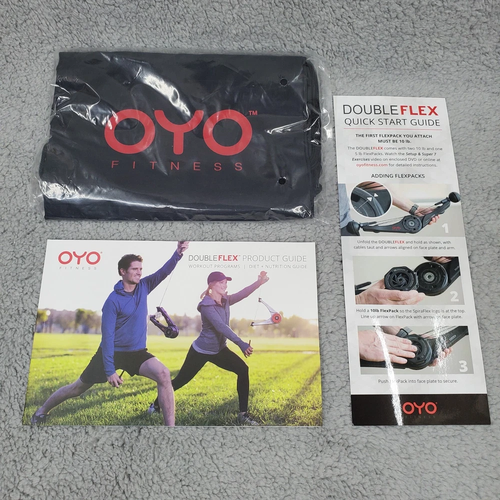 The condition is new in original packaging Includes the following accessories with the Doubleflex: Three flexpacks total for adjustable resistance levels of 10, 15, 20, and 25 pounds. Two leg attachment straps One door attachment strap One workout DVD One OYO storage bag