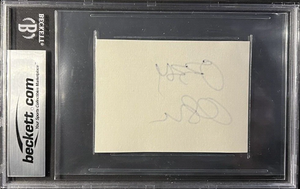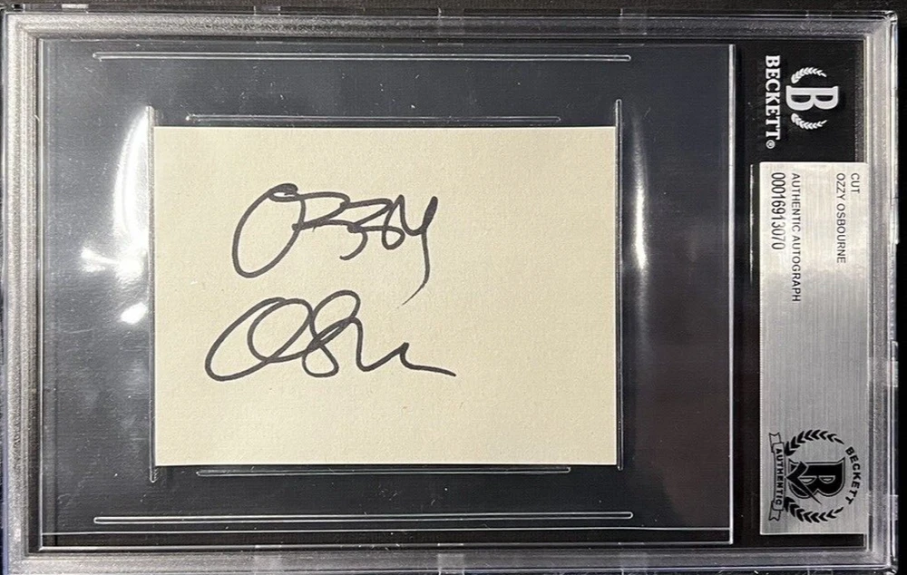 OZZY OSBOURNE AUTOGRAPHED CUT CUT SIZE- 2.75 X 3.0 INCHES SLAB SIZE- 4.38 X 7.0 INCHES BECKETT ENCAPSULATED FOR FULL AUTHENTICITY SHIPPED VIA USPS PRIORITY MAIL WITH TRACKING
