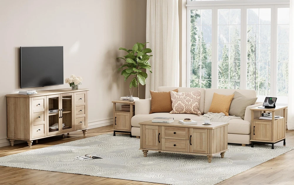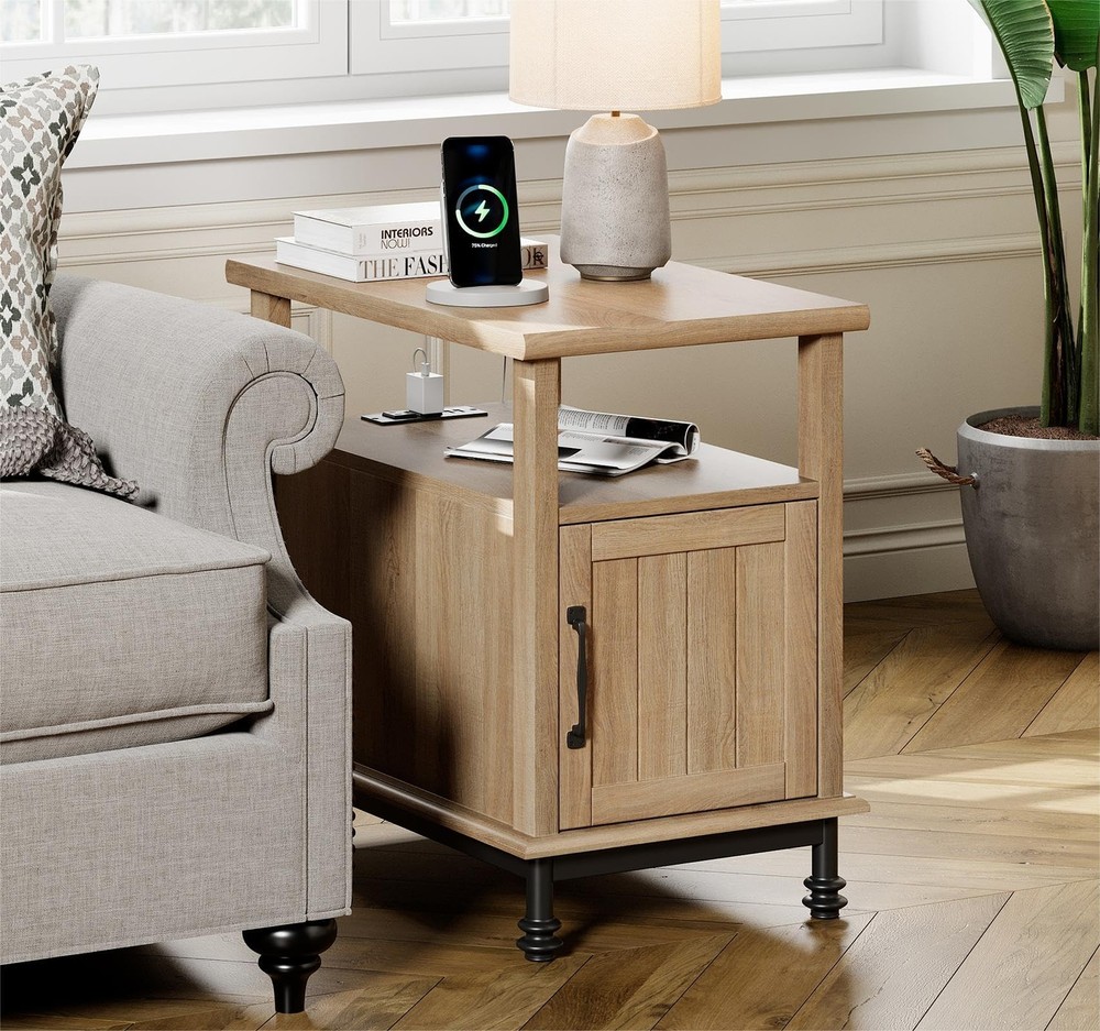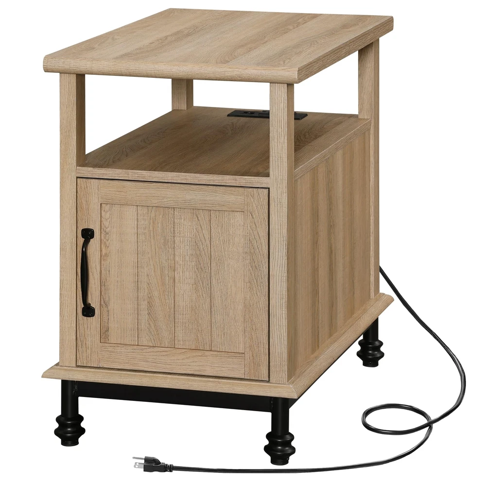 Oak End Table with USB Charging Station and Storage Cabinet for Living Room