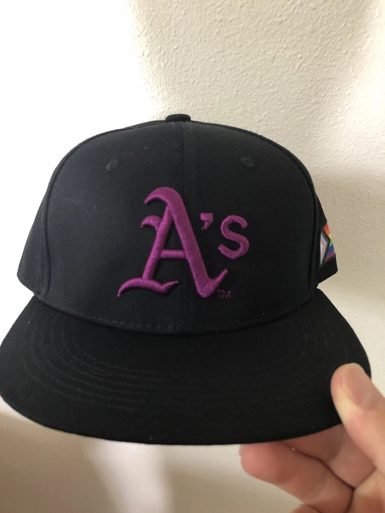 Show your love for the Oakland Athletics with this stylish black baseball cap featuring purple letters and the team's logo. This unisex adult cap is a perfect addition to any sports fan's collection. It is designed by the well-known brand sponsor by GILEAD and is a limited edition SGA snapback hat for the 2022 season. The cap comes in one size and is suitable for both men and women. The hat is made of high-quality materials and is a great product for any fan of Major League Baseball. Celebrate the Pride Day in style with this Oakland A's cap.