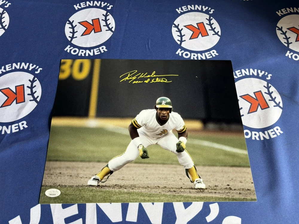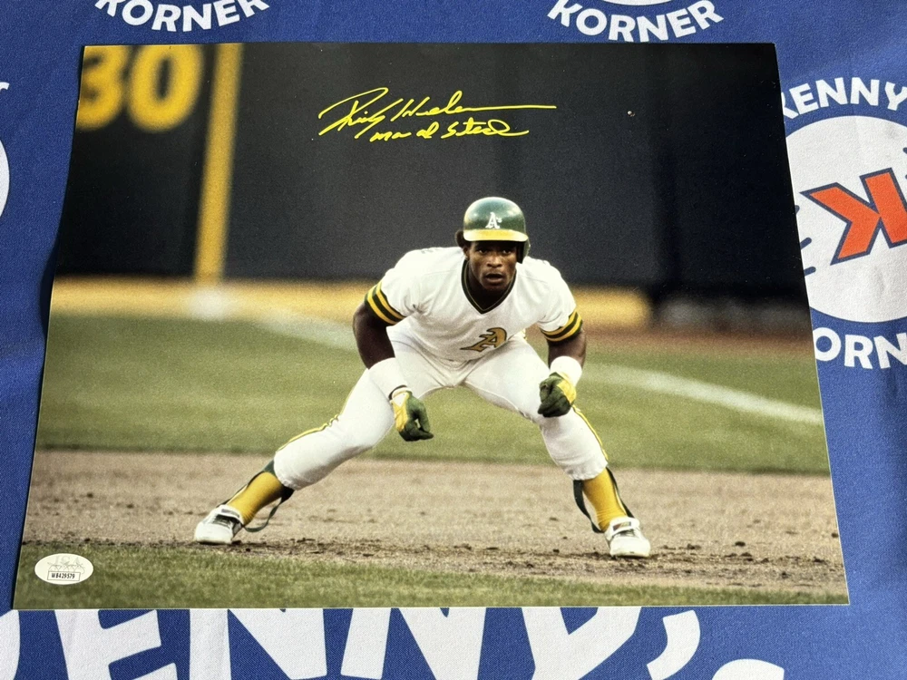 This 11x14 photo is a must-have for any Oakland Athletics fan! It features the signature and inscription of baseball Hall of Famer Rickey Henderson, and has been authenticated by James Spence Authentication (JSA). The photo is an original, not a reprint, and is in excellent shape. As a legendary player, Henderson's autograph is highly sought after, making this a valuable addition to any collection. This product is perfect for display in a home or office, and is sure to impress any visitors who see it. Don't miss out on the chance to own this piece of baseball history! As nice as gets 😍😍😍