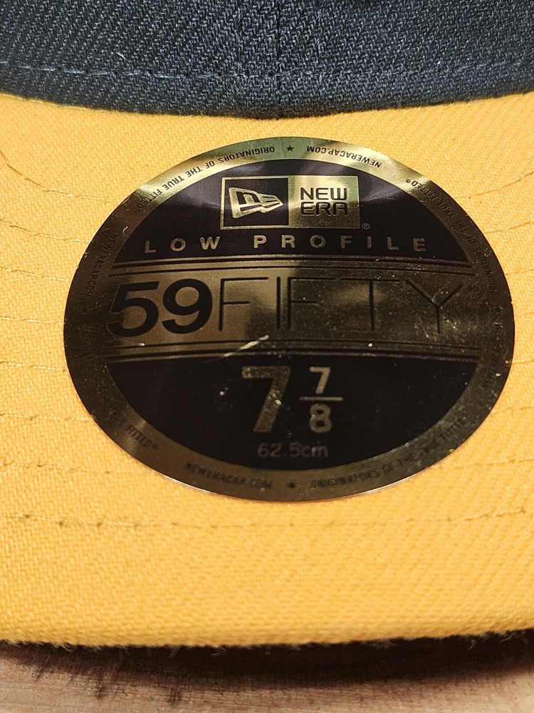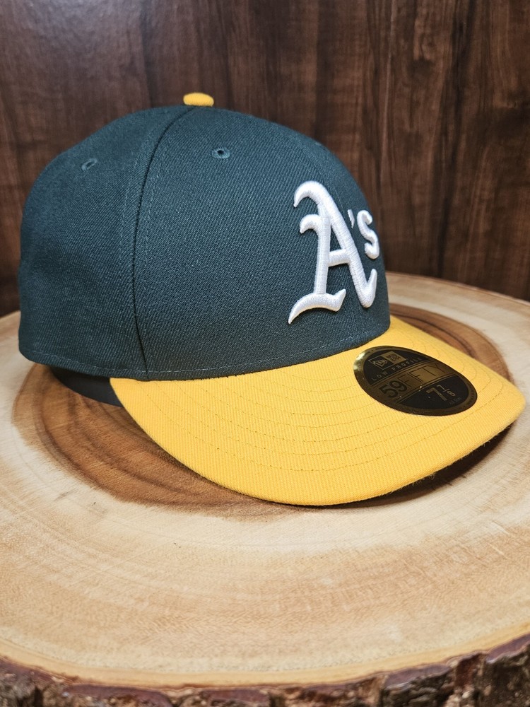 Crafted for baseball aficionados and style enthusiasts alike, the Oakland A's New Era 59Fifty Low Profile Fitted Hat Cap is a quintessential accessory for any wardrobe. Boasting a crisp green and yellow color scheme, this cap is a testament to the timeless appeal of MLB baseball and streetwear culture. The solid pattern and classic design ensure this hat will complement a variety of outfits, making it suitable for business, casual wear, or cheering on your team at the game. The hat is available in size 7 7/8, ensuring a comfortable fit for those who know their exact head size. Its fitted feature guarantees a secure and snug feel, without compromising on style. Whether you're traveling, attending a cocktail party, or simply out and about, this New Era cap is a versatile addition to your collection.