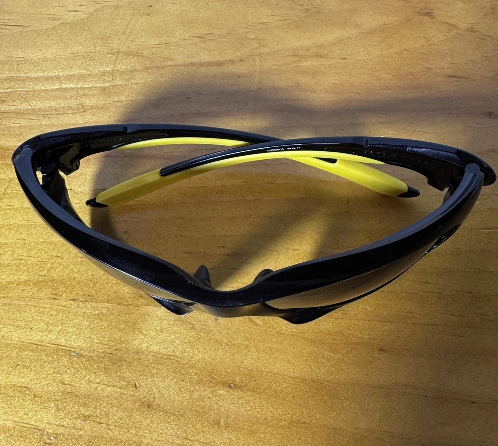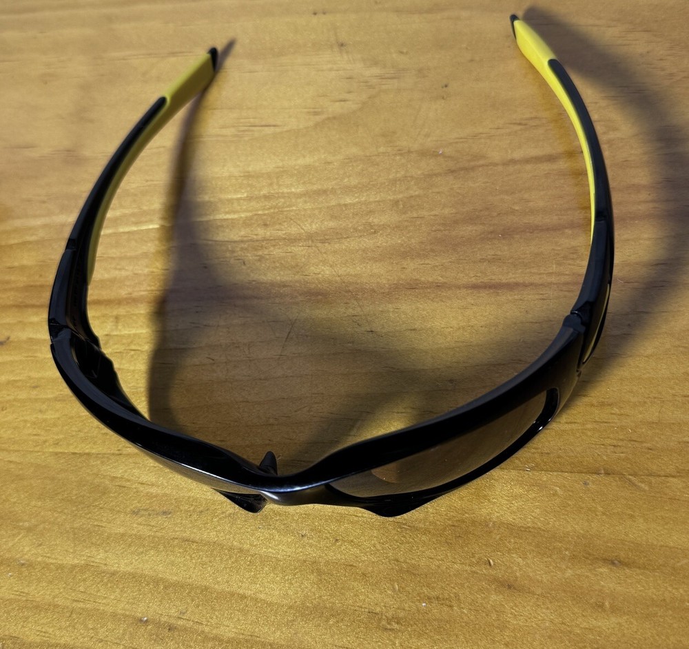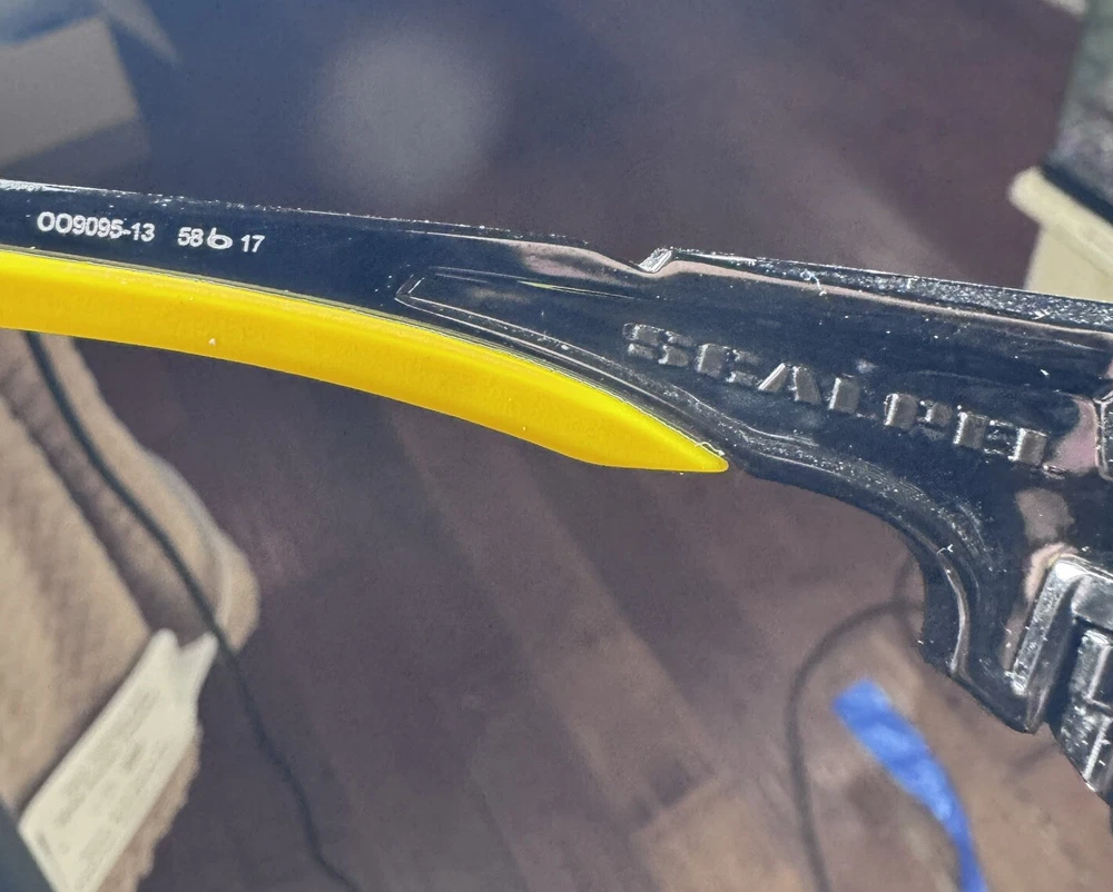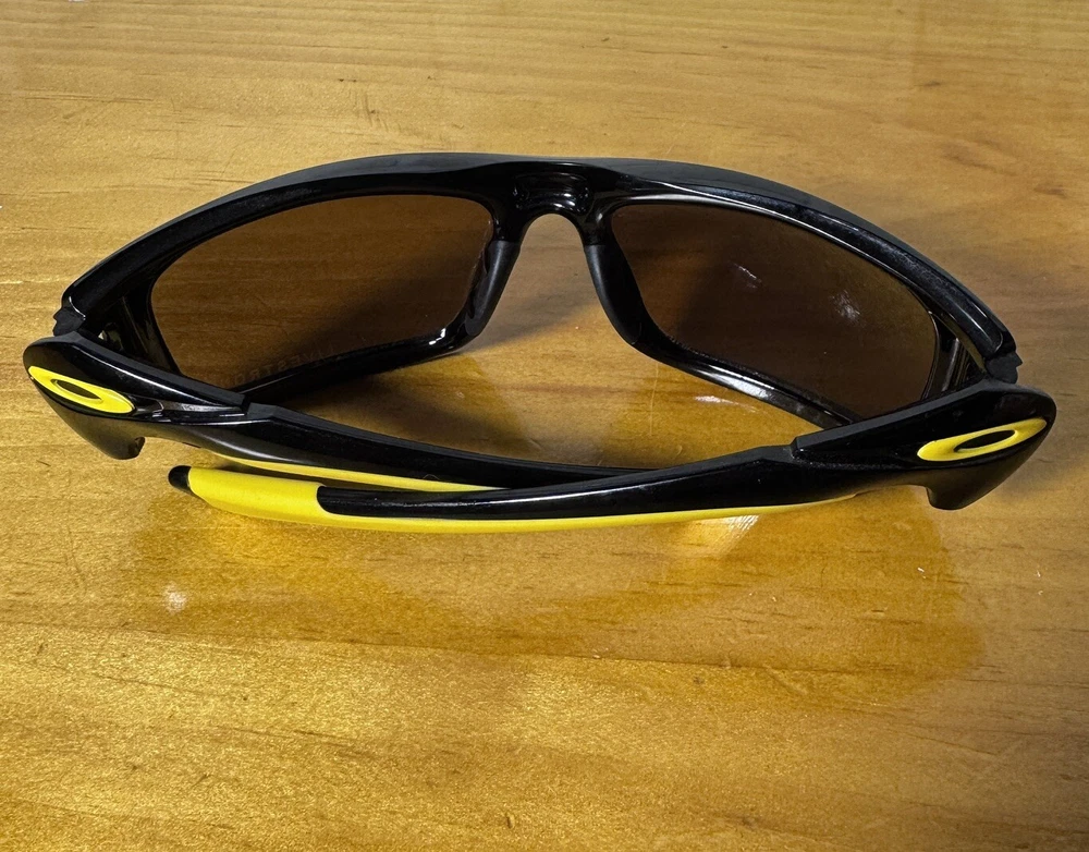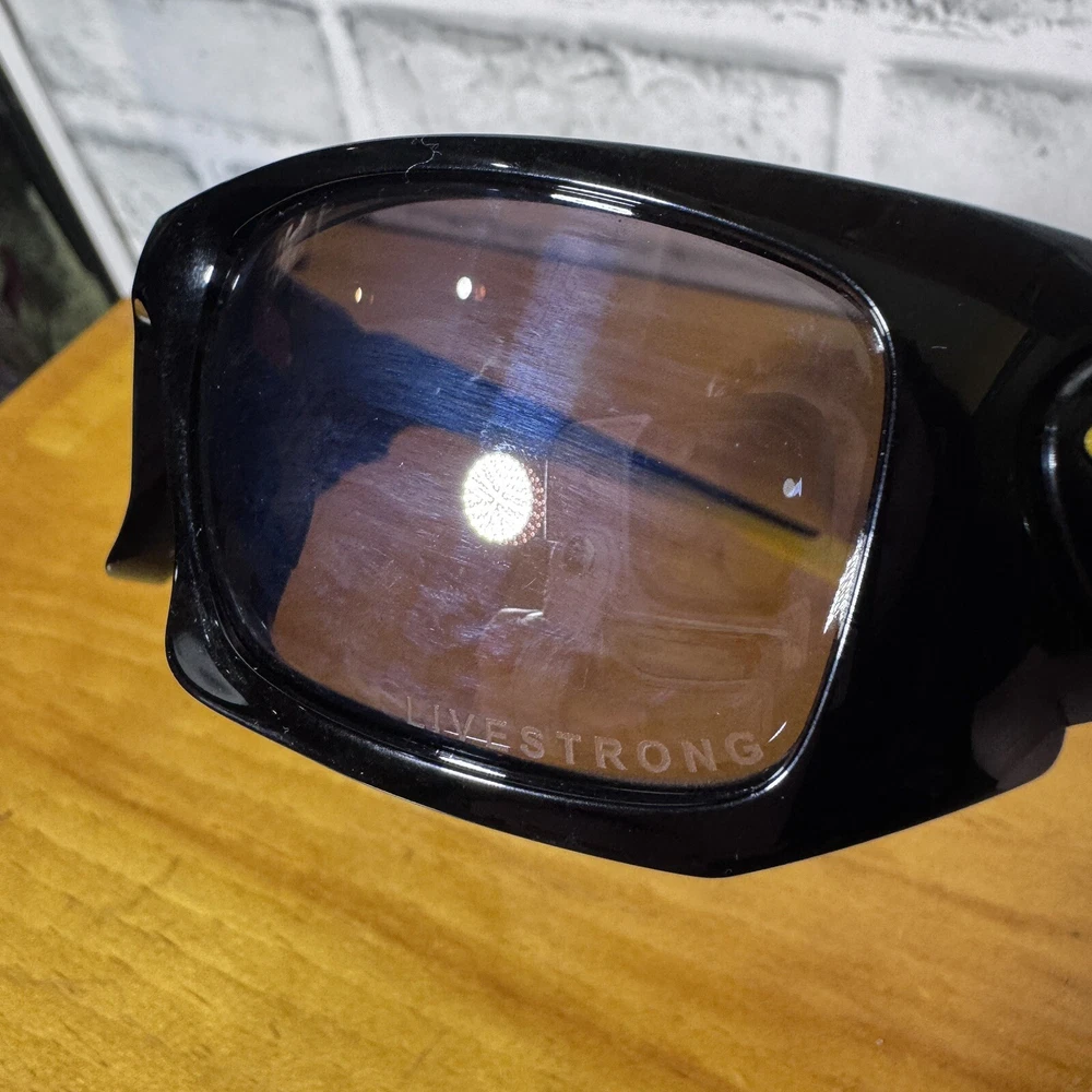 The Oakley Livestrong Scalpel Sunglasses in black with yellow iridium lens are designed for men with a sporty style. These wrap-around sunglasses feature polarized tinted lenses for enhanced vision and protection. The black plastic frame with Oakley branding is sturdy and stylish, making them a great choice for outdoor activities. Perfect for those seeking quality sunglasses that offer both performance and style. In good pre owned condition. Shows signs of light use.