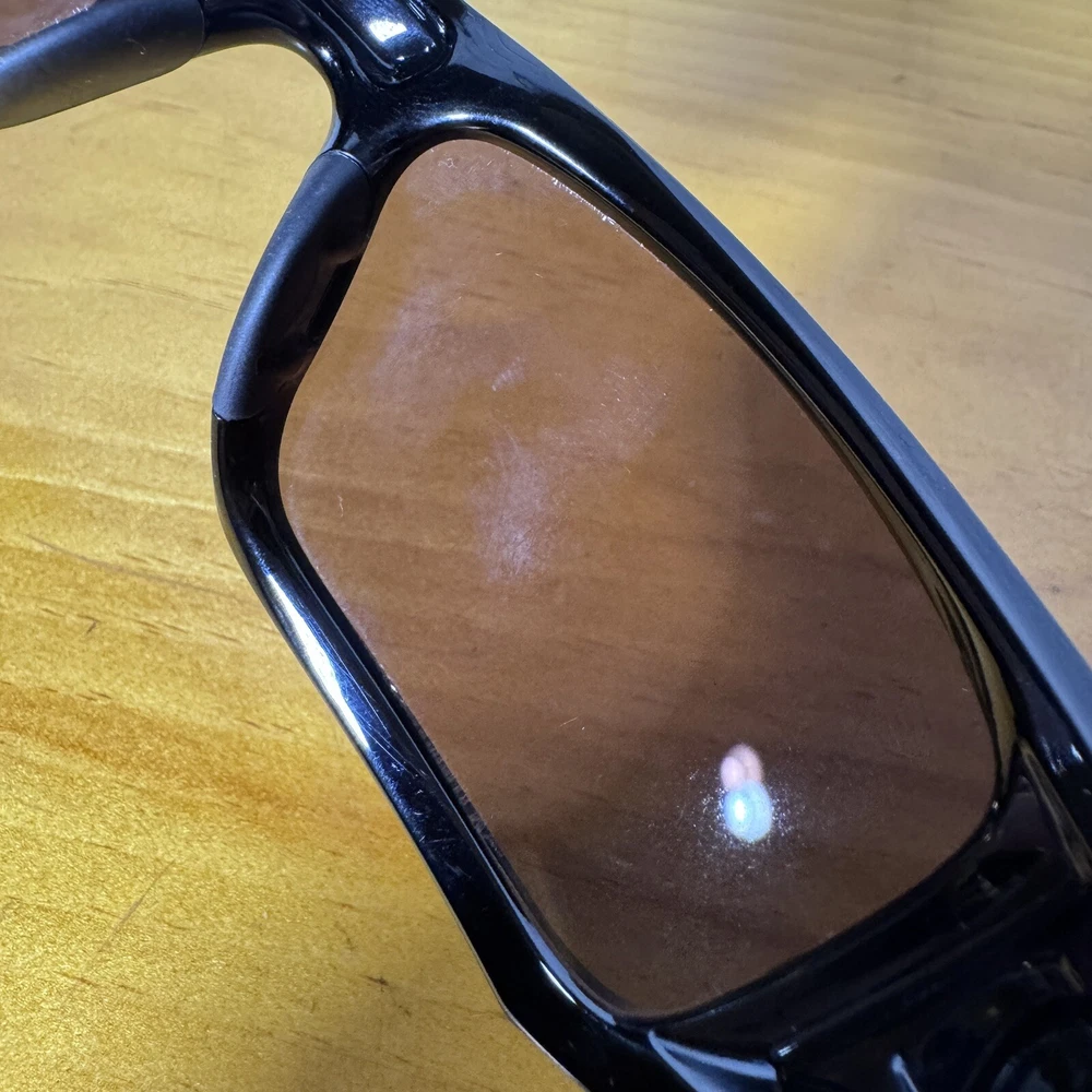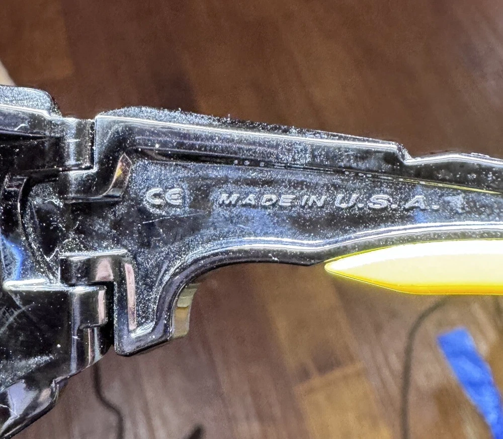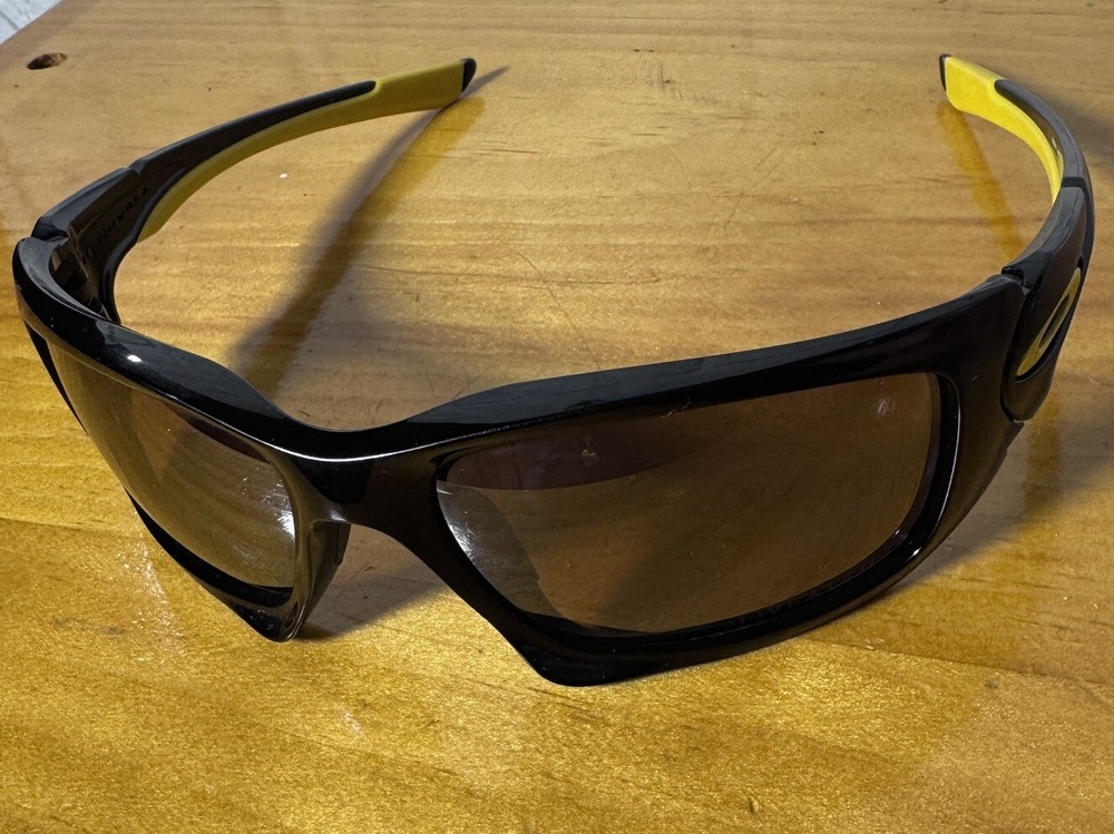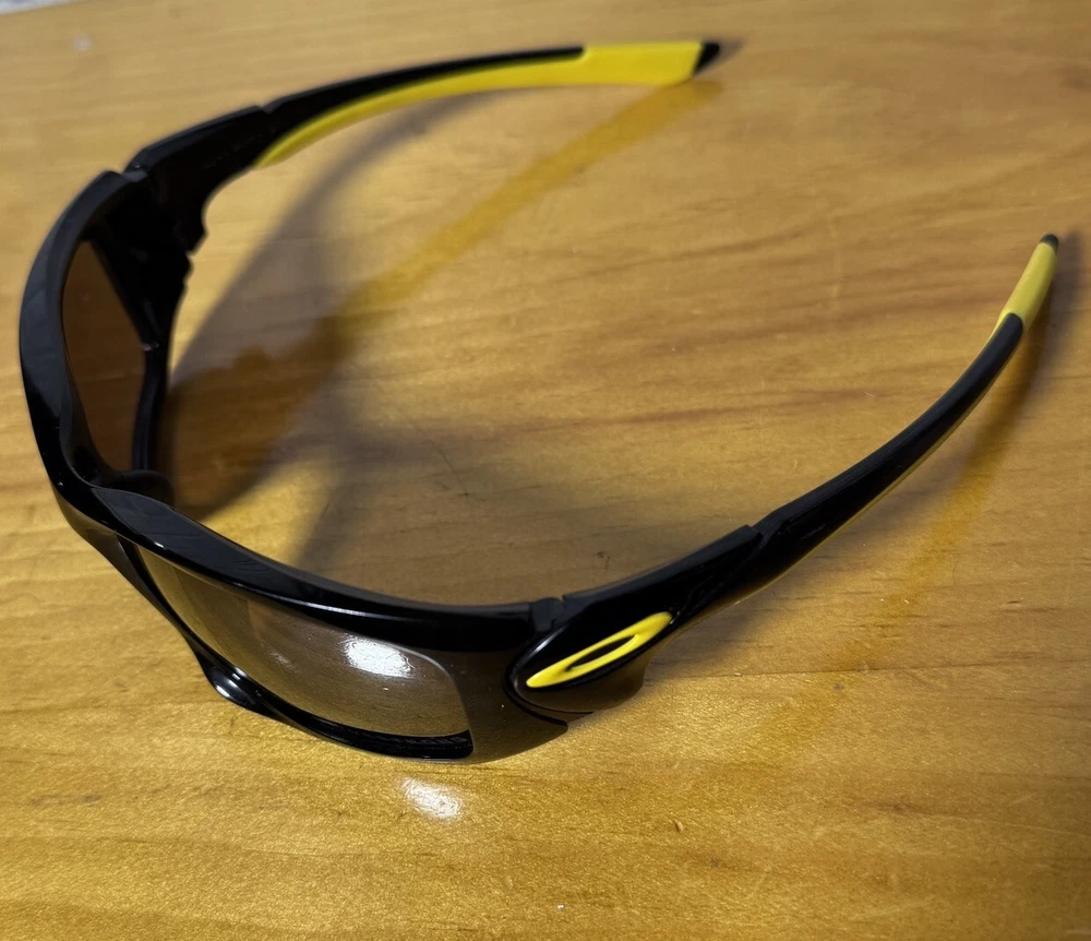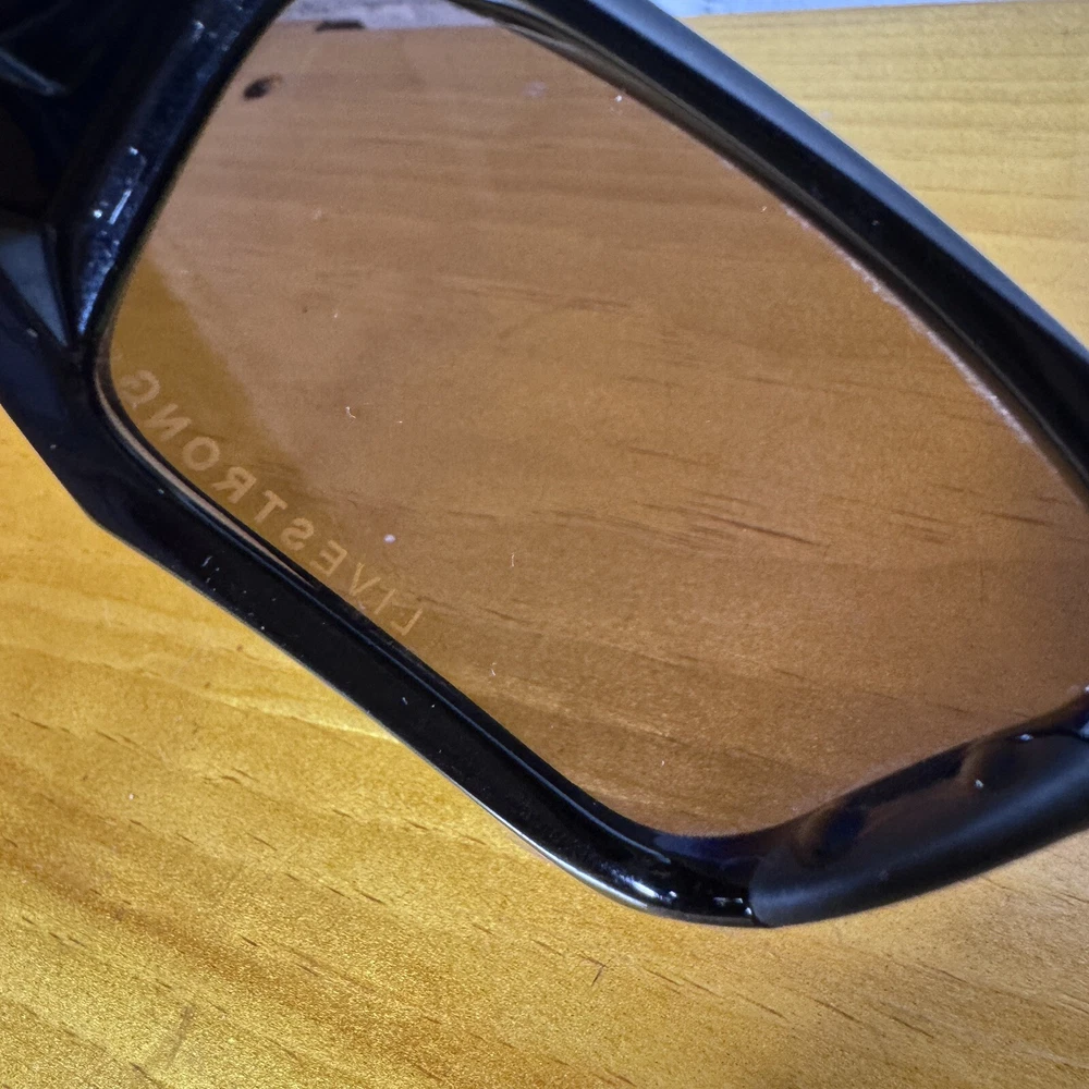The Oakley Livestrong Scalpel Sunglasses in black with yellow iridium lens are designed for men with a sporty style. These wrap-around sunglasses feature polarized tinted lenses for enhanced vision and protection. The black plastic frame with Oakley branding is sturdy and stylish, making them a great choice for outdoor activities. Perfect for those seeking quality sunglasses that offer both performance and style. In good pre owned condition. Shows signs of light use.