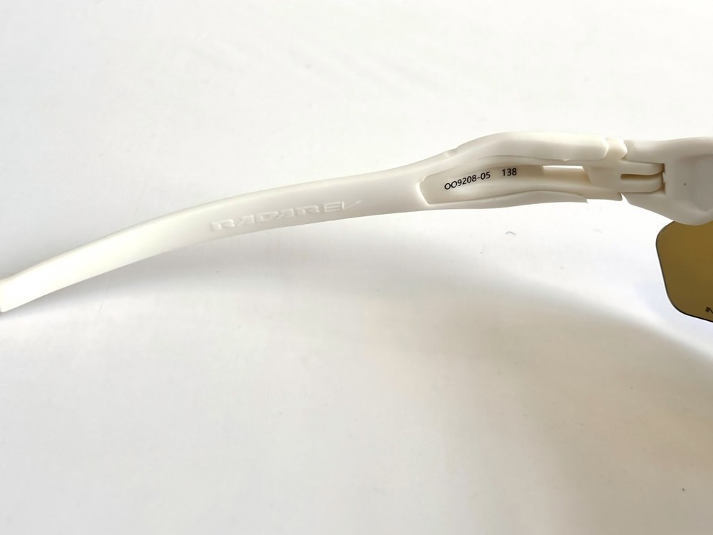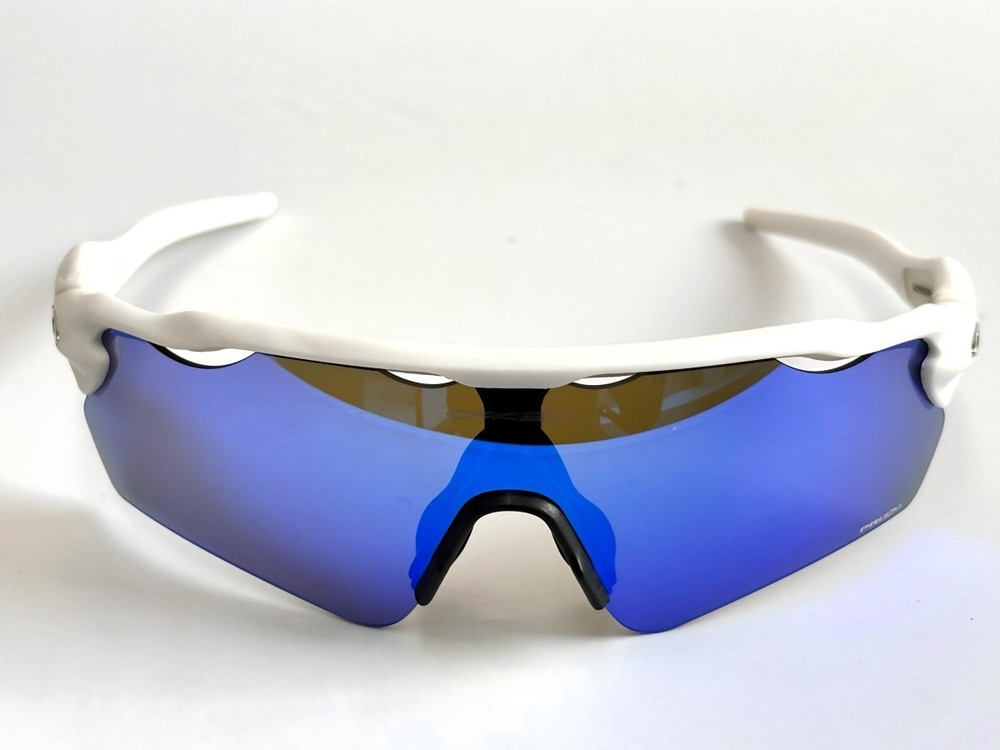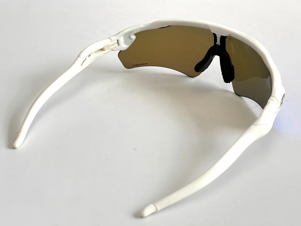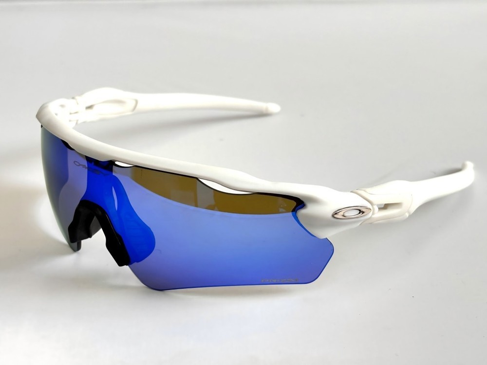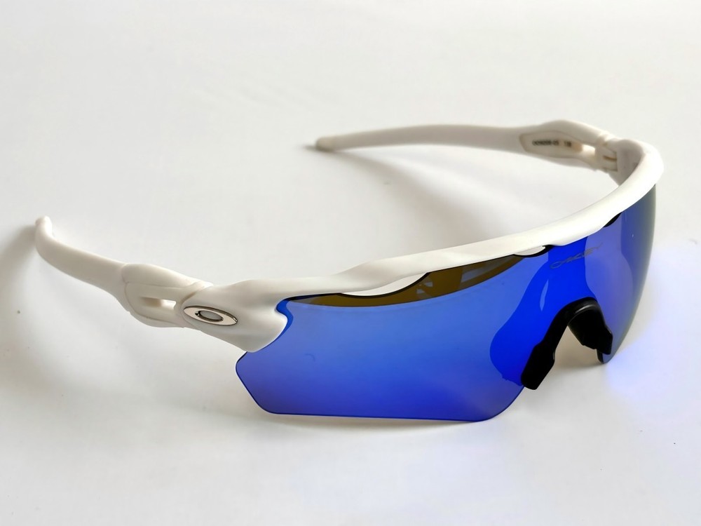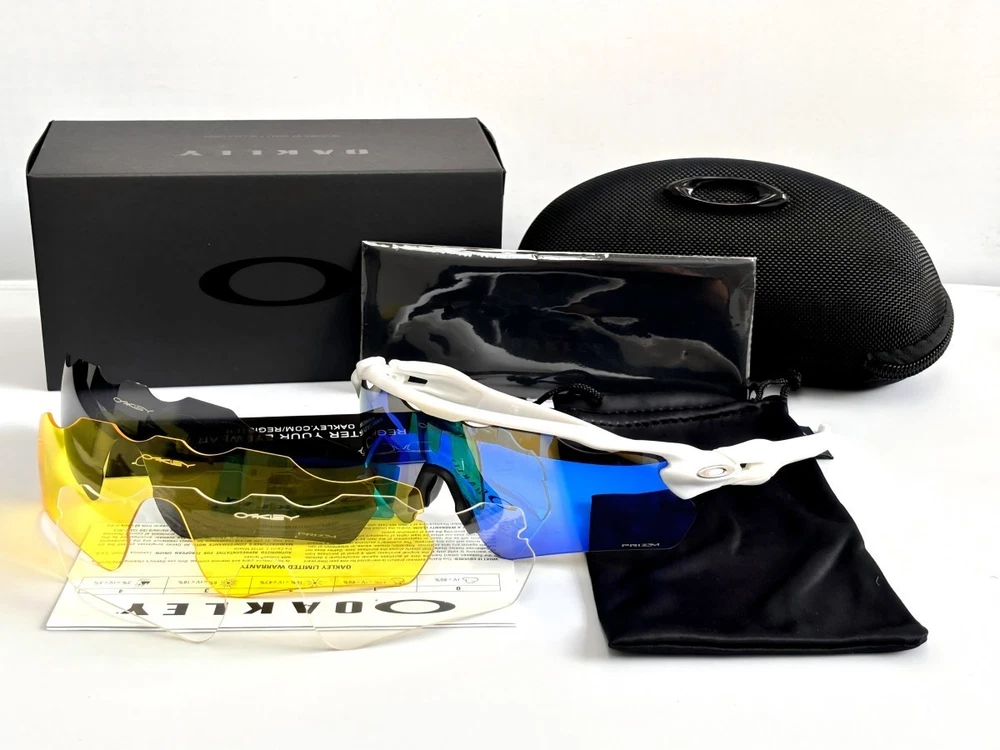 Oakley Radar EV Patn OO9208 Sunglasses white Frame Foot Blue Polarization his listing includes a pair of Oakley sunglasses, Oakley zip case, Oakley 3 replacement lenses Oakley microfibre pouch and Oakley paperwork. Mint condition No scratches New nose pad Temple length - 128mm Frame color - white Lens color - Prizm Blue