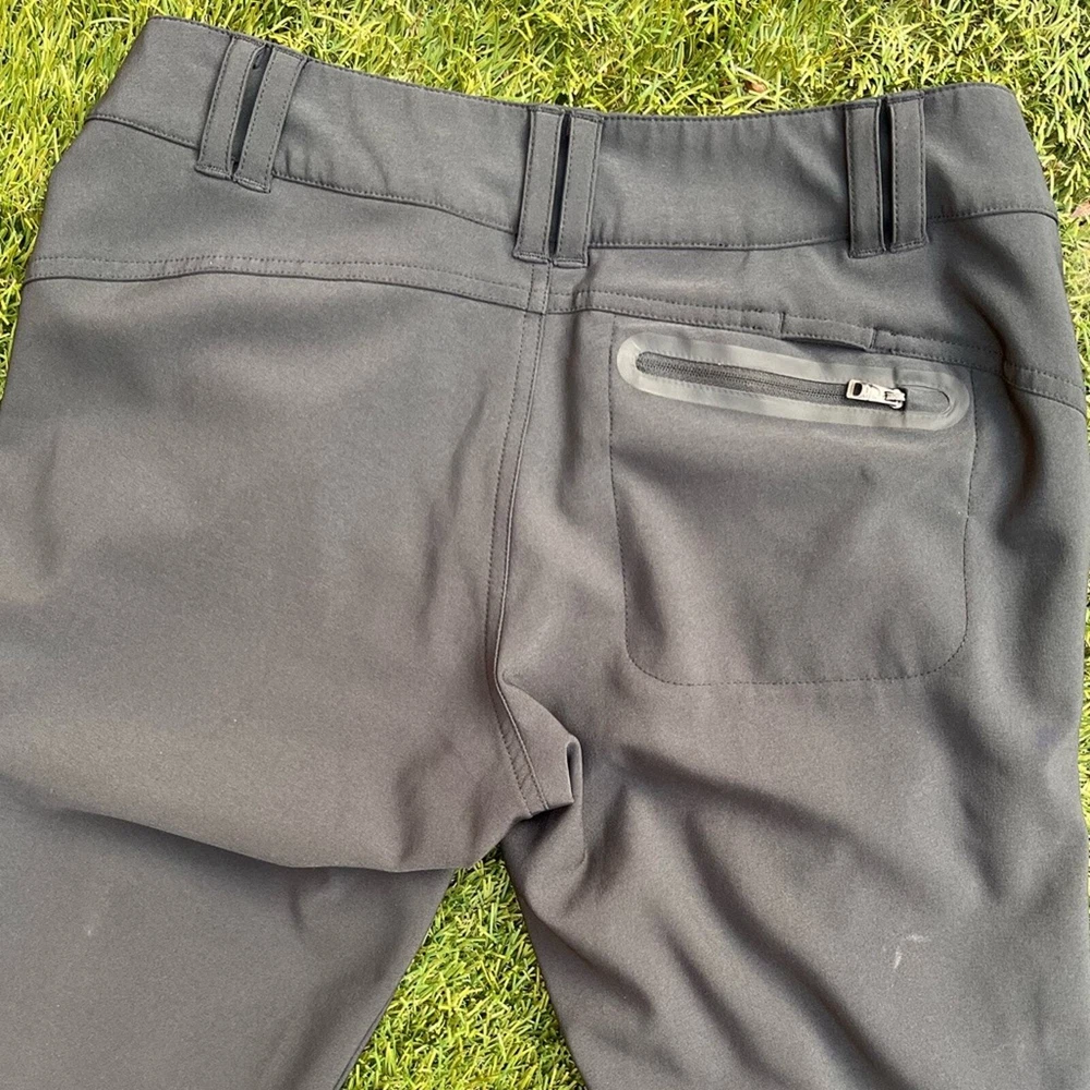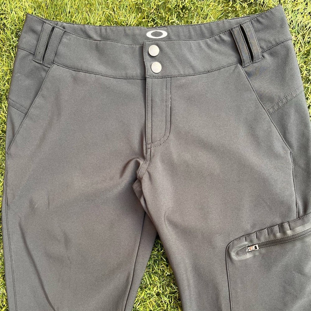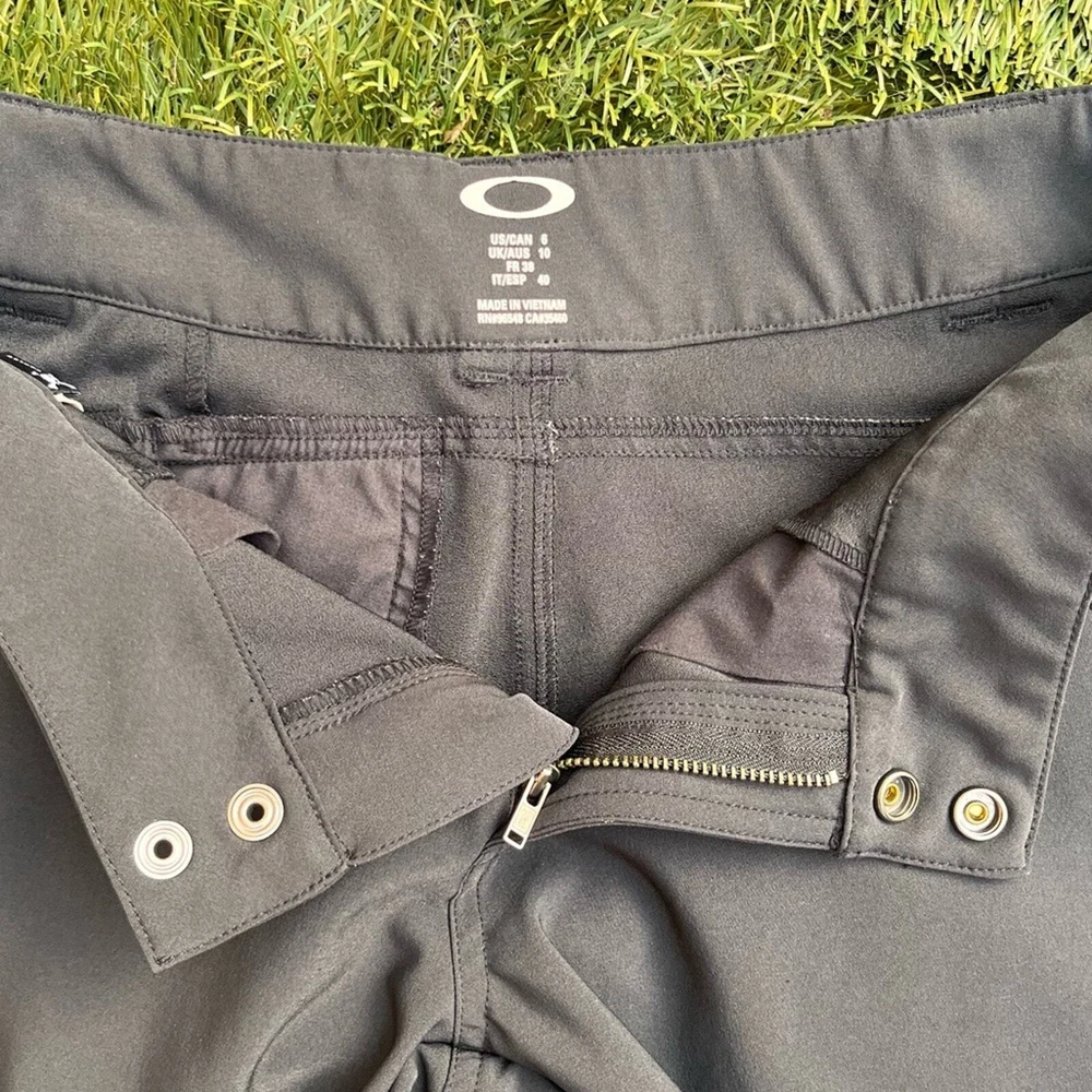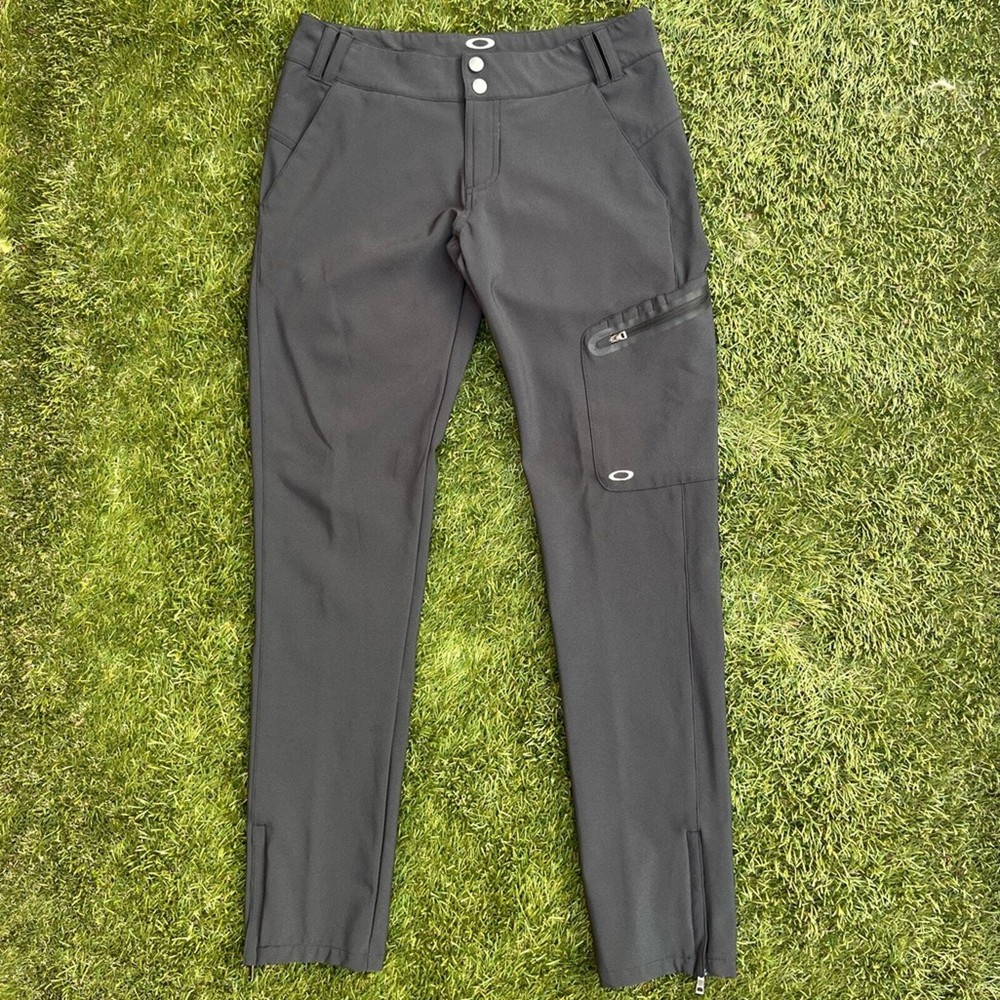 Pre-Owned full length Golf Pants by Oakley Style is the Seirra Golf Pants Color is Charcoal Grey Size 6 in women Measurements: Waist 15.5 inches Rise 8 inches Inseam 31 inches Excellent pre-worn condition. Very clean, no stains, snags, holes or tears. No signs of excessive wash or wear. Zippers and snaps in great condition. The pockets look great, no holes. The only flaw is the graphic of the “hydrolix” near the right hip pocket is trying to peel. Overall great condition, see all of my photos for more details of pants condition. Super amazing utility golf pants, featuring a thigh pocket with tee slots and a zippered pocket for other gear, such ass golf balls or golf gloves. Neutral color to match any polo or athletic shirt you wear out on the course. Water resistant hydrolix material makes these trousers even more versatile, perfect for hiking or camping too!
