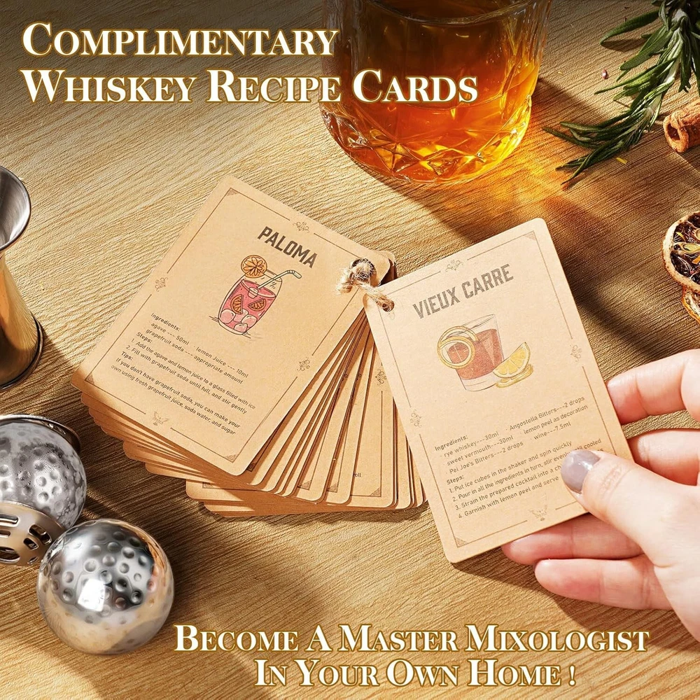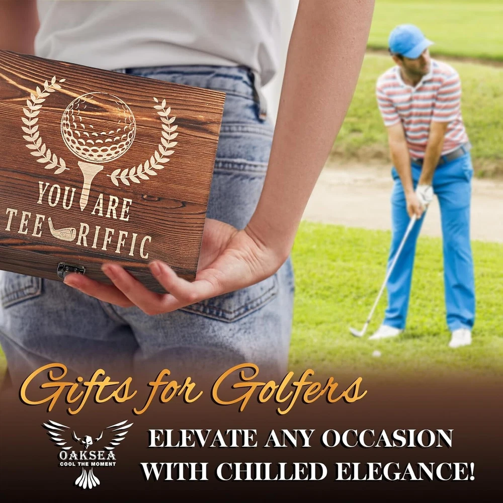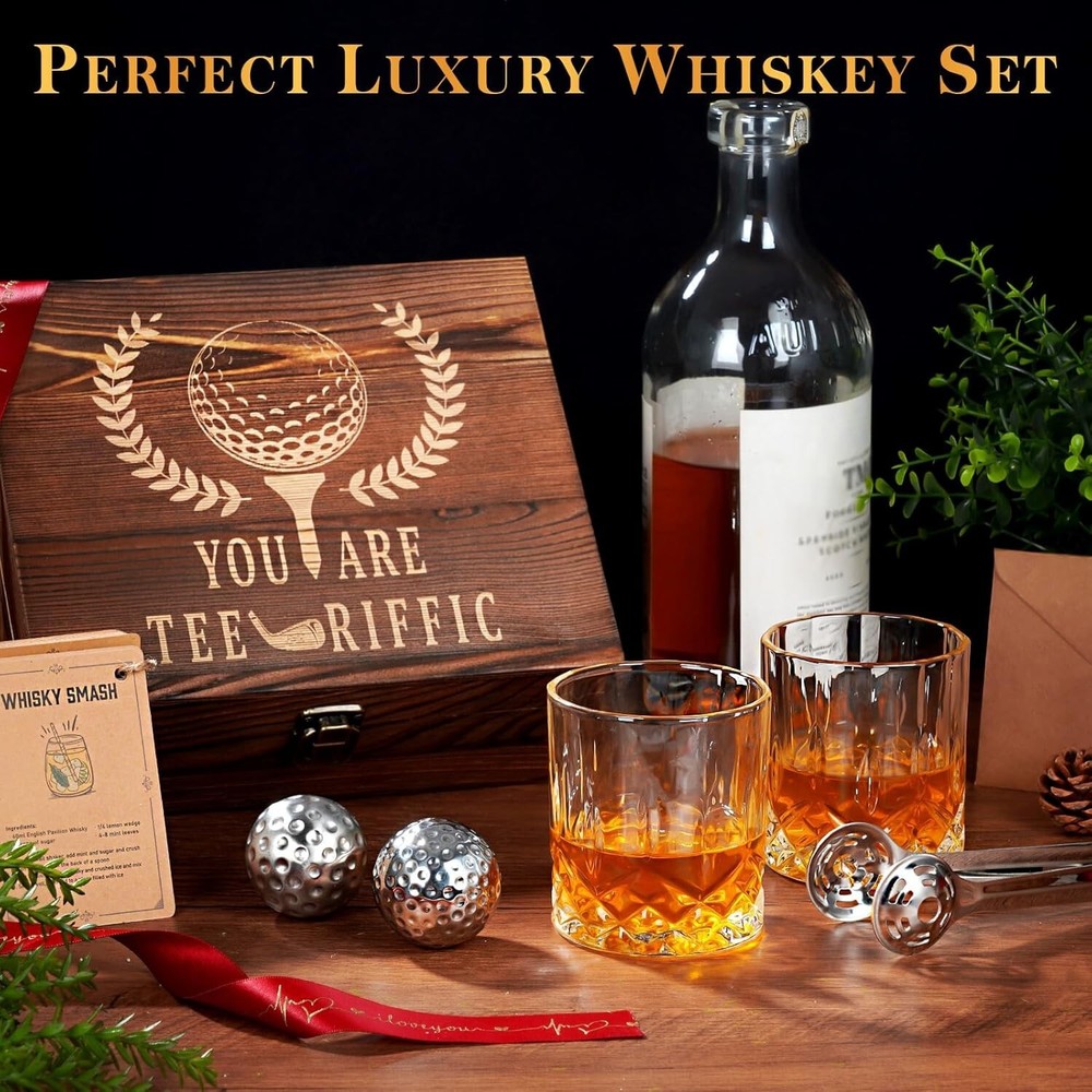 【HOLIDAY GIFTS GUIDE】 【ELEVATE YOUR GIFTING WITH OUR UNIQUE GOLF-THEMED WHISKEY GIFTS】 Perfect for golf and whiskey enthusiasts, it's an ideal gift for any occasion. Enjoy sophisticated drinking with golf ball-shaped whiskey stones and a personalized 'You are tee-riffic' engraved box. Combining two beloved interests, golf and whiskey, it's a heartfelt gift choice. 【 UPGRADE YOUR VALENTINE GIFTS-GIVING WITH MAN CAVE COOL STUFF 】 Looking for a unique gift for the whiskey lover in your life? Check out our barrel-shaped whiskey stones set ! They add class to any man cave or home bar, and their unique design will make your gift set stand out. It is a perfect Christmas gifts for men. 【 COCKTAIL CARDS INCLUDED 】 In addition to enjoying the cooling whiskey stones, we also provide you with cocktail cards. These cards include a variety of classic cocktail recipes, so you can enjoy the fun of mixing your own perfect cocktail while sipping your aged whiskey 【 CHILL WHISKEY WITHOUT WATERING IT DOWN 】 Keep your whiskey pure and uncompromised without the need for ice. Say goodbye to the risk of dilution or affecting the taste with unsightly ice cubes. We have a unique solution - 304 food grade stainless steel whiskey stones. They are safe, tasteless, odorless, and will give you a better taste experience. 【 ULTIMATE ADDITION TO YOUR MAN CAVE 】: Treat yourself as you deserve. Luxury wooden boxes and crystal glasses will be a luxurious decoration and collection for your bar and man cave. Grandpa's gifts are sure to make an impression when enjoying your whiskey, bourbon, or scotch.