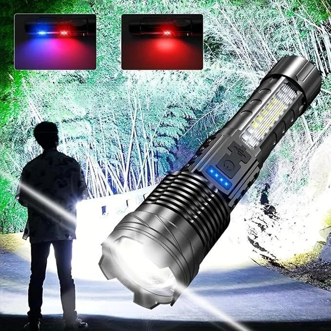 Specification : Material: Aluminum + Plastic Main light mode (click the switch to enter): Super bright - medium bright - flashing Side light mode (press and hold to turn on): Super bright - medium bright - red bright - red and blue flashing Power supply: Internal rechargeable 2600mAh lithium battery. Charging method: USB-C Charging time: Estimated 3.5 hours Operating time: 3-4 hours for brightest mode, longer for other modes Power indicator (blue indicator): 25%-50%75%-100%. Waterproof level: IPX4 Product size: 165*41*28mm Weight (burner): 150G Attention: 1.Due to the high working power of the super bright flashlight, the LED light-emitting position generates more heat, so please do not touch the light-emitting position (ie the head of the flashlight) with your hands; 2. The flashlight should not be used under water, not submerged, not in the rain; 3. Do not irradiate the human eye; 4. Do not give it to children to use ☀Super Bright Flashlight ✔ uses a super bright high power wick to dispel the darkness, with a maximum lumen value of 15000,000 and a super long range of 500 meters. Perfect for work, outdoor, camping, adventure and emergency use. ☀ LED Rechargeable Flashlights ✔ with built-in rechargeable battery, equipped with USB-C charging port, charging time is only about 3 hours, in the brightest mode, usage time up to about 4 hours. And has a smart power indicator light 25%-50%-75%-100%, always know the power situation. ☀ 7 Lighting Modes ✔ The main light 3 modes, click the switch to give (super bright - medium bright - flashing), side lights 4 modes, long press the switch to give (super bright - medium bright - red - red and blue flashing), the flashlight can be turned off directly after 10 seconds of operation in any mode, without going through all modes. ☀ Tactical Flashlight Adjustable Focus ✔ Many people say the flashlight they have is too heavy, we have solved this problem by using a high quality ABS flashlight body and Aluminum head. Combines quality with we ight reduction. The flashlight weighs less than 150 grams and is much easier to use. ☀Package contents, 1*flashlight, 1*charging cable, 1*lanyard, 1*clip and instruction manual. We have carefully checked all the items before shipping to make sure the product works properly. If you have any questions, please feel free to contact us for the best solution within 12 hours. Note: 1. Due to the high working power of the super bright flashlight, the LED light-emitting position generates more heat, please do not touch the light-emitting position (i.e. the head of the flashlight) with your hands; 2. Do not use the flashlight in water, do not immerse; 3. Do not irradiat e the human eye; 4. Do not give it to children to use.