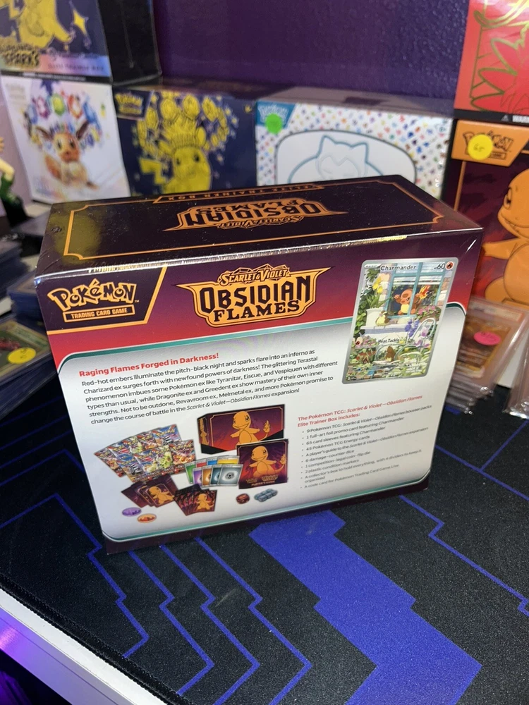 Features9 Pokémon TCG: Scarlet & Violet—Obsidian Flames booster packs 1 full-art foil promo card featuring Charmander 65 card sleeves featuring Charmander 45 Pokémon TCG Energy cards A player’s guide to the Scarlet & Violet—Obsidian Flames expansion 6 damage-counter dice 1 competition-legal coin-flip die 2 plastic condition markers A collector’s box to hold everything, with 4 dividers to keep it organized A code card for Pokémon Trading Card Game Live Product DescriptionRaging Flames Forged in Darkness! Red-hot embers illuminate the pitch-black night and sparks flare into an inferno as Charizard ex surges forth with newfound powers of darkness! The glittering Terastal phenomenon imbues some Pokémon ex like Tyranitar, Eiscue, and Vespiquen with different types than usual, while Dragonite ex and Greedent ex show mastery of their own inner strengths. Not to be outdone, Revavroom ex, Melmetal ex, and more Pokémon promise to change the course of battle in the Scarlet & Violet—Obsidian Flames expansion!