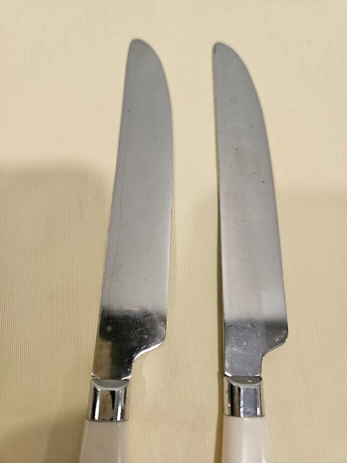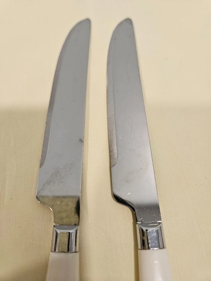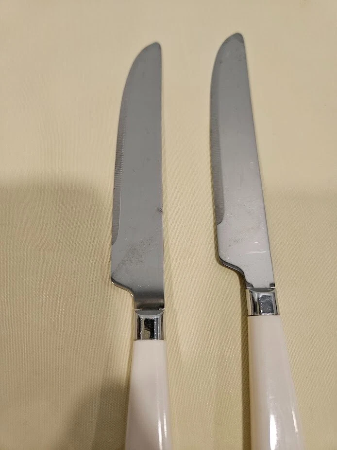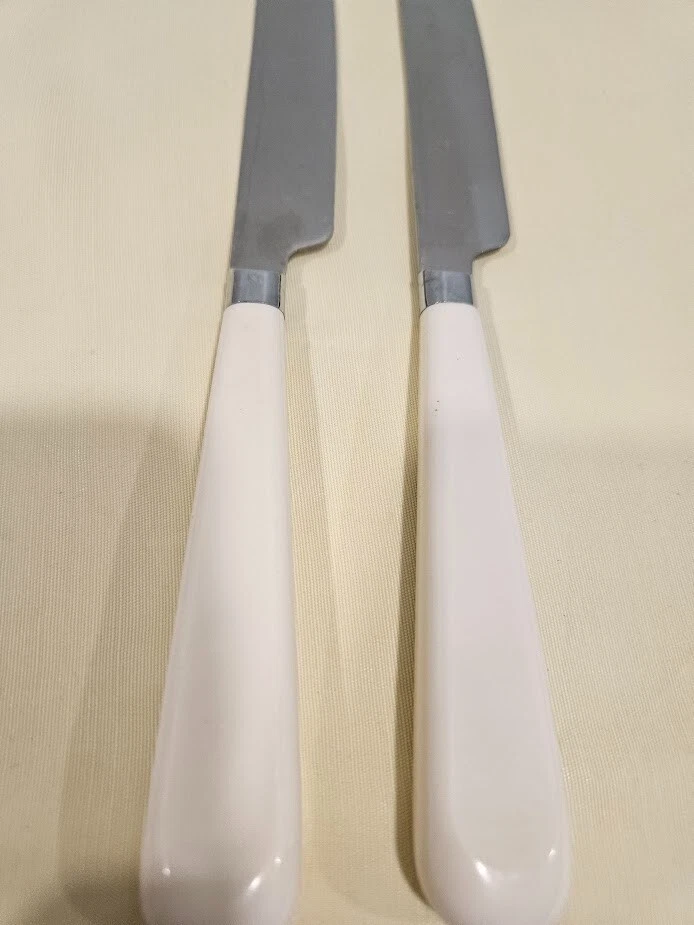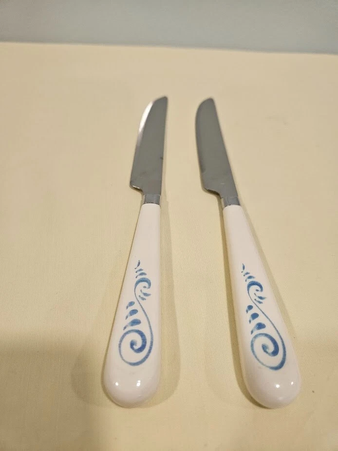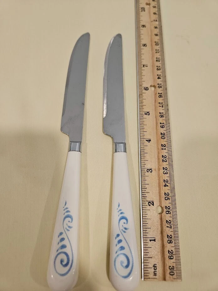 Origin: America MPN: 24-06-193 gtin13: Does not apply Color: White & Blue Time Period Manufactured: 1970-1979 Country/Region of Manufacture: China Year Manufactured: 1975 Made in: China Product Line: Corning Corelle Type: Dinner Knives Brand: Corelle Features: Dishwasher Safe Finish: Matte Number of Items in Set: Two-Piece Vintage: Yes Care Instructions: Machine washible Set Includes: Knife Occasion: Anniversary, Baby Shower, Bachelorette Party, Bachelor Party, All Occasions Style: Retro Department: Adult Shape: Straight Theme: Ocean Era: Late 20th Century (1970-1999) Pattern: Oceanview Antique: No UPC: Does not apply Material: Stainless Steel & Plastic Handmade: No