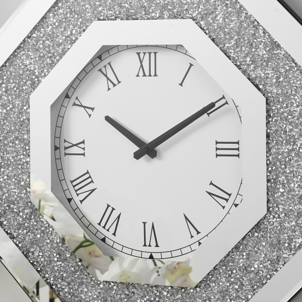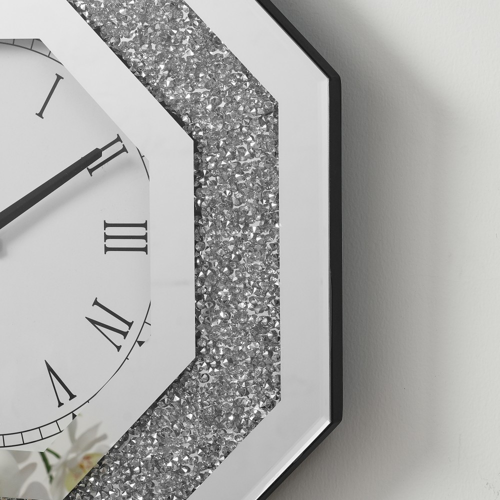 Octagonal Mirror Wall Clocks and Artificial Gemstone Wall Clocks Product Description Elevate your home decor with this stunning octagonal mirror wall clock, a perfect blend of glamour and modern style that’s sure to become the focal point of any living room, bedroom, or hallway. Designed with a sleek, eye-catching aesthetic, this clock combines functional timekeeping with decorative charm, making it an ideal addition to any contemporary or glamorous space. Crafted from high-quality MDF and glass, this wall clock boasts durability and a refined look, while the acrylic filling adds a lightweight yet sturdy feel. The elegant silver finish complements a wide range of decor styles, from modern minimalist to luxurious glamour, effortlessly enhancing the beauty of your home. Featuring a striking octagonal frame adorned with sparkling floating artificial gemstones set against a sleek black background around the clock face, this piece exudes sophistication and elegance. The clock face is designed with classic Roman numerals, offering a timeless touch that balances simplicity and modernity, ensuring easy readability while adding a touch of refinement. ### Product Specifications Assembled Dimensions: 20.00 inches (L) x 20.00 inches (W) x 1.50 inches (H) Assembled Weight: 3.00 lbs Packaging Dimensions: 24.80 inches (L) x 24.80 inches (W) x 5.90 inches (H) Packaging Weight: 4.00 lbs Style: Glam, Modern Included in Package: 1 x Wall Clock ### After-Sales Guarantee We stand behind the quality of our products. This wall clock comes with a 1-Year Quality Warranty, ensuring peace of mind for your purchase. Additionally, we offer a 30-Day Free Return & Exchange Policy – if you’re not completely satisfied with your clock, you can return or exchange it within 30 days of receipt, no questions asked.