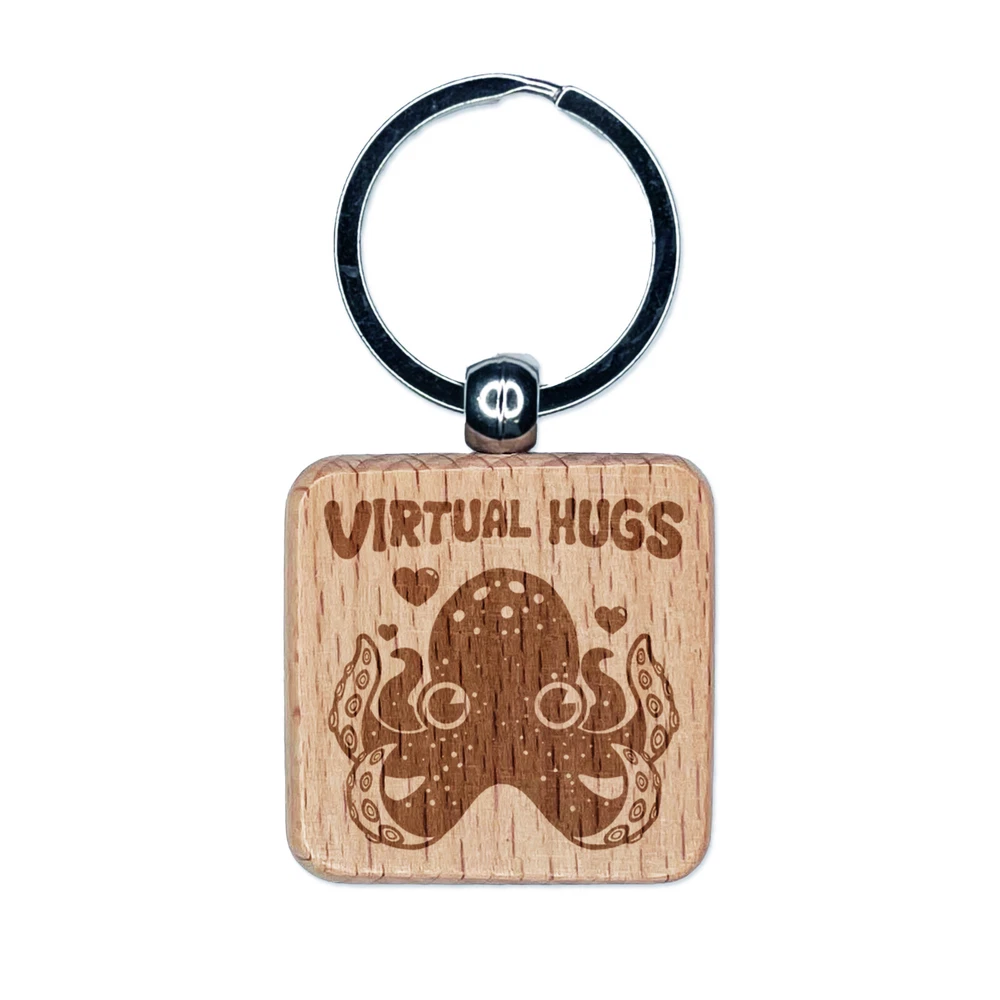 Octopus Virtual Hugs Engraved Wood Square Keychain Tag Charm