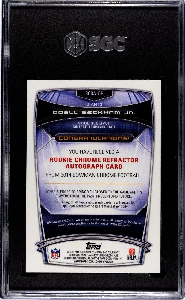 Card Attributes:RefractorFeatures:RookieSport:FootballAutograph Authentication:Beckett AuthenticationTeam:Cleveland Browns, Los Angeles Rams, New York GiantsPlayer/Athlete:Odell Beckham Jr.Player:Odell Beckham Jr.Year:2014Year Manufactured:2014Type:Sports Trading CardAutograph Format:Hard SignedSet:2014 Bowman ChromeSigned By:Odell BeckhamLeague:National Football League (NFL)Manufacturer:BowmanOriginal/Reprint:OriginalSeason:2014Parallel/Variety:RefractorAutographed:Yes
