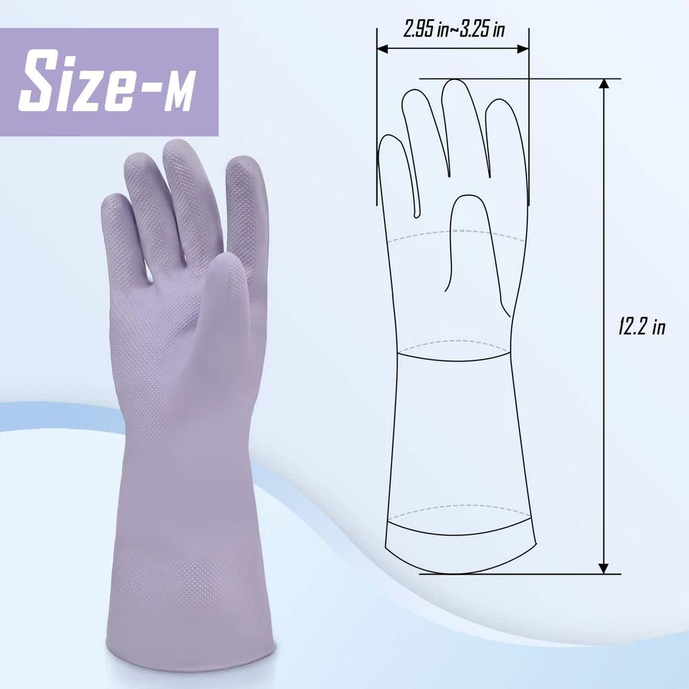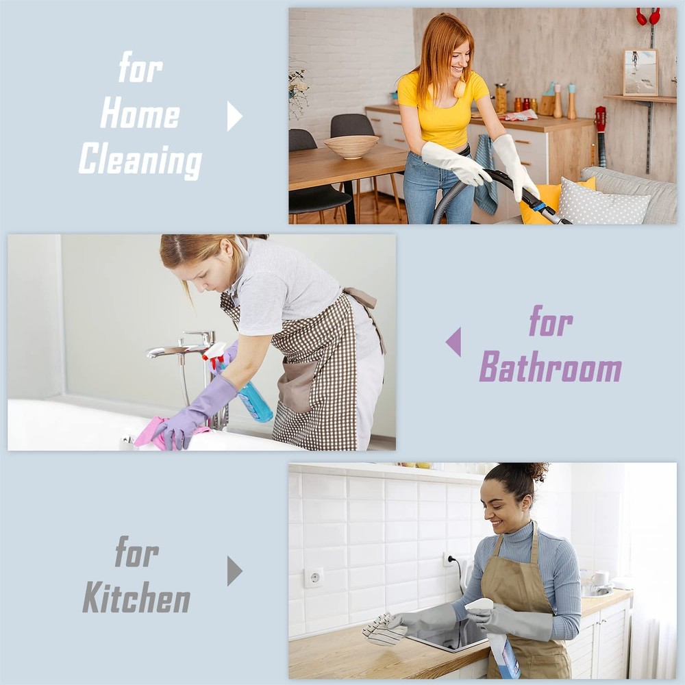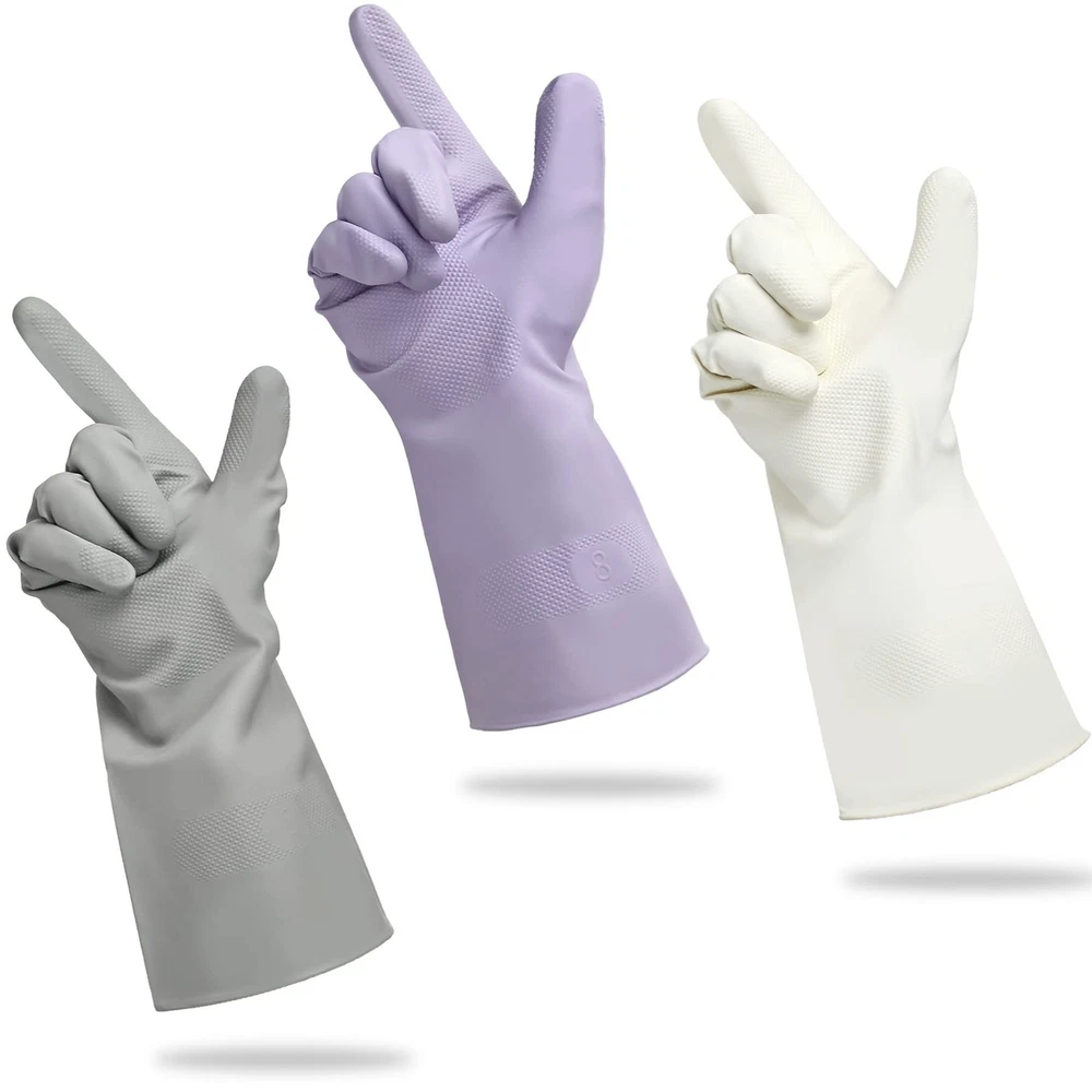 If you were tired of the rubber smell of your gloves after using them, you might need the odorless rubber gloves. If you were always seeking reusable gloves for different cleaning needs, you might need the gloves set with 3 colors. synthetic rubber gloves are made of Nitrile, which is combined with natural rubber and synthetic rubber that is latex-free and odorless. They are available for people who can’t use nature rubber gloves. We designed the gloves with 3 different colors that are great for your different daily needs like dishwashing, bathroom cleaning, or just for backup; you don’t have to worry about mixing due to the assorted colors design. The lightweight design makes them great for delicate works like gardening or car washing. You could feel your hands well when you wear them. The material makes them stay longer than natural rubber so that they won’t crack like the cheaply made gloves after many days of use. They may last more than a year, as some shoppers said. Odorless Rubber Gloves - The gloves are made of natural rubber with synthetic rubber, which makes the gloves odorless that you don’t have to worry about the rubber smell leaving on your hands 3 Pairs of Cleaning Gloves with 3 colors - The rubber cleaning gloves are consist of 3 pairs of gloves with different colors (Lilac, Grey and White) that you could use for different ways like kitchen cleaning, bathroom cleaning, or household cleaning Reusable Latex-free Gloves - These gloves are latex-free, which is available for people who can’t wear gloves made of natural rubber Lightweight but Durable - We combined the durability and Easy operation that you could feel your hands well while using them due to the high flexibility. Besides, they are long-lasting which you could quote other shoppers, they will last more than a year Well-considered Details - There are more than thousands of textured points on the palms and fingers for better grabbing, and the curled inward design of the bottom makes the gloves tear-resistant during using