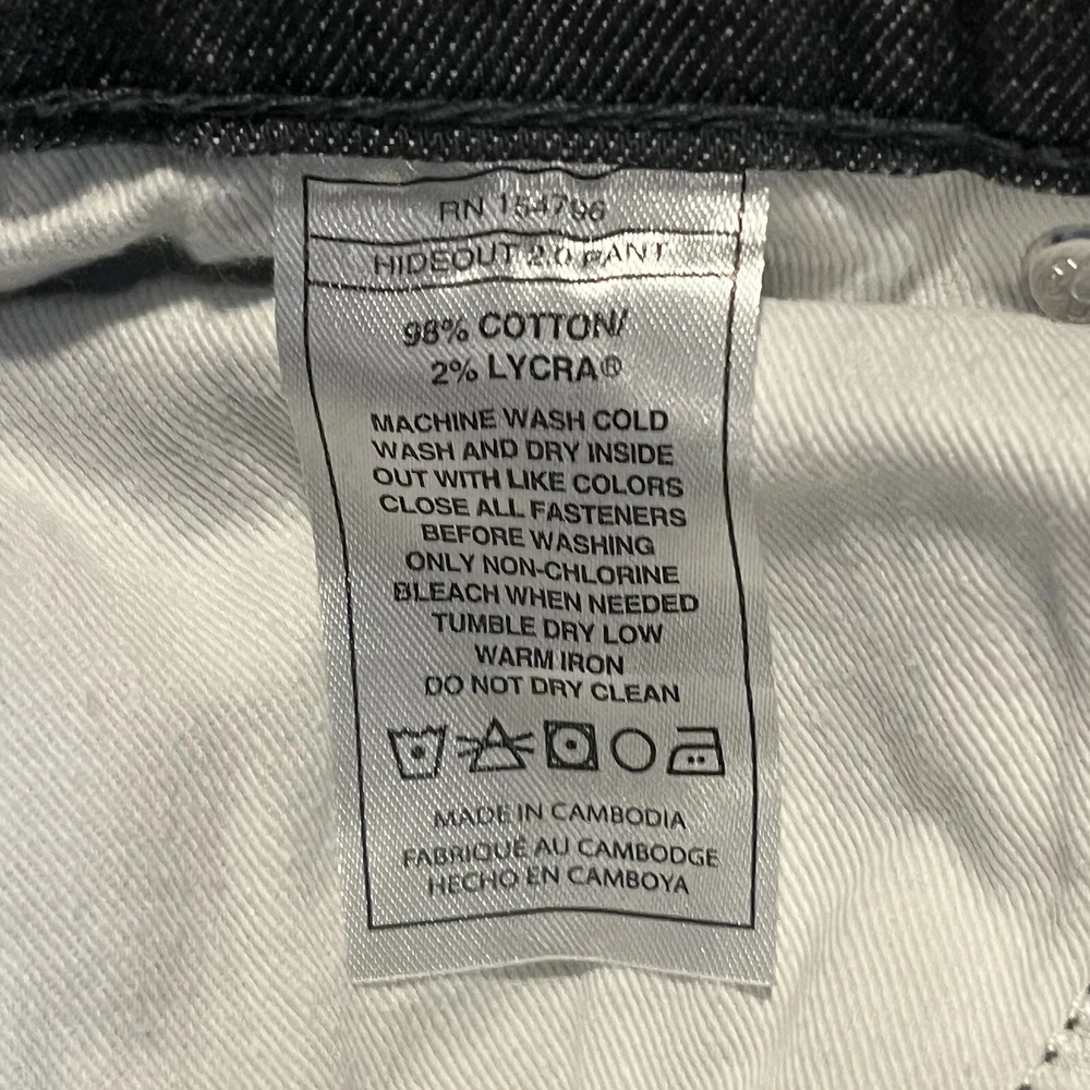 Personalize: No Closure: Button, Zip Type: Jeans Rise: Low (8-10 in) Model: Hideout Pant 2.0 Waist Size: 31 in Department: Men Theme: Workwear Pocket Type: 5-Pocket Design Country/Region of Manufacture: Cambodia Product Line: Off The Grid Hideout Pant Season: Fall, Spring, Summer, Winter Fit: Regular Accents: Logo Size Type: Regular Vintage: No Fabric Wash: Medium UPC: Does not apply Pattern: Solid Garment Care: Machine Washable Features: Easy Care, Pockets, Stretch Style: Tapered Color: Black Inseam: 32 in Size: 31 Material: Cotton, Lycra gtin13: Does not apply Handmade: No Fabric Type: Denim Brand: Off the Grid