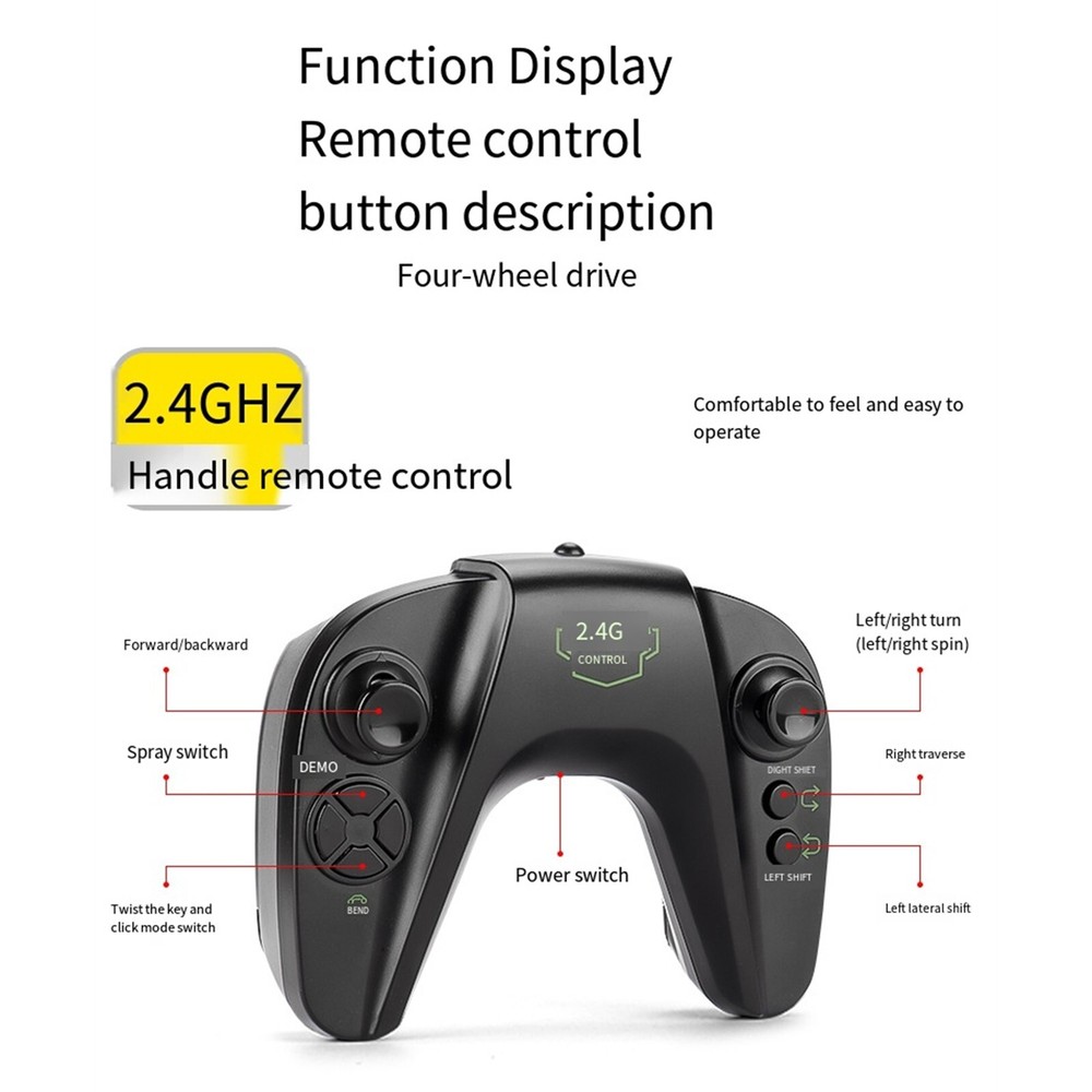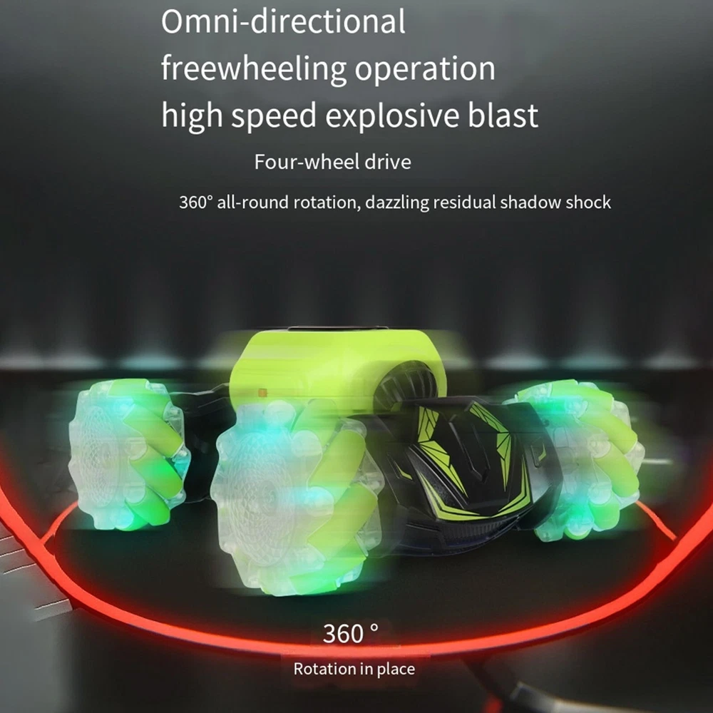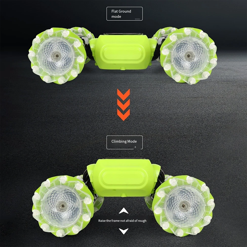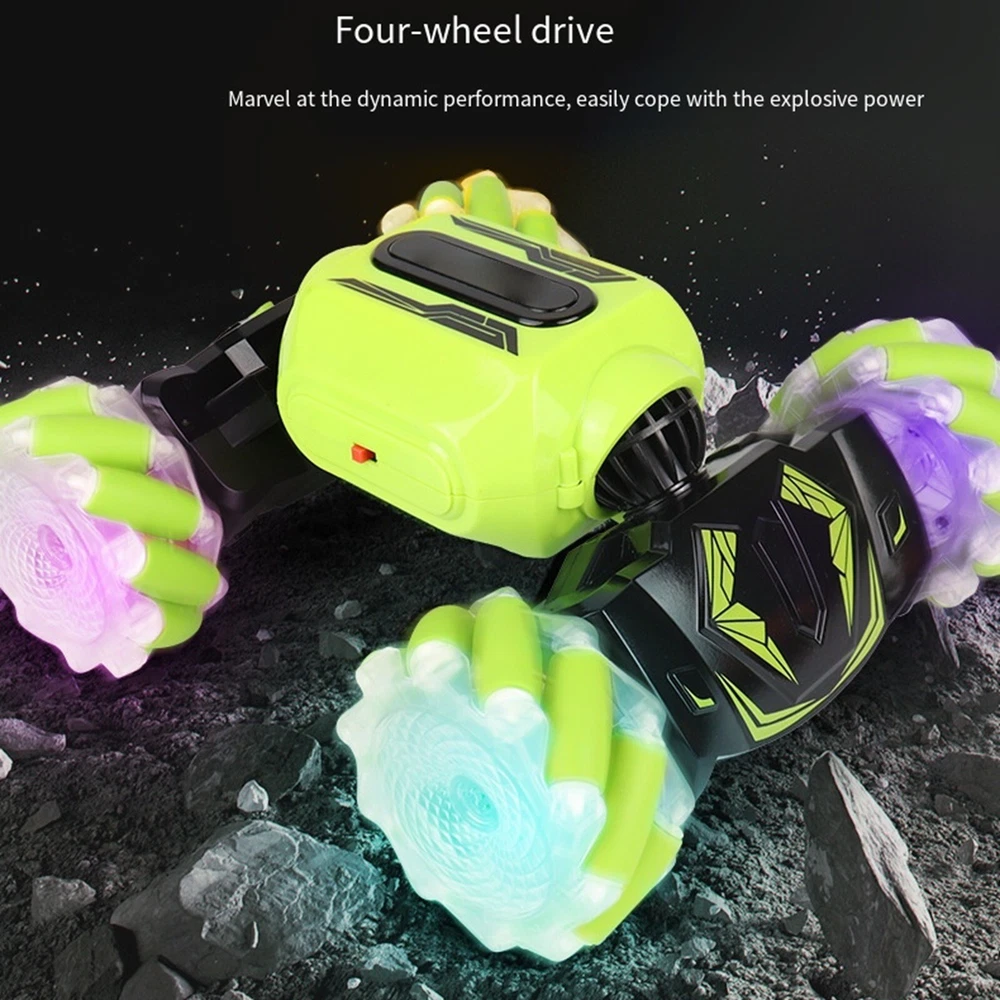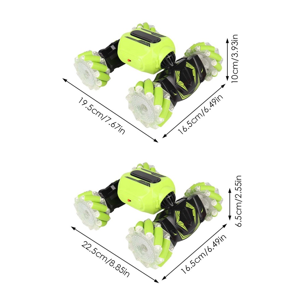 All-Terrain Remote Control Stunt Off-Road Toy Car, 2 Control Modes RC Car Features: Remote control, stunning lights and sounds, the tiger whistle for an adventure with real car sounds. 2.4 radio system: -interference ability, can race on the same track at the same . 100 metres distance, race. TWO MODES OF CONTROL: One mode is to wear the watch on your hand and control the stunt car by changing gestures such as forward, backward, left/right turn, flip driving and high body change. The other is to use the remote control to make the car drive the way you want. ONE- TRANSFORMATION FOR ON-ROAD AND OFF-ROAD: The transformable body makes the vehicle more flexible and suitable for all terrains. Drive on grass, sand, rocks, rough roads and other terrains. LATERAL DRIVING DESIGN: This drift car features a special double-sided rolling style that allows for quick lateral movement or in place.The 4-wheel drive and transformable body system makes the vehicle more agile and delivers great power torque to drive on any with ease.The 4-wheel drive and transformable body system makes the vehicle more agile and delivers great power torque to drive on any with ease. Product Description: All-Terrain Remote Control Stunt Off-Road Toy Car, 2 Control Modes RC Car Material: ABS Color: as the picture shows, (Due to the difference between different monitors, the picture may have slight color difference. please make sure you do not mind before ordering, Thank you!) Package weight: 700g Package size: 22.5x16.5x6.5cm,(Please allow 1-3mm error due to manual measurement. please make sure you do not mind before ordering.)