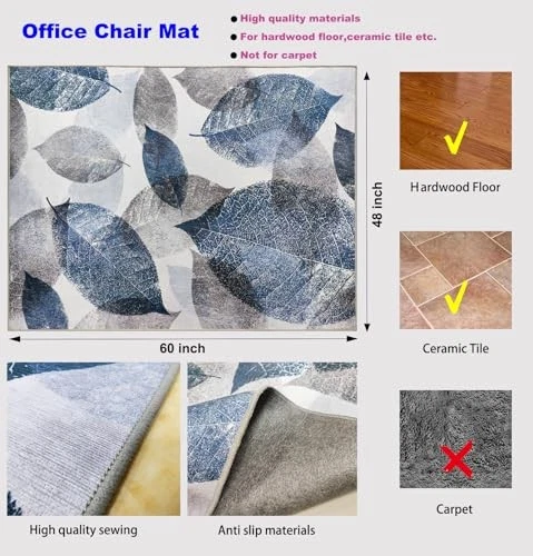 Menu 1. We require immediate payment. 2. We currently accept payment via eBay managed payments only. 3. Once payment is cleared, we will dispatch your shipment within 1-3 business days. Please refer to the "Shipping" tab for more information regarding shipping speed to your destination. Office Chair Mat for Hardwood Floor, 60"x48" Office Rug Easy to Move,Floor Mat for Office Chair,Rolling Chair Mat - Office Home Anti-Slip Desk Chair Mat for Laminate/Tile Floor, Blue Leaf Product description 【Anti-slip Design】This chair mat for hardwood floor features a unique design that allows the chair mats itself to securely stay in place on hardwood floors. The bottom of the office floor mat is textured with a grid backing material, ensuring a firm grip on most hard floor surfaces, preventing slipping or sliding. The special bottom material leaves no traces on the floor. 【Smooth Sliding + Reduce Noise】 The surface material of the office chair mat for hardwoodfloor is made of ultra-short polyster pile,constructed from precious materials, allowing your chair wheels to glide seamlessly on floor mat for office chair sturdy surface without scratching, sinking, or leaving indentations. Using this office rug helps reduce the noise of rolling chairs, making your work or gaming experience more comfortable. 【Floor Protection Enhancement】 Our desk chair mat with a thickness of approximately 0.39mm, effectively safeguards floors from imprints and general wear; due to the desk floor mat substantial thickness, the chair mat offers dual protection for any hard floors, aiding in keeping the floor looking fresh. 【Foldable Chair Mat】 Our computer chair mat has a highly elastic and soft surface. When you need to move or store the rolling chair mat, you can fold the office mat. Upon reusing the desk rug, the folds quickly return to a smooth and flat state sometime later and ad well to the floor, preventing the rolling chair mat for hardwood from easily curling up. 【Easy to Clean】 The office chair mat for hardwood floor does not produce lint and is as easy to clean as regular flooring. You can use a broom, vacuum cleaner, washing machine or vacuum robot for cleaning. The desk mat won't tear, crack, curl, break, scratch, or discolor. Tfore, you don't need to spend a lot of effort to maintain this desk floor mat, and the desk mat for chair won't leave any residue on the floor. PLEASE MESSAGE US IF YOU HAVE ANY OTHER QUESTIONS, AND MANY THANKS FOR READING ALL OF THIS. Copyright ©#. All Rights Reserved.