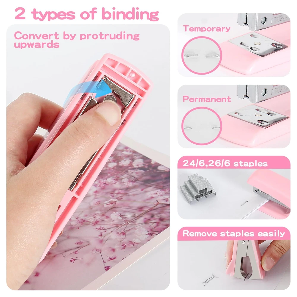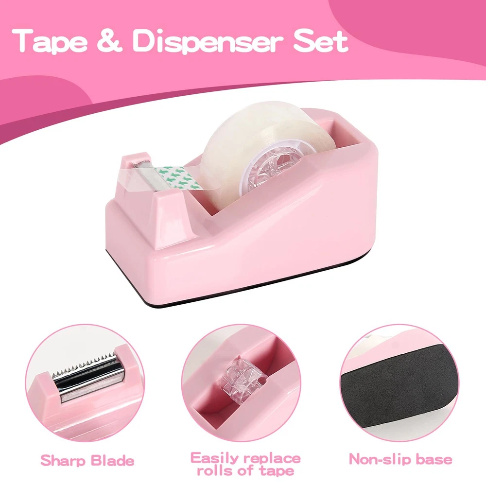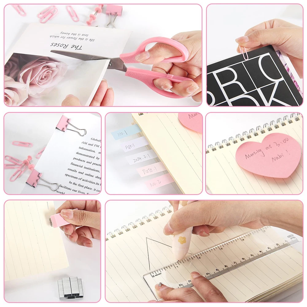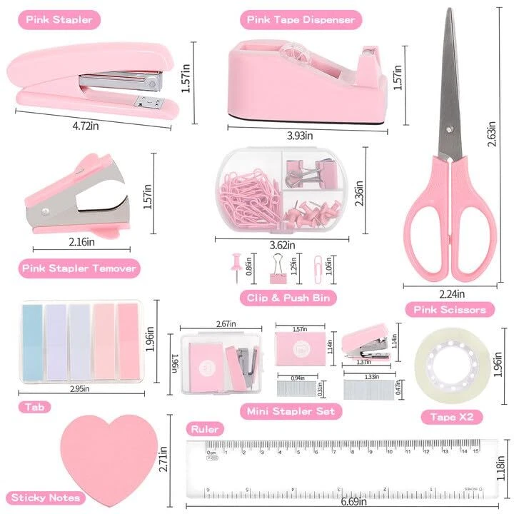 1x pink stapler, 1x staple remover, 1000x staples, 1x mini stapler (with staples), 1 x tape holder, 2x transparent tape, 1x ruler, 1 x 0ffice scissor, 3 x clips, 10 x push pins, 1 box of paper clip, 5 colors sticky tabs, 1x love shaped sticky notes. CHIC PINK OFFICE SUPPLIES: Transform your workspace with our stylish pink office supplies! This complete set brings a vibrant touch to your desk decor for women, making work enjoyable and aesthetically pleasing. CUTE & FUNCTIONAL OFFICE ESSENTIALS: Stapler and tape dispenser sets are mainly made of plastic, sturdy and reliable, and not easy to break. With a beautiful appearance, they are ideal for desktop office, home, and daily use. ALL-IN-ONE DESK SUPPLIES SET: Say goodbye to clutter! Our office supplies set includes everything from a pink stapler to sticky tabs, ensuring you have all the essentials you need right at your fingertips. DESK DECOR FOR WOMEN: This pink office set is rich in content and perfect for your desk, improving your productivity and making your office or study convenient and efficient. No need to rush to find anything; everything you need is at your fingertips, enhancing your learning and work efficiency. STYLISH OFFICE DESK ACCESSORIES: Elevate your workspace with our chic pink office supplies, designed to add a touch of personality and style to your office decor. Perfect for women who appreciate cute desk accessories. CUTE OFFICE SUPPLIES FOR EVERYONE: Whether you're a student or a professional, our pink school supplies are the perfect addition to your study sessions or work duties, marrying cuteness with practicality. GREAT GIFT IDEA: This desktop office supplies set contains commonly used tools for study and work, suitable for schools, offices, conference rooms, and many other occasions. They also make wonderful birthday gifts, holiday gifts, or New Year gifts for children, friends, students, and family. PERFECT GIFTS FOR HER: Looking for a thoughtful gift? This pink desk accessories set is the ideal present for students or professionals who appreciate cute office supplies and stylish desk accessories. OFFICE SUPPLIES SET: 1× pink stapler, 1× staple remover, 1000× staples, 1× mini stapler (with staples), 1× tape holder, 2× transparent tape, 1× ruler, 1× office scissors, 3× clips, 10× push pins, 1 box of paper clips, 5 colors of sticky tabs, and 1 love-shaped sticky note. IDEAL FOR VARIOUS SETTINGS: This pink office stationery set is perfect for home, office, classrooms, and more — whether placed on a desktop, dresser, coffee table, or shelf.