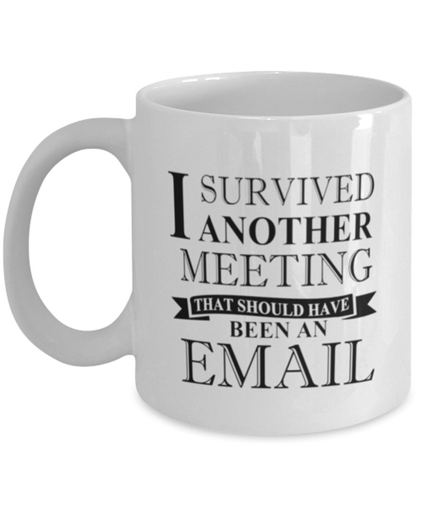 Office Funny Coffee Mug I Survived Another Meeting That Should Have Been An Mug Product Details.. This high quality 11oz. ceramic white mug has a premium hard coat that provides crisp and vibrant color reproduction sure to last for years. Perfect for all hot & cold beverages. The highest quality printing possible is used. It will never fade no matter how many times you wash it. Material: 100% Ceramic. Print both sides. Dishwasher and Microwave Safe. High Gloss + Premium White Finish. Printed in the U.S.A. Personalized & Custom. We support personalized and custom mug to add custom, when placing an order, you can add notes to the "order note" in shipping address section. Also you can contact us directly via message. Shipping Info. Ready to ship in 1 to 2 business days, All products are made-to-order and proudly printed in the United States. Shipped by USPS and DHL, You will receive your order in 5-7 days. Replace & Refund. All products are defective during shipping broken, chipped will be replaced free of charge. You are not satisfied with the product, we will refund 100% money to you. If any other issues arise, please do not hesitate to message, we would be more than happy to assist you.