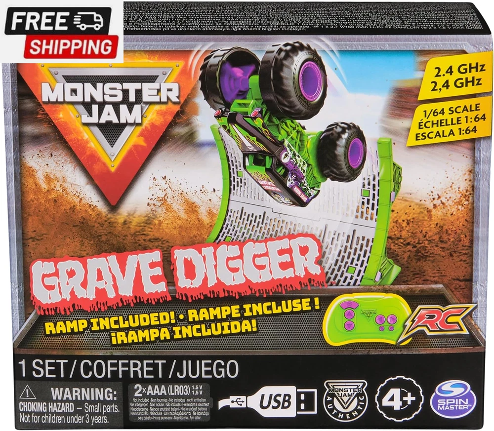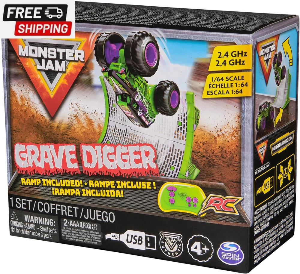 Official Grave Digger Remote Control Monster Truck with Ramp, Small 1:64 Scale RC Cars Kids Toys for Boys and Girls Ages 3 4 5 6 and Up OFFICIAL GRAVE DIGGER: This realistic 1:64 scale (3.9 inches) Grave Digger RC truck looks likes the real thing and comes with a controller & a USB cable to recharge the toy truck. Controller requires 2 AAA batteries (not included) INCLUDES RAMP: Turn any space into a Monster Jam arena with the included ramp. Perform epic stunts and back flips with your Monster Jam truck. Featuring authentic graphics, oversized tires, and highly realistic details TURBO BOOST: Speed into the Monster Jam action with turbo boost mode Launch Grave Digger onto the ramp or into action READY TO ROLL : This fully functional RC monster truck features a dual-joystick controller with 2.4 GHz frequency that provides a range of up to 100ft & allows you to race up to 6 monster trucks at a time GIFT FOR KIDS: Monster trucks for boys and girls ages 4 5 6 7 and up. Monster Jam toys, playsets, toy cars and RC trucks are at the top of birthday, holiday toys & games wish lists Includes: 1 x Monster Truck, 1 x Controller, 1 Ramp, 1 x USB Charging, 1 x Instruction Guide, Cable Covered by the Spin Master Care Commitment. See below for full details Be in control of one of the most celebrated Monster Jam trucks of all time! Introducing the all-new, official Monster Jam 1:64 scale Grave Digger RC! Drive this compact but formidable remote control monster truck to the limit and perform epic stunts and backflips using the included ramp! Featuring a 2.4 GHz remote control, you can race up to 6 Monster Jam trucks with your friends and host your very own indoor Monster Jam rally! And with an extended range, this USB-rechargeable truck will transform your space into a Monster Jam arena! This 1:64 scale Grave Digger RC truck comes with a controller, a USB cable to recharge the toy truck, and a ramp to execute awe-inspiring stunts! Power up your Monster Jam truck whether it's on or off. This offers a wonderful alternative to a rc car, rc plane, remote control boat, remote control helicopter, and other rc trucks. Expand your Monster Jam collection with Grave Digger, Megalodon, El Toro Loco, and more! Monster Jam toys like remote control cars and toy trucks are the prime gifts as girl and boy toys, ages 3 and up. You’ve never been closer to the action than with the 1:64 scale Grave Digger RC! Shipping Fast shipping is very important for us. Our standard US shipping service is FREE. Your order will be shipped within 2-3 business days upon full payment received. Your order will be delivered within 2-3 business days after the handling time. We only ship to the confirmed PayPal address. We reserve the right to cancel any order for any reason at any time. We are not responsible for undeliverable addresses. Returns and payment We offer a 30 days return policy from checkout winning date. We allow only PayPal as payment method FeedBack Your feedback very important to us, after you get your package and you are satisfied with our service please leave us positive feedback If you have any problem with your order / any questions please before leave any type of feedback For any questions, using eBay contact system Please visit our eBay store to check out other items for sale! Thank you for shopping at our store.