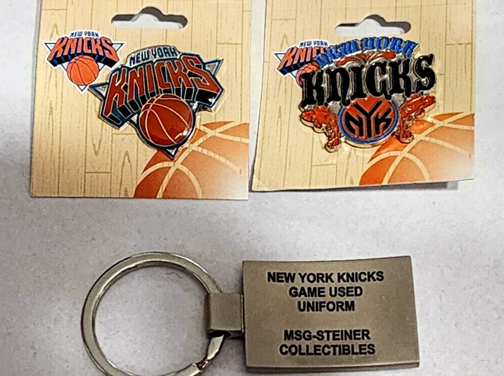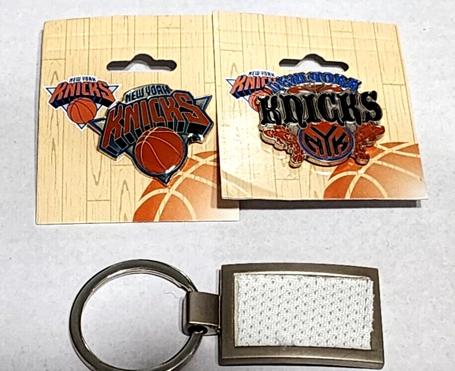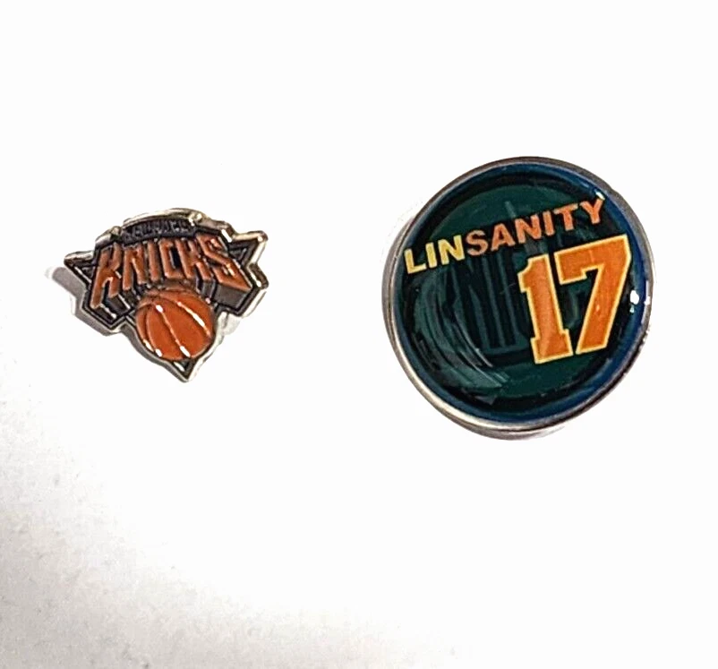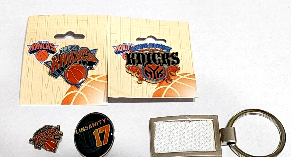 Show your love for the New York Knicks with this set of 4 official NBA pins and 1 collectible key ring from Steiner Sports. The pins feature the iconic Knicks logo and are perfect for displaying on your backpack or hat. The key ring is made with game-used uniform material, adding a unique touch to your collection. This set is a must-have for any Knicks fan and is officially licensed by the NBA. It's the perfect accessory to show off your team spirit and support for the Knicks during the regular season. Get your hands on this set today and add it to your collection. The LINSANITY #17 pin for the great memories the NY Knicks Fans had! Loc. S1-FF