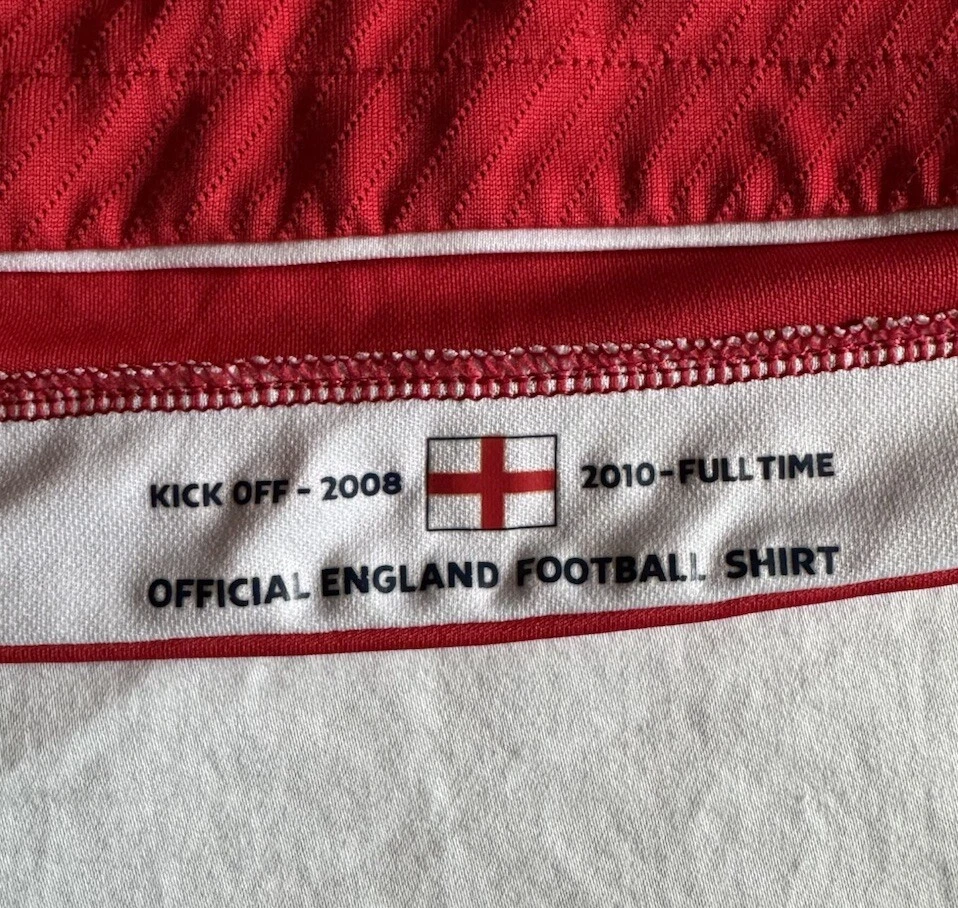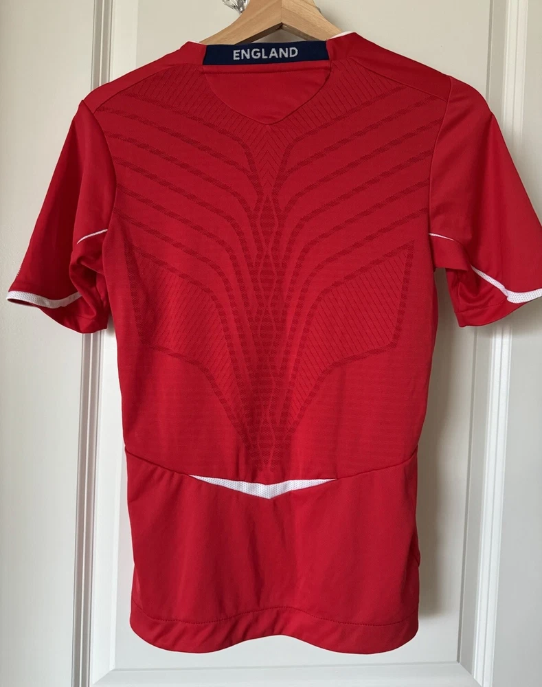 This is an official Umbro England soccer jersey from 2008-2010, designed for women in US size 4. The jersey is in very good condition and features a red, white and blue color scheme. It is officially licensed and perfect for fans of the England national soccer team.