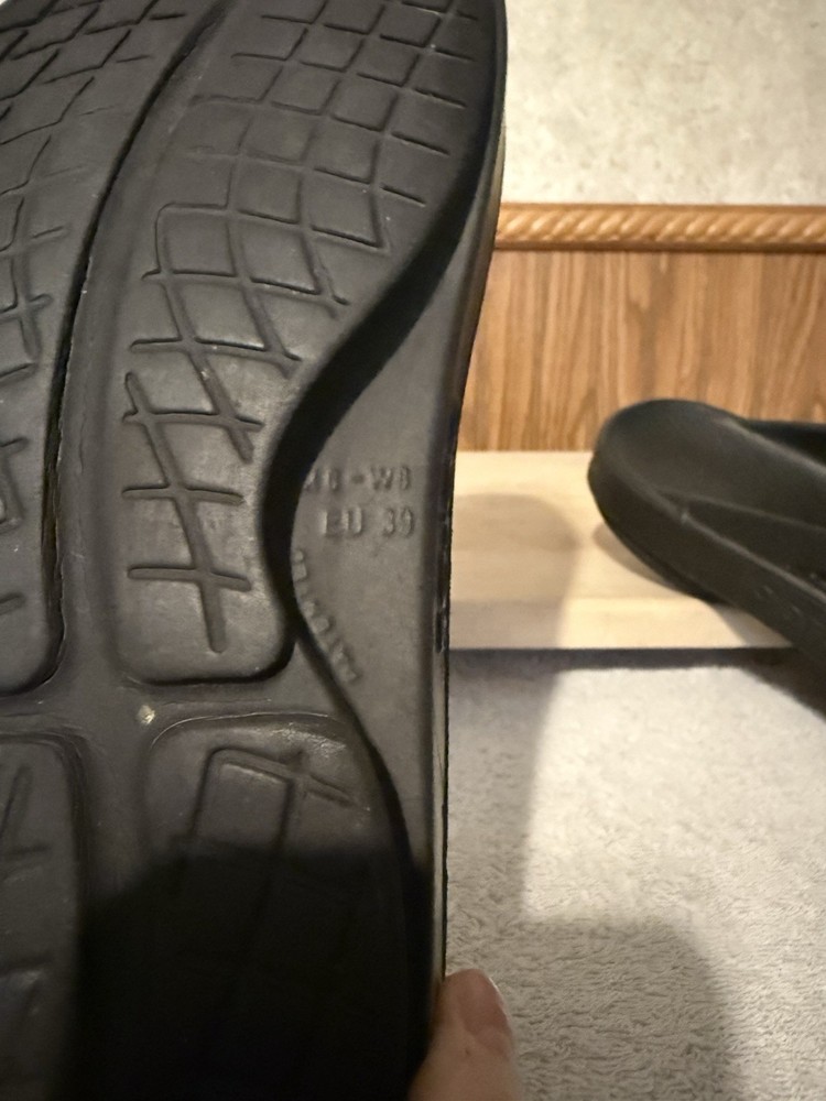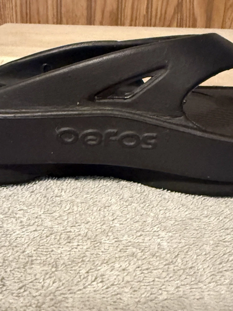Explore the blend of comfort and style with these OOFOS unisex black flip flops, perfect for both casual wear and athleisure activities. Designed with a sleek rubber upper and a versatile black hue, these sandals easily transition from a day at the beach to a bike ride around town. Offering a low heel height for all-day wearability, these size 6 men (size 8 women, EU 39) sandals boast a durable construction made for the young and young at heart. Whether it's a laid-back day or a casual outing, these OOFOS flip flops deliver on both comfort and style.