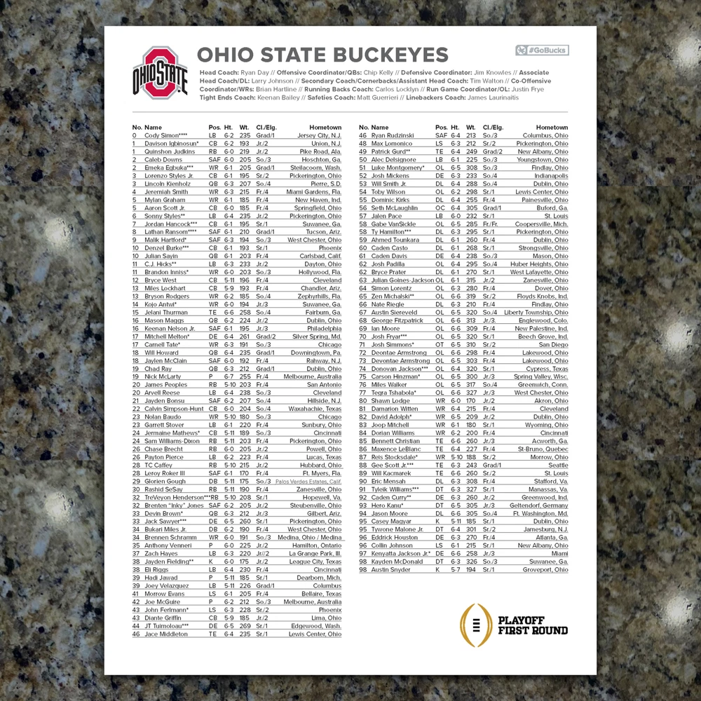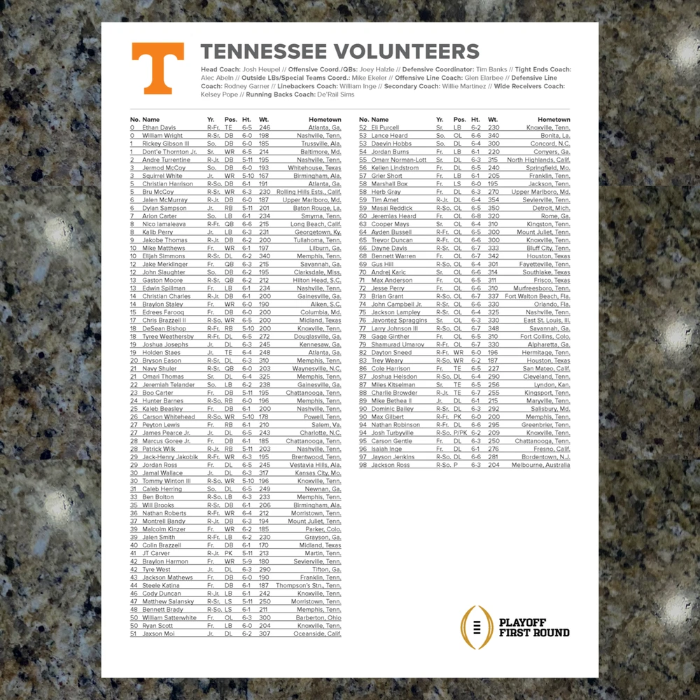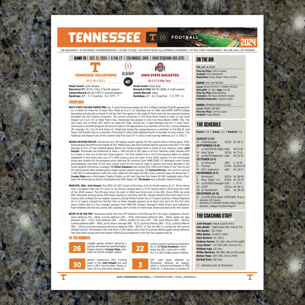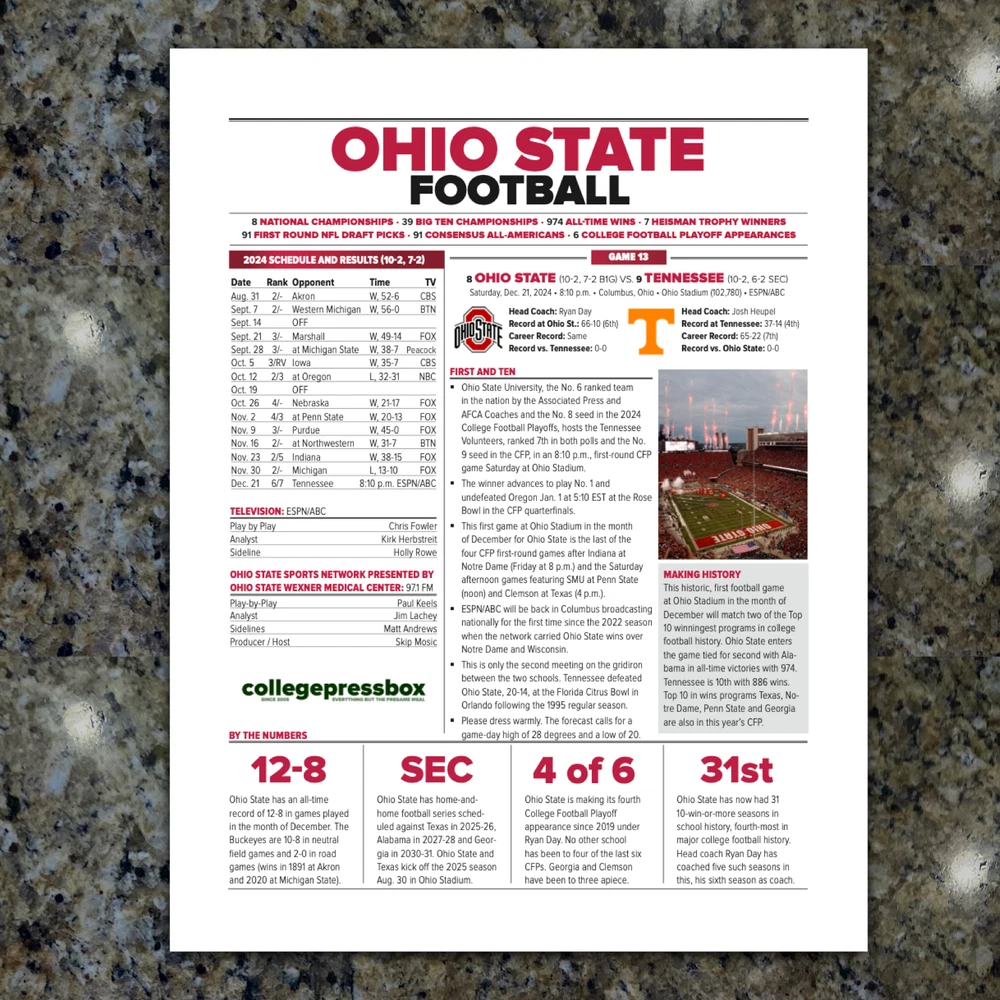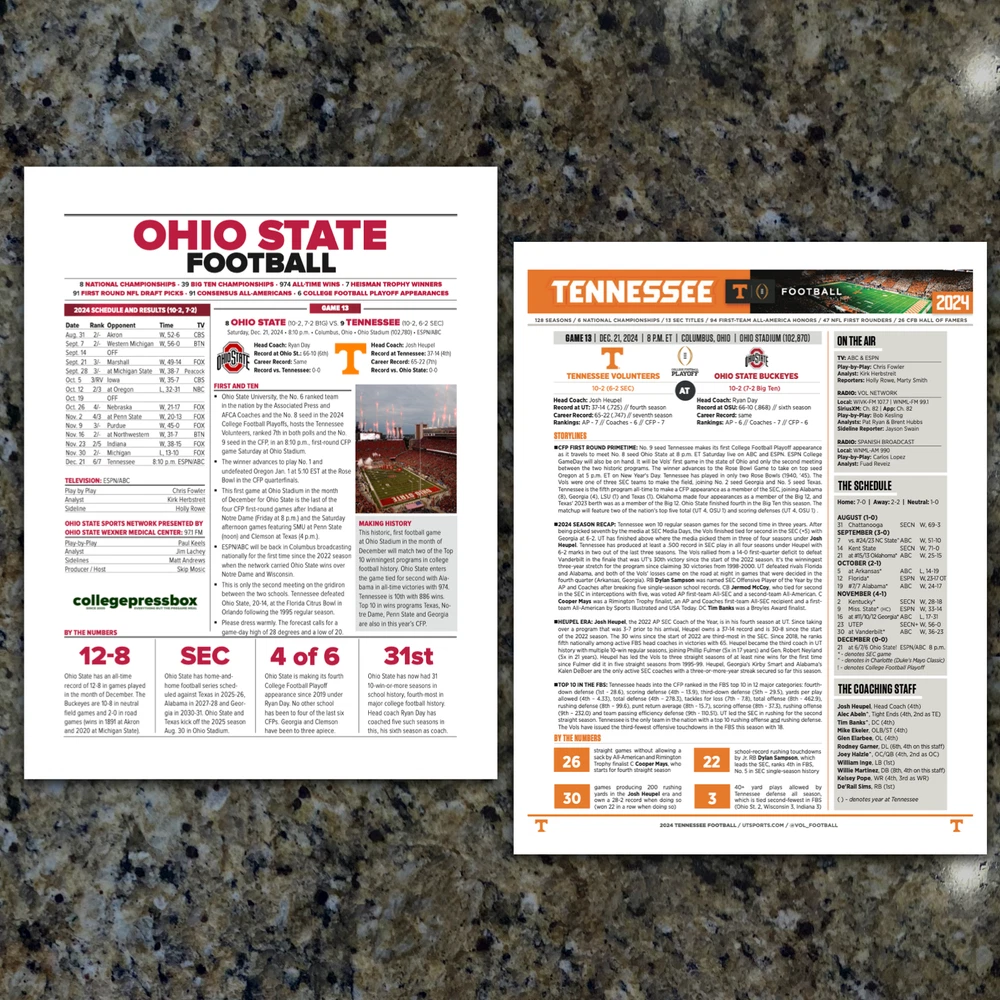 For sale, the game issued Flipcard and team program notes for the College Football Playoff - Round One Game - Ohio State vs Tennessee at Ohio Stadium in Columbus. Only given to media and broadcast for the game. History! GAME: CFP - Round One - Ohio State vs Tennessee DATE: December 21, 2024 TEAMS: Tennessee vs Ohio State STADIUM: Ohio Stadium (102,780) LOCATION: Columbus, Ohio What You Get: 1. (1) - Game Flipcard - 11x17 - Ohio State vs Tennessee 2. (1) Ohio State Football Media Program Sheet - 8.5x11" - 1-page 3. (1) Tennessee Football Media Program Sheet - 8.5x11" - 1-page 4. Rigid Plastic protector - 11x17"