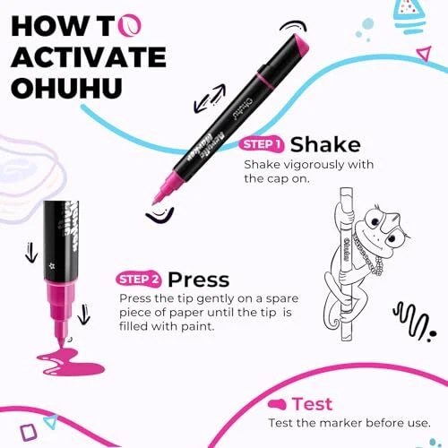 DUAL MEDIUM ROUND & FINE TIPS: Double the tips, double the possibilities. Each acrylic paint markers features two different tips - 0.7-2mm fine tip and 1.7-3mm round tip. Just use the round tips for large swaths of color and the fine tips for delicate details, like outlining and embellishing. 30 UNIQUE VIBRANT COLORS: Each set includes 15 basic colors, 9 metallic colors and 6 fluorescent colors for your unlimited and imaginative creation. 9 special metallic colors for shining and embellishment can be used to draw flowers or people, such as eye shadows and makeup. Whether you're an illustrator, craft addict, or a DIY enthusiast, the Ohuhu 30-color paint pens has got you covered! HIGH OPACITY: With vibrant and concentrated water-based ink, Ohuhu acrylic pens are non-toxic, odorless and draws smoothly, enabling you to easily layer with high opacity. Highly suitable for budding beginners or seasoned artists. WATERPROOF & LIGHTFAST: With the ink's water-resistance and sun-resistance properties, you can create art masterpieces that never fade. The ideal choice for longer-term art projects like graffiti, marking, painting, coloring and more! WORK ON ASSORTED SURFACES: Let your imagination run wild with the Ohuhu 30 pc. dual tip rock painting pens! You can draw on a variety of surfaces, from rocks, stones, wood, fabric, ceramic, mugs, glasses, plastic, paper, eggs, canvas! SHAKE WELL BEFORE USE: Using the acrylic paint markers for wood is as easy as it can be! Just shake the barrel, press the tip and you're good to go! Remember to cap your marker after each use to prevent the ink from drying. Comes with 8 extra tips (5 round tips and 3 fine tips) for your convenience.