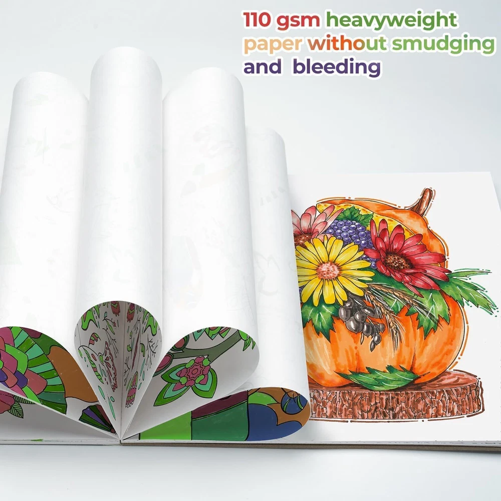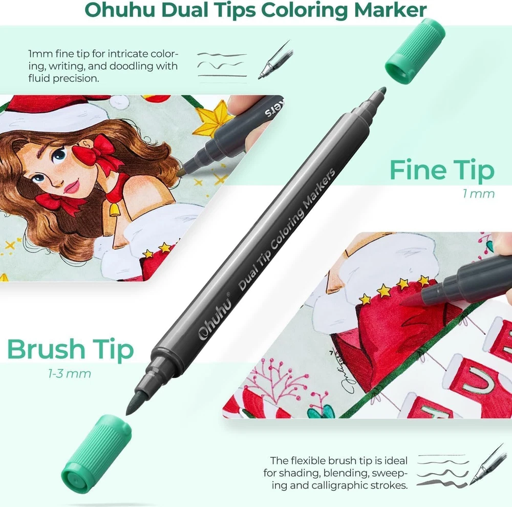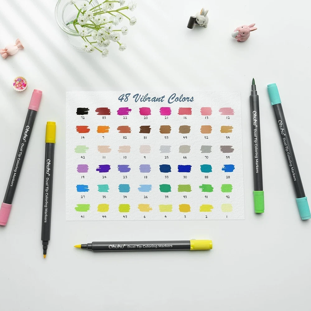 DELUXE COLORING BOOK: Make your artwork come to life! Ohuhu coloring book comes with 36 pieces of 110 gsm bleed-proof heavyweight paper that prevent smudging, bleeding, and feathering for clean artwork. Measuring 8.5 by 8.5 inches, the book provides ample space for your imagination to run wild. Plus, to find out the best color combo, you can try on the corresponding scale-down templates first! DUAL TIPS, DUAL POSSIBILITIES: We know your creativity is limitless, and Ohuhu drawing pens are here to help you unleash it with double wear-resistant tips—brush and fine! The 1mm fine tip can glide through the details for intricate coloring, writing, and doodling, while the 1-3mm flexible brush tip flows through the large area art projects for shading, coloring, blending, and more. 48 HIGHLY PIGMENTED COLORS: There are more one-of-a-kind artworks than ever thanks to the 48 vibrant color choices! The basic colors and skin tone colors go hand in hand to work out the best color scheme for your drawing, coloring, sketching, doodling, etc. Better yet, the color-coded and printed color number allows you to spot your desired color in a breeze. WATER-BASED INK, QUICK-DRY AND NON-BLEEDING: Ohuhu water-based ink covers all the features that a decent ink needs: sustainable, non-toxic, safe,quick-dry, non-bleeding and conforms with ASTM D-4236. Ohuhu marker pens are safe for your paper sheet and yourself. In addition, 2.2g large capacity of the ink and smooth ink flow ensure your imagination never misses a beat! ALMIGHTY GIFT: Ohuhu coloring book & art pens is your passport to an artistic wonderland that knows no bounds! Ohuhu marker set is perfect for calligraphy, planners, scrapbooks, posters, artist decoration and more. For effortless organizing and storage, we’ve adopted sustainable paper package and included recyclable marker tray--- no more marker clutter!