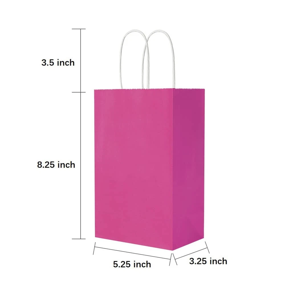 Oikss Each 100 Pack Small Blue & Fuchsia Kraft Paper Gift Bags with Handles Bulk Product Details Brand: Oikss Occasion: Wedding, Birthday, Valentine's Day Theme: Patterns Number of Items: 100 Unit Count: 100.0 Count Pattern: Solid Size: Inches Total Eaches: 100 Item Form: Bag Style: Each 100 Pack Small Blue & Fuchsia Kraft Paper Gift Bag Date First Available: September 15, 2022 Quantity: Contains 100 pack small blue gift paper bags and 100 pack small fuchsia kraft paper bags. Gift Bags Small Size: 5.25 inches long, 3.25 inches wide, 8.25 inches high kraft paper bag with 3.5 inches handle. Very suitable for Valentine's Day gift bags, shopping bags, holiday gift bags, party gift bags, retail bags, commodity bags and wedding welcome bags. Eco-friendly Paper Bags: This kraft paper bags are made of 100% Recycled Paper, which are bio-degradable and recyclable, no peculiar smell and look a lot classier as gifts bags. It can be used in many field, including wholesale and retail. Unleash Your Creativity: There are no words and patterns on the gift paper bag, you can add the words and patterns you want on it, you can DIY by yourself. Give full play to your imagination and release your creativity. Service Quality Assurance: We attach importance to service and product quality, and it is our job to make every customer satisfied. If you are not satisfied with our products or have any other questions, please contact us via email and we will serve you wholeheartedly. Each 100 Pack Small Blue & Fuchsia Kraft Paper Gift Bags with Handles Bulk for Birthday Wedding Party Favors Grocery Retail Shopping Takeouts Business Goody Gift Bags Sacks